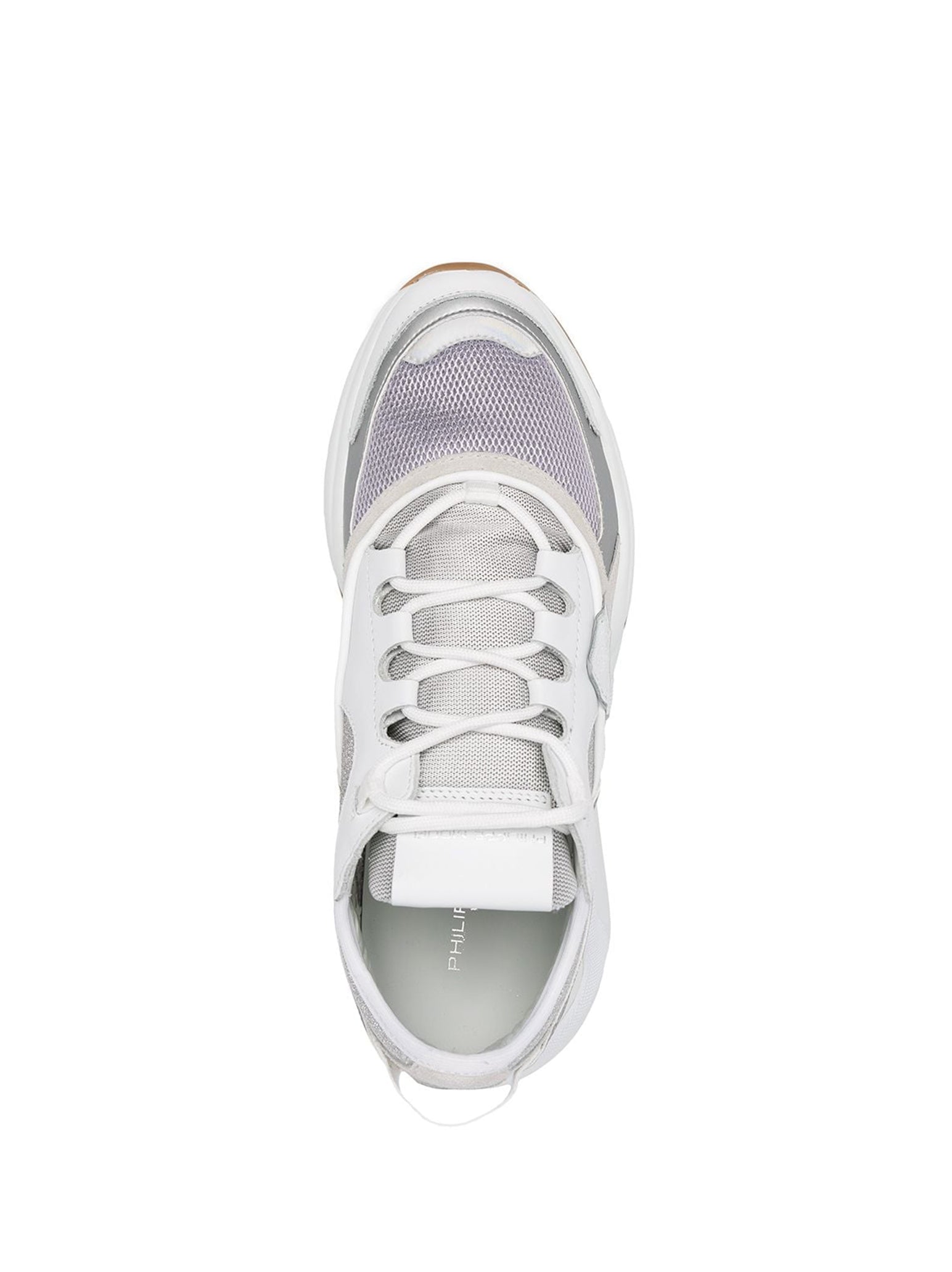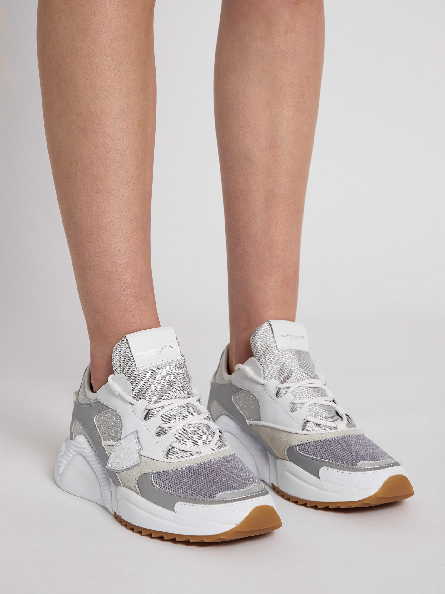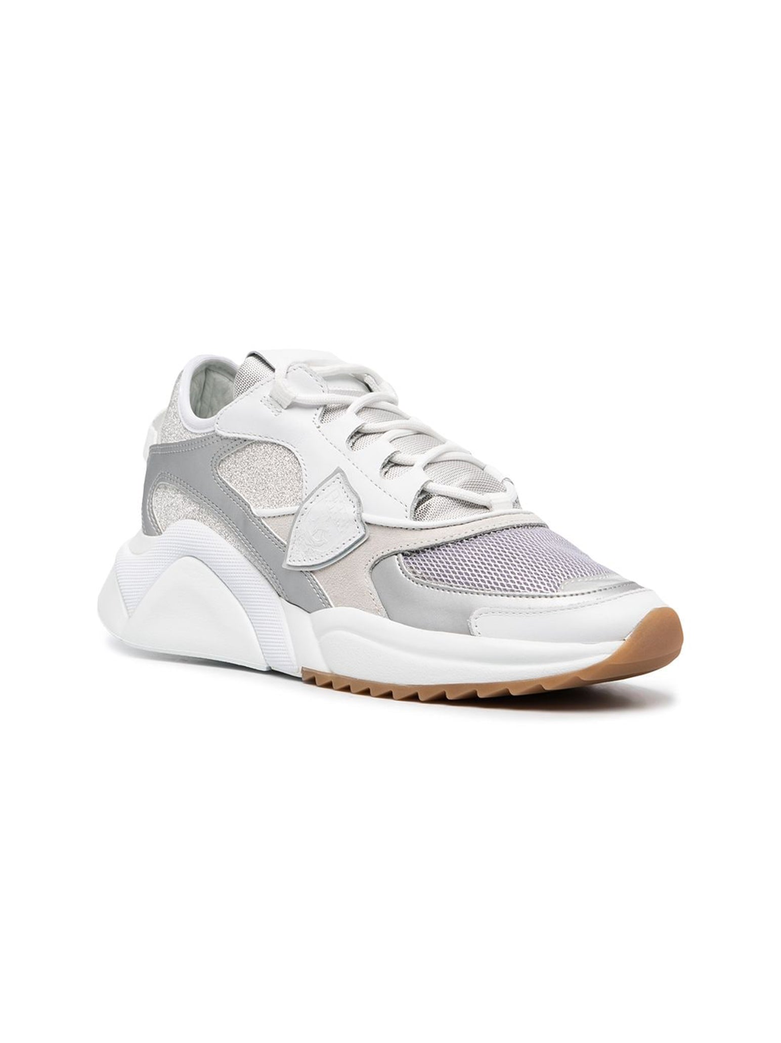 The Philippe Model Eze Sneaker in Glitter Argent is made from a leather and synthetic upper, leather inner and a rubber sole