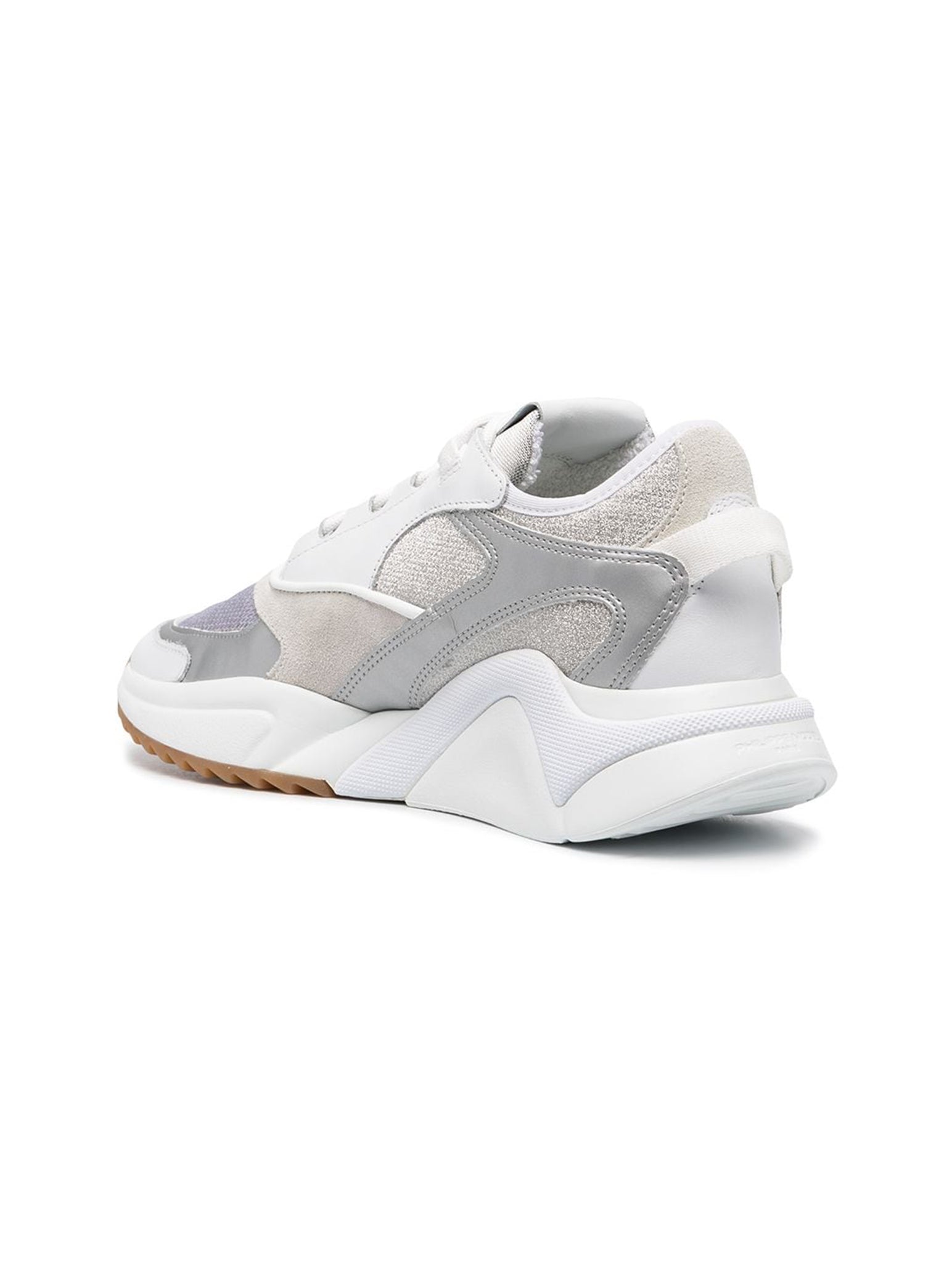 The chunky dad sneaker is reinvented in glitter and holographic leather cut away by Philippe Model. The Eze Sneaker in Glitter Argent is a must have staple piece for your go to denim looks this season. White and grey tones overlap across the shoe with a textural mesh toe, shining silver tongue and holographic details. The Eze sneaker features a pull on tab at the heel, and a cushioned platform midsole in a combination of fresh white and natural rubber sole. Dress down your evening wear or dress up your tracksuit with these fresh kicks.