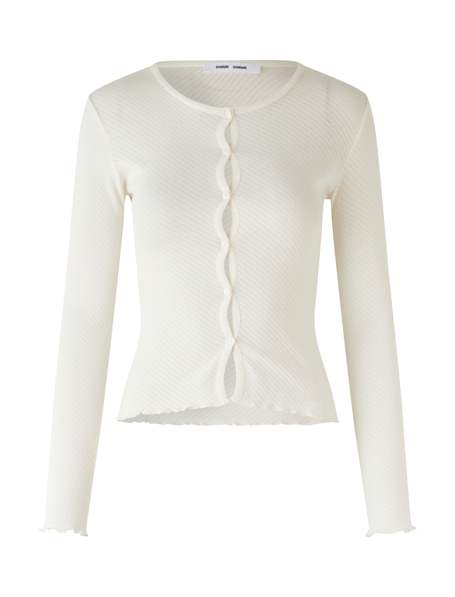We love the immaculate vibes from Samsoe Samsoe, an environmentally conscious and fashionably chic label. The Samsoe Samsoe Juni Cardigan in Pristine is the perfect example of this - made from 100% organic cotton, this product is GOTS certified and stunning. The slim fitting cardigan features a round neckline and edge to edge button fastening. With delicate overlocked frilled cuffs and hems, you can wear your values on your sleeve.