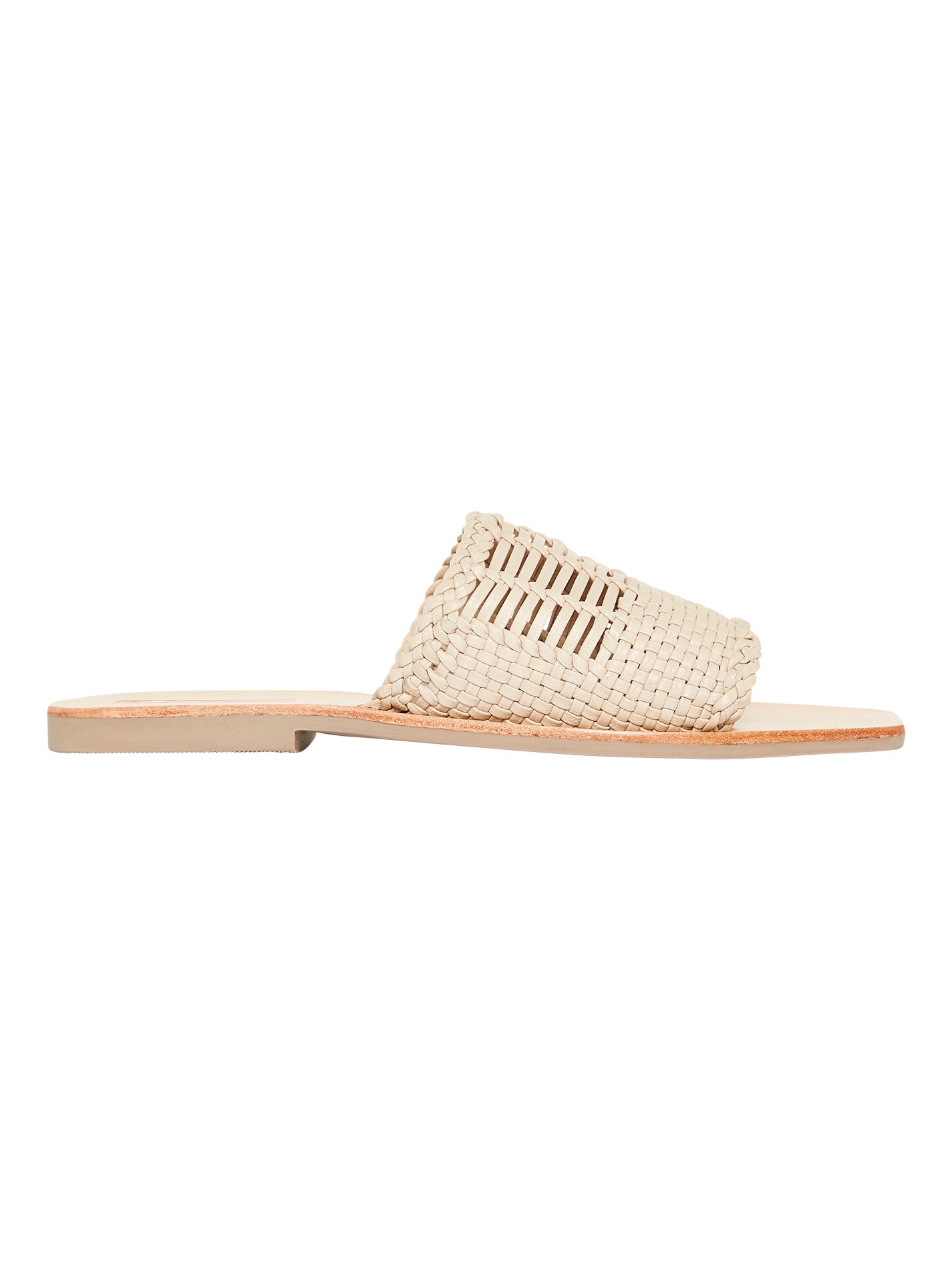 Get summer ready with the Sol Sana Megan Slide in Birch. Constructed from a basket weave leather, these open toed slides feature a wide fixed woven strap across the vamp and are finished with a modern square toe. Wear with a white cotton midi for easy off duty style.