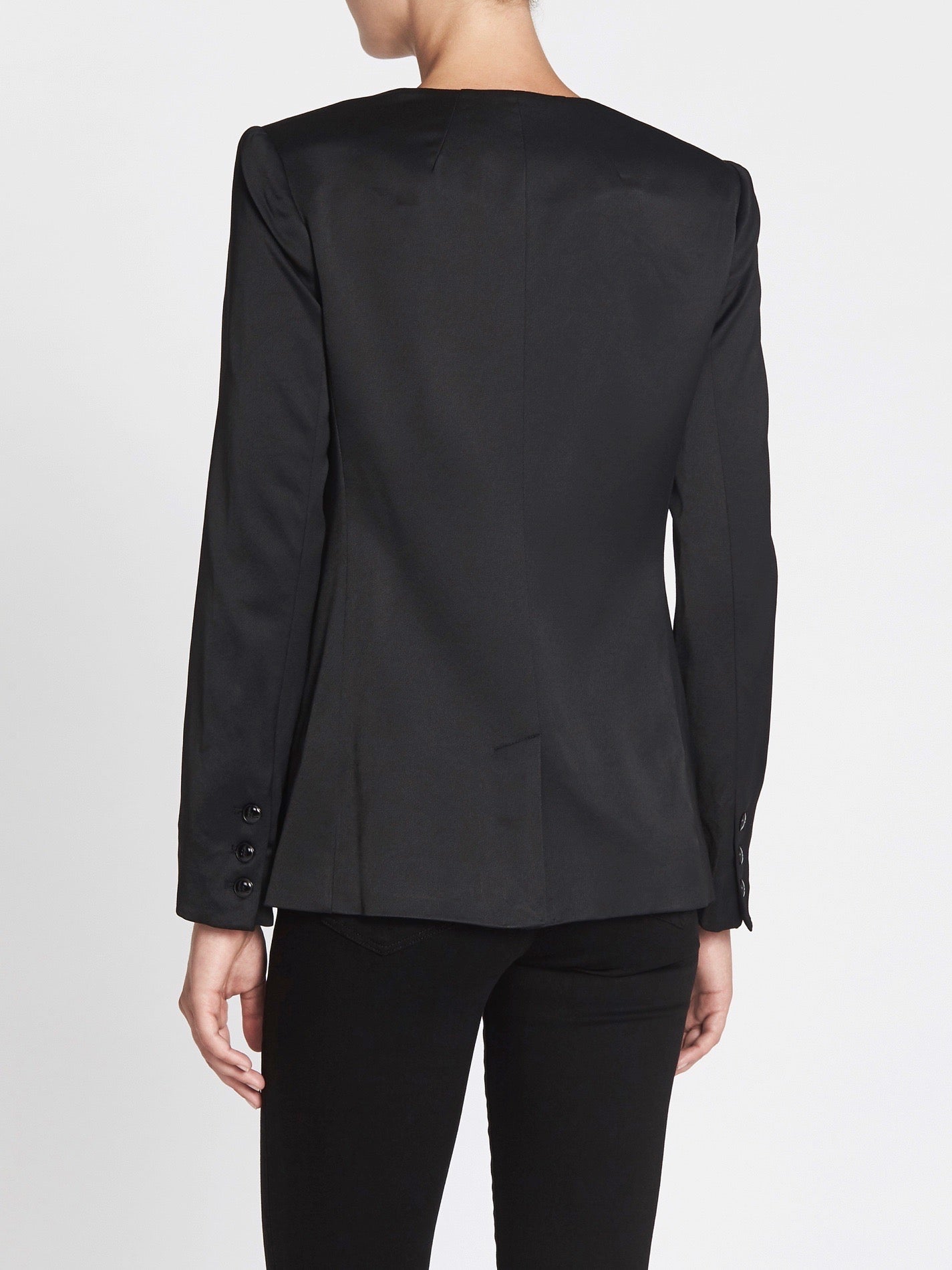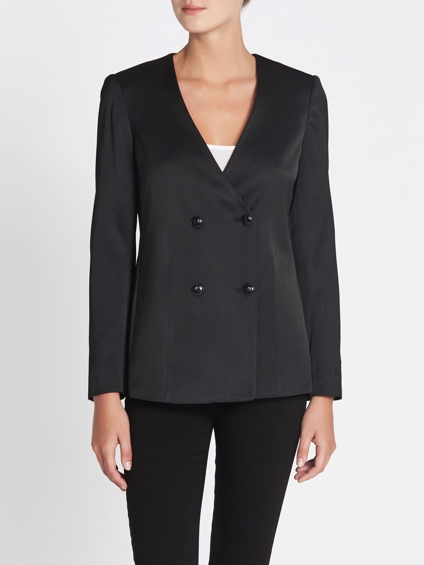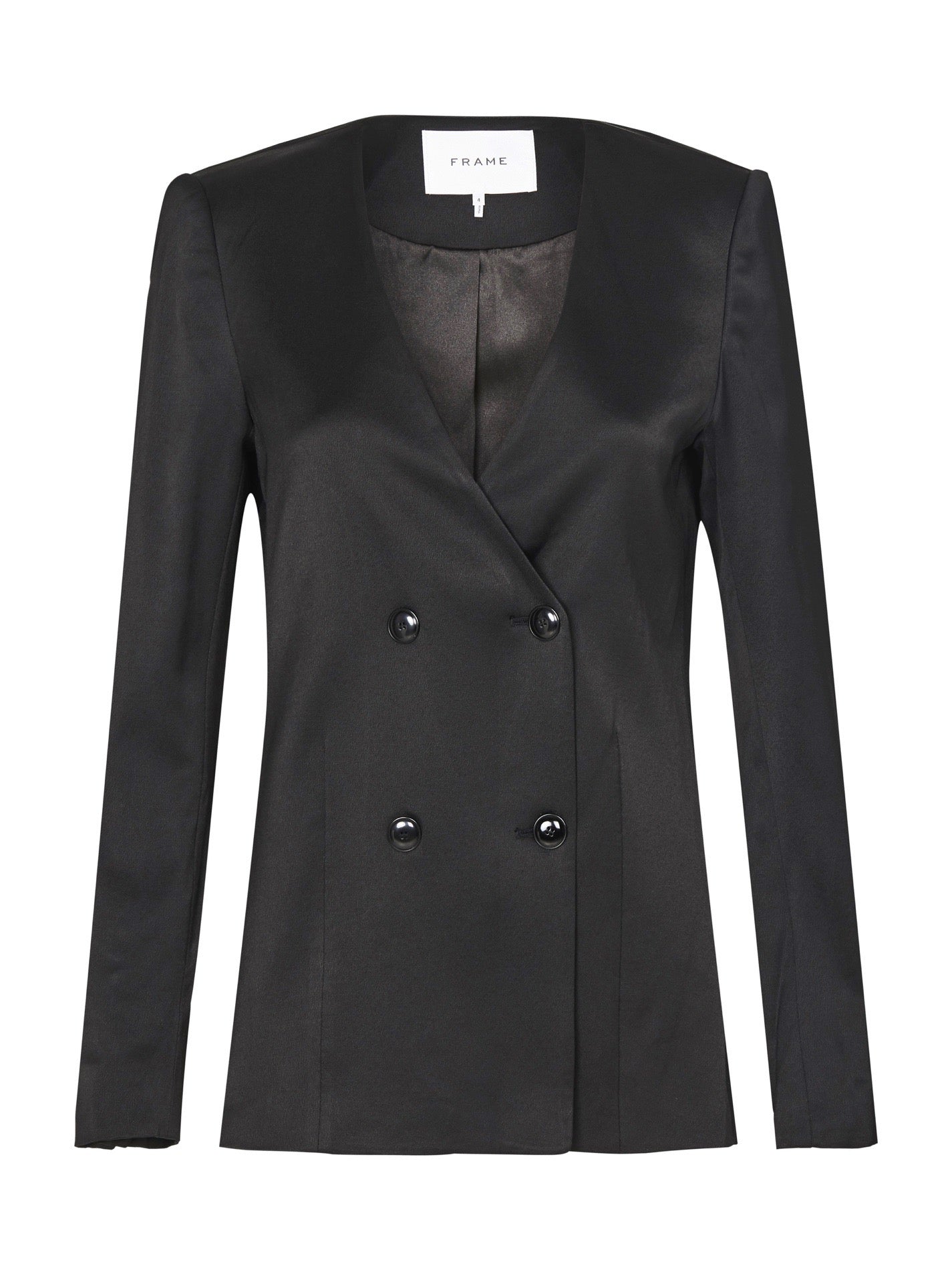 Dress to impress in the striking Frame Denim Double Breasted Jacket. This slick collarless V neck Style is a sophisticated reinvention of the classic blazer style. Featuring a slightly tapered fit in the body, a trio of buttons on the sleeve hem and single back vent; this style is fully lined.