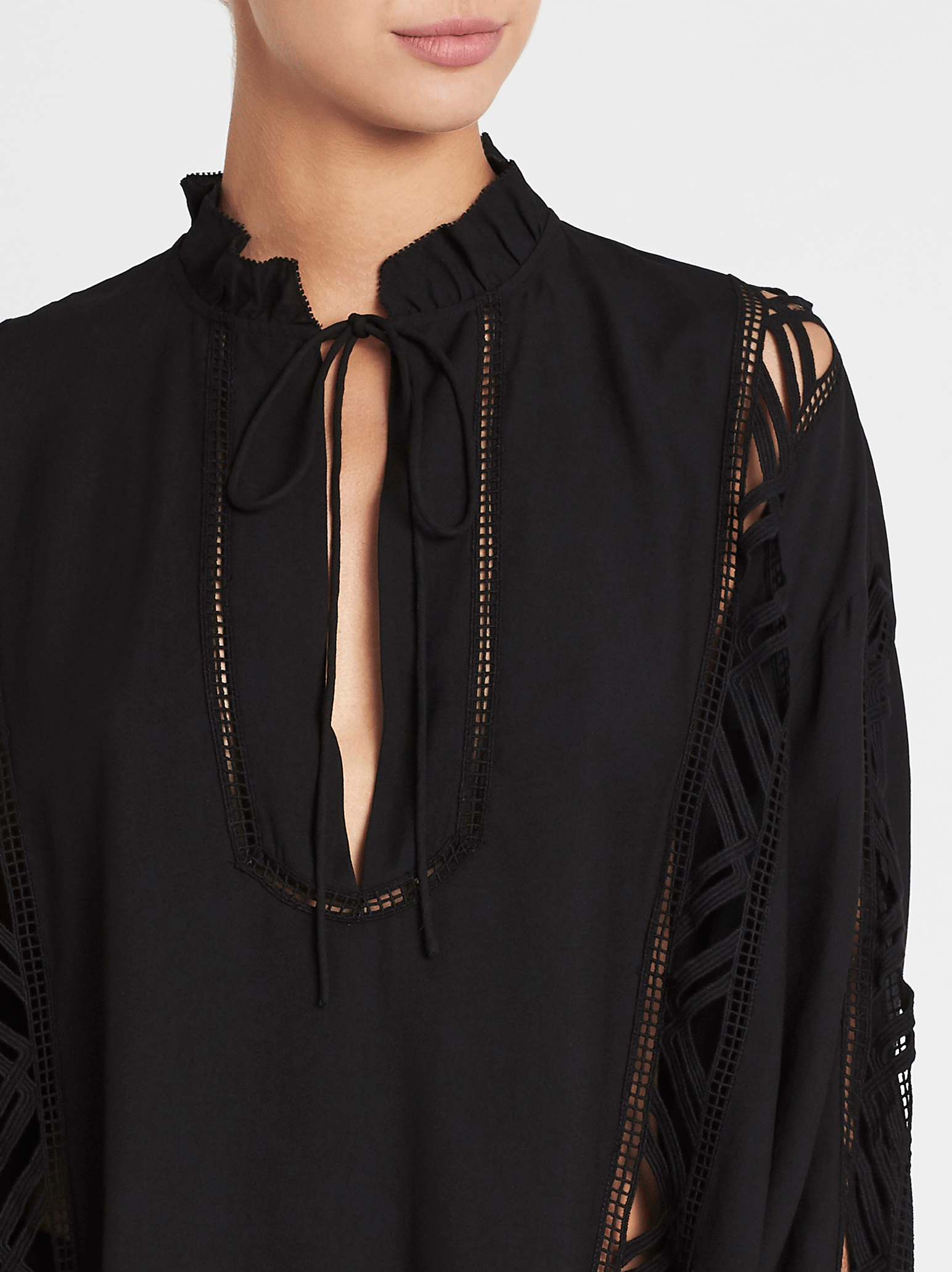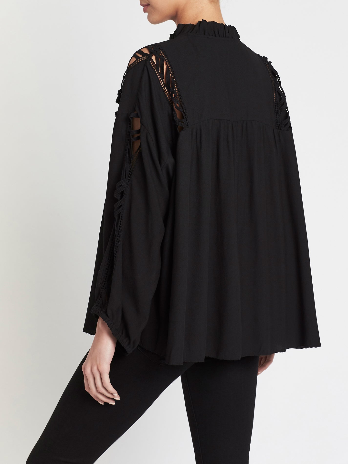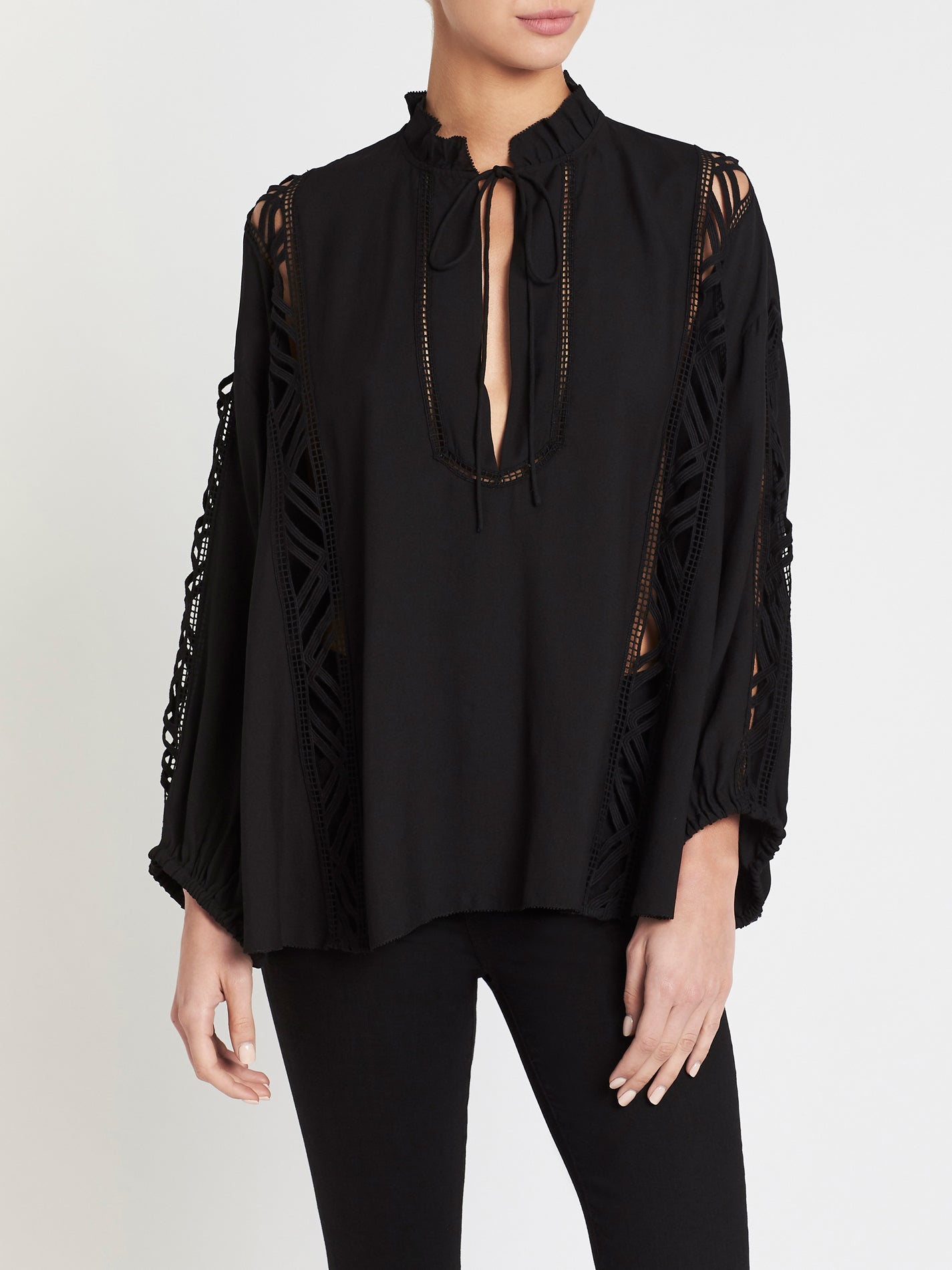 Black is the new black with the Felicia Top in Black by IRO. Constructed in a ultra soft polyester blend, this long sleeve blouse features a beautiful gathered neckline and necktie detail with a V-neck drop of 30cm. Finished with a feminine back yoke, elasticated sleeve cuffs and intricate cut out details, you will sure be dressed to impressed.