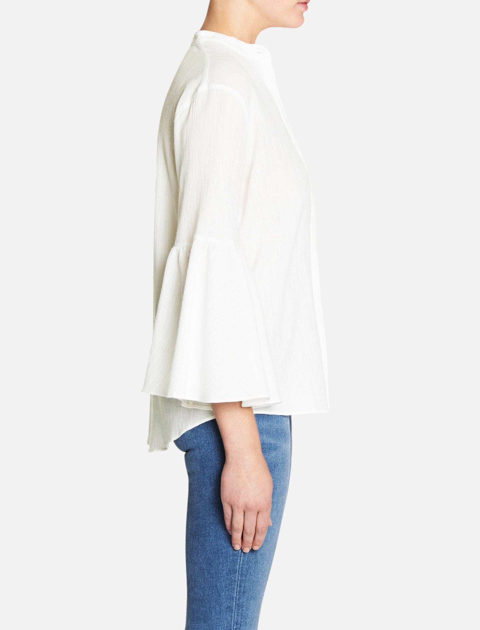 Constructed using a Japanese crinkle textured cotton, the M.I.H Jeans Goldie Shirt is a collarless straight fit style featuring dropped shoulders and circle cut sleeves giving the piece a soft, billowing romantic feel.