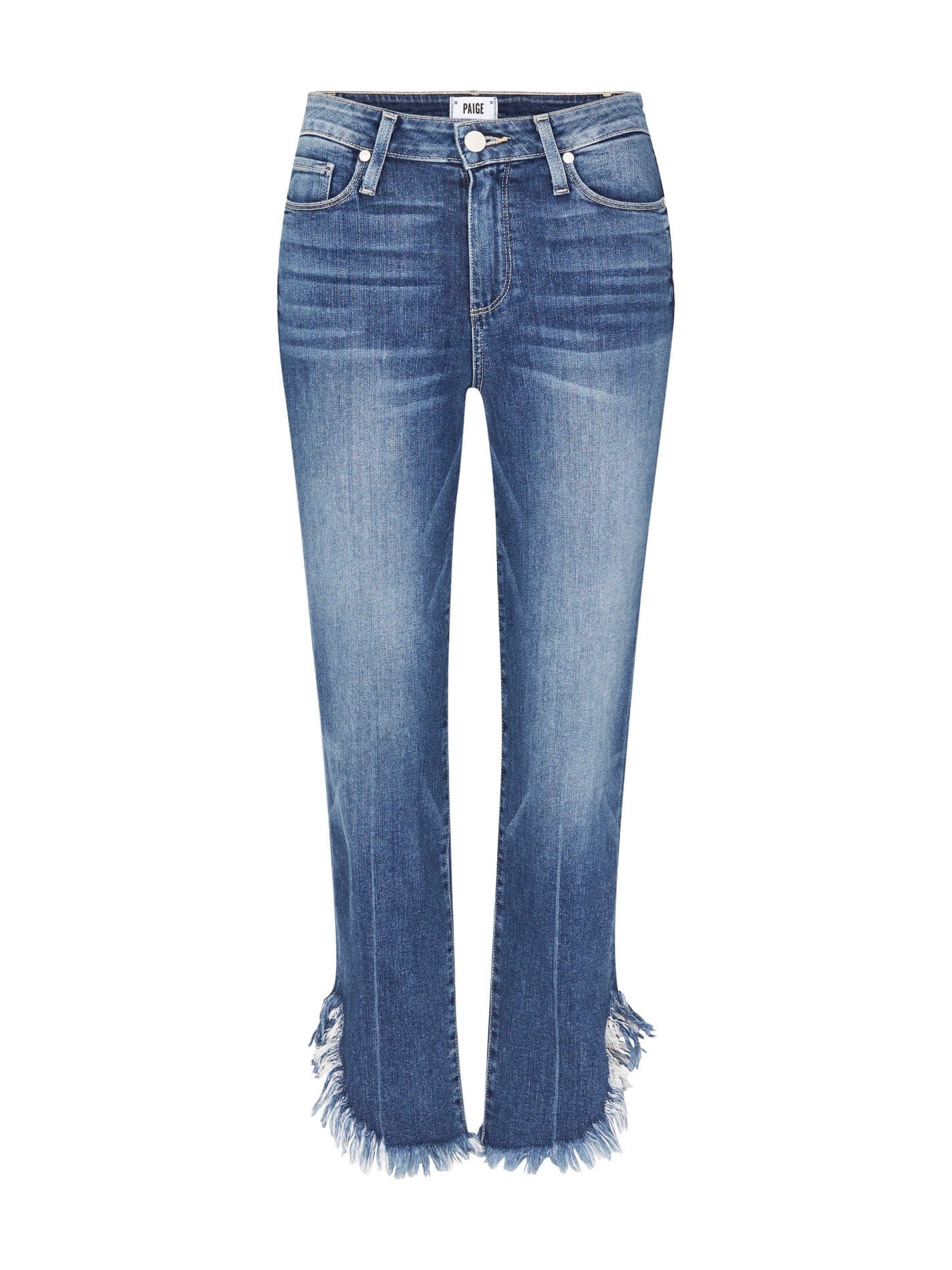 The Paige Hoxton Straight Ankle Jean in Norfolk are the perfect classic jeans with a cool girl twist to add to your wardrobe. Constructed from a cotton blend fabric these straight leg, high rise jeans feature a single button zip fly closure, matte off white hardware, subtle fading through the leg and are designed to have a cropped finish with a curved, frayed raw hemline.