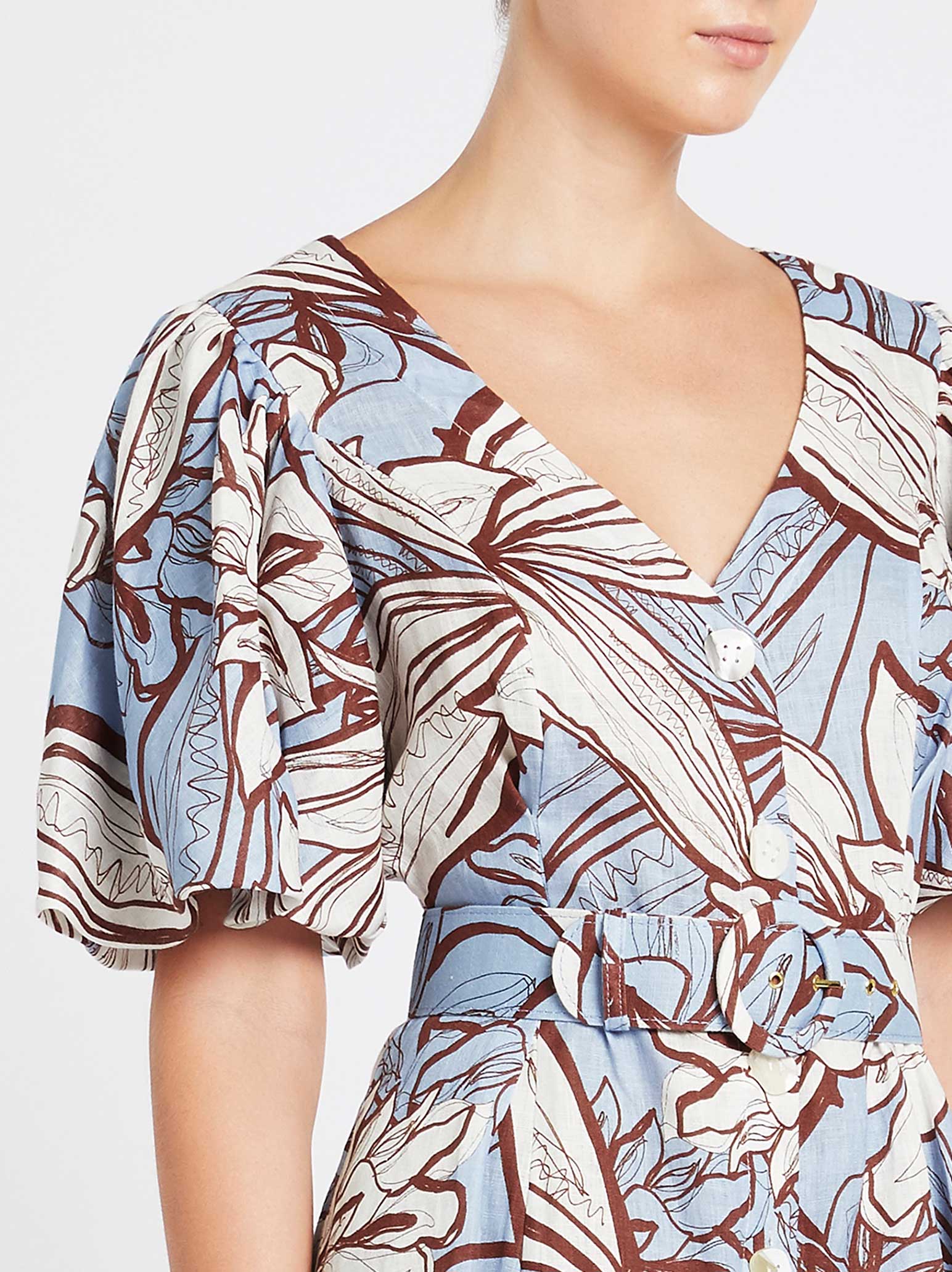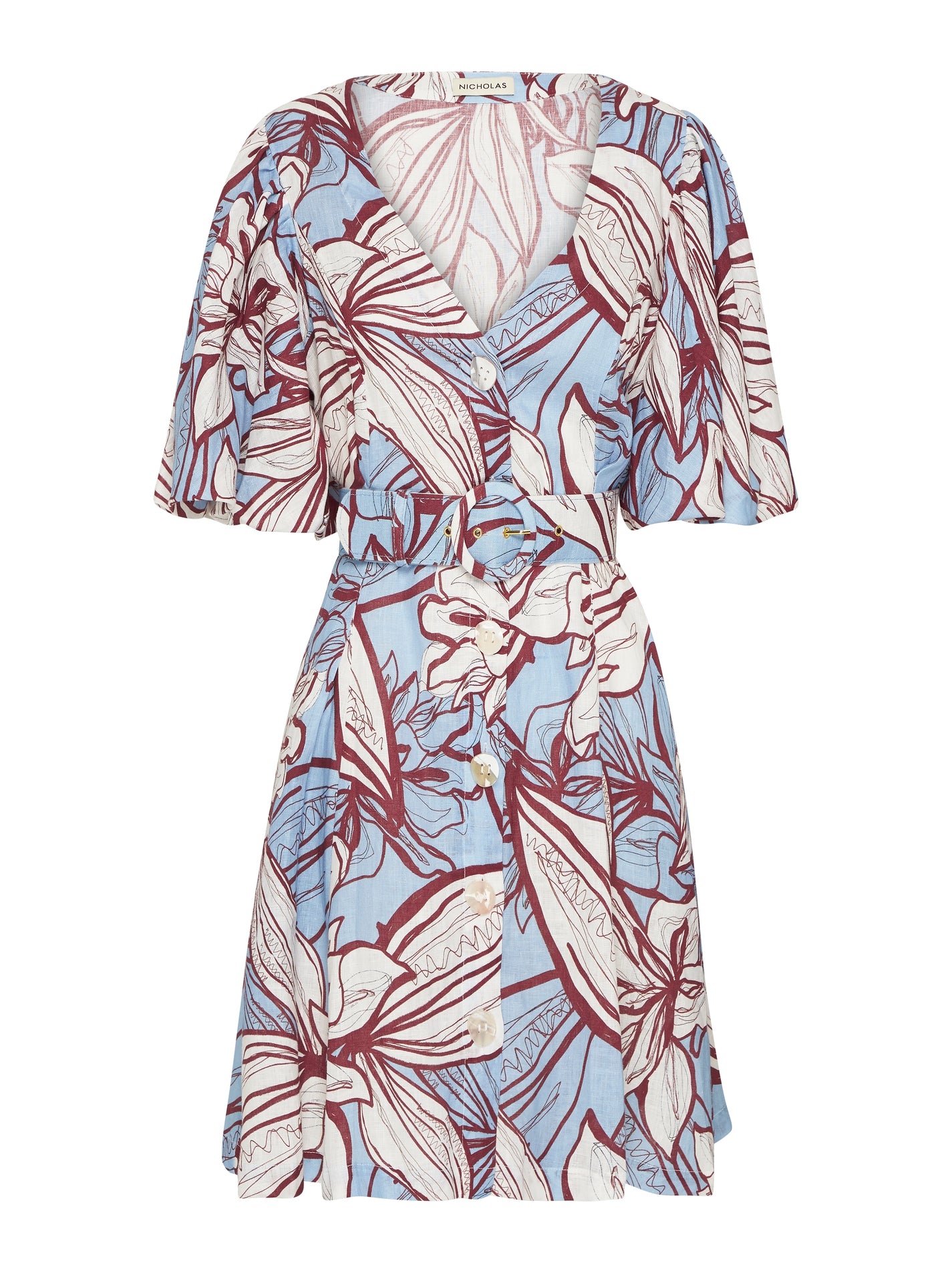 Wander through warmer and carefree days in the Linda Dress in Mocha Etched Floral by Nicholas. Constructed from linen this mini short sleeved dress features an abstract floral print, a deep v-neckline with belt and a button down style and is defined by its volume sleeve. Team with sneakers and a cross body bag for an ultimate vacation style. Learn moreThe Nicholas Linda Dress in Mocha Etched Floral is made from 100% Linen