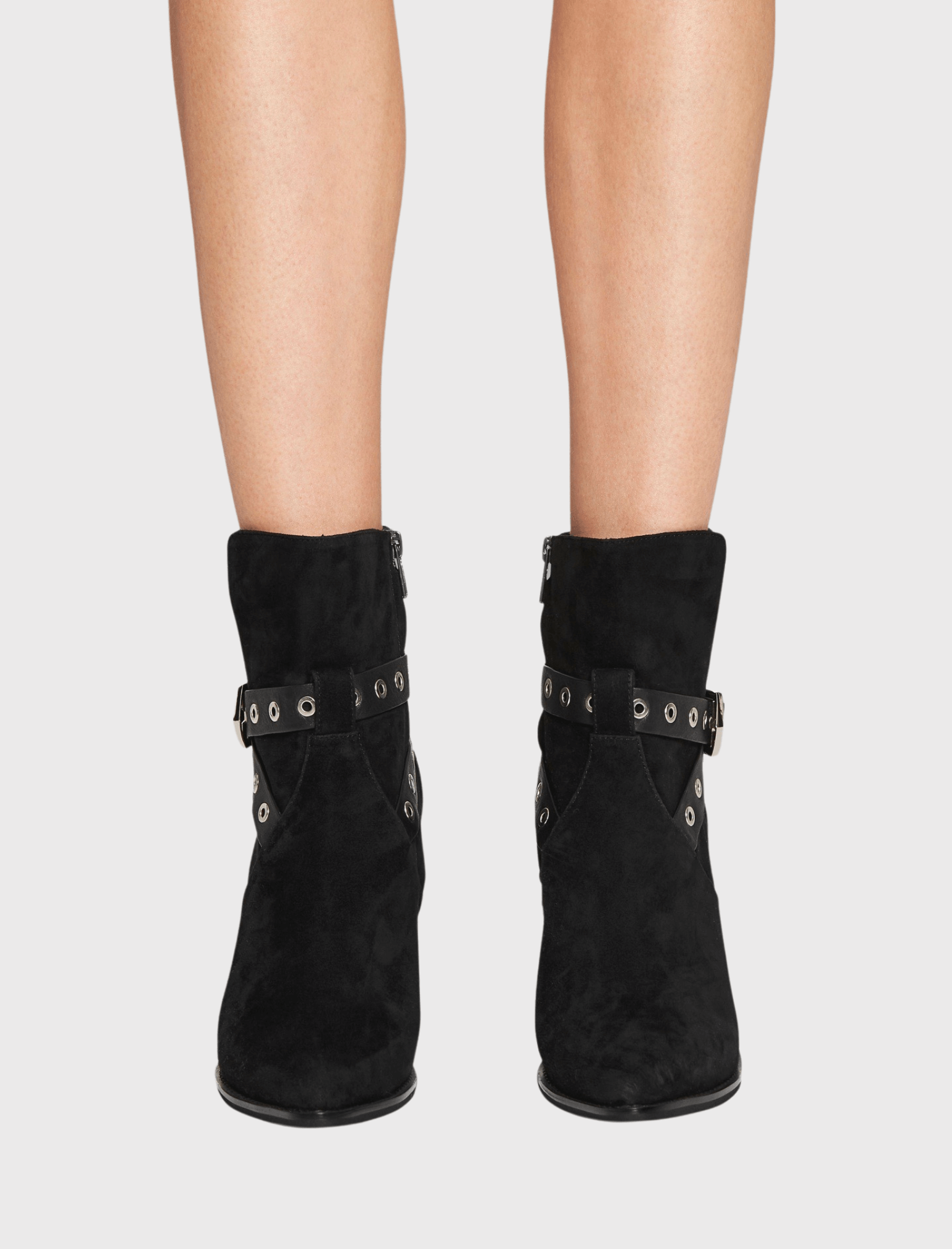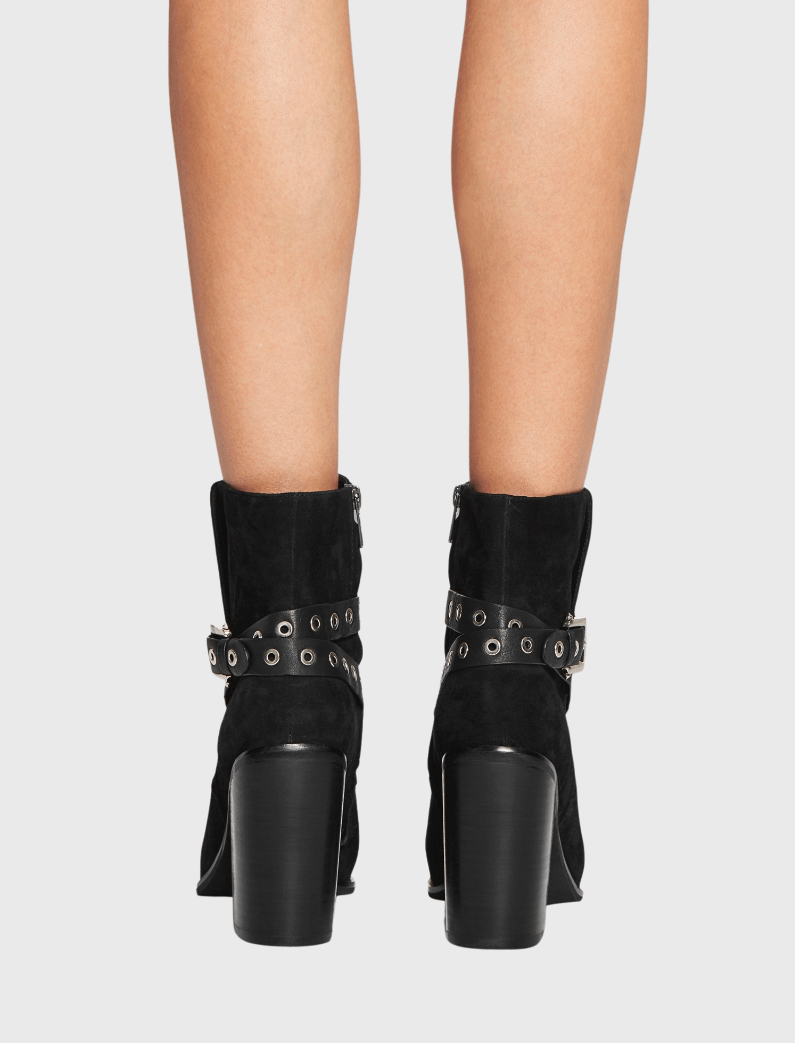 These moto inspired block heeled boots by Sol Sana are sure to add instant edge to any outfit. The Tessa Boot is made from luxurious black suede they are a tall ankle boot with an eyelet studded strap that wraps around the ankle.