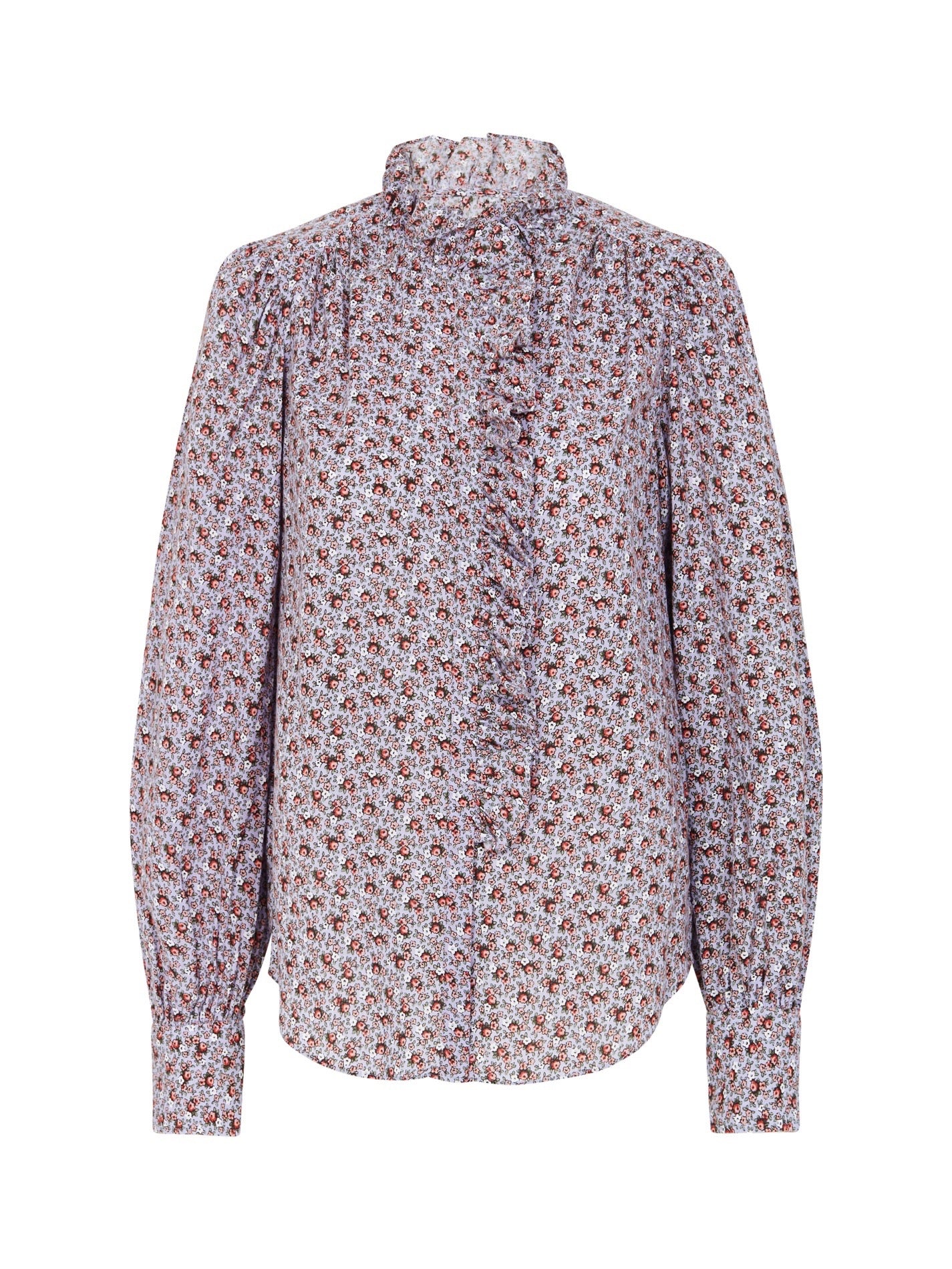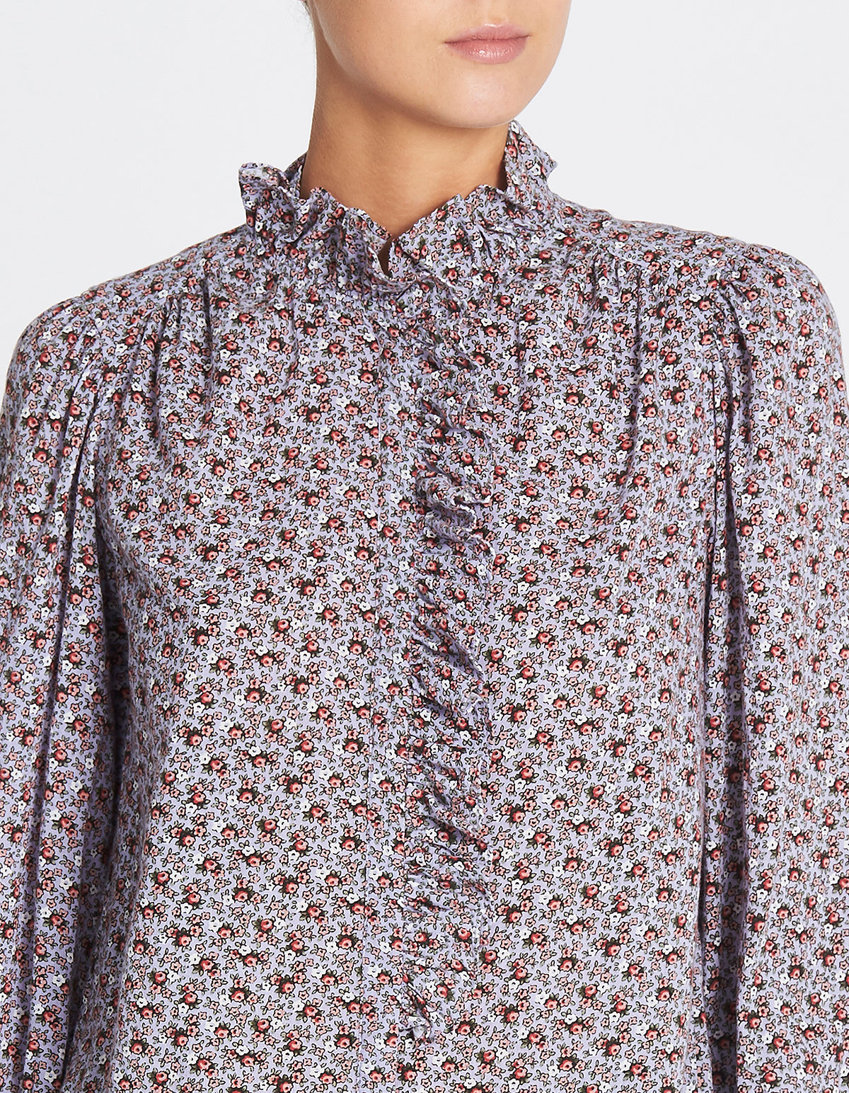 Add some flower power to your wardrobe with the Rebecca Taylor La Vie Nadia Fleur Top in Parma Violet Combo. Constructed from 100% cotton, this floral printed top features a ruffled neckline and front opening, gathered detailing along the shoulders, long sleeves with cuff finish, and a curved hemline.