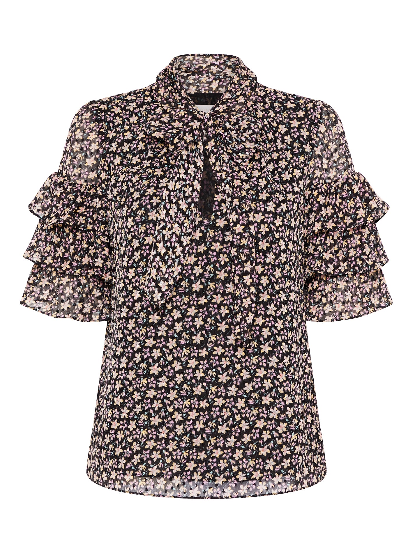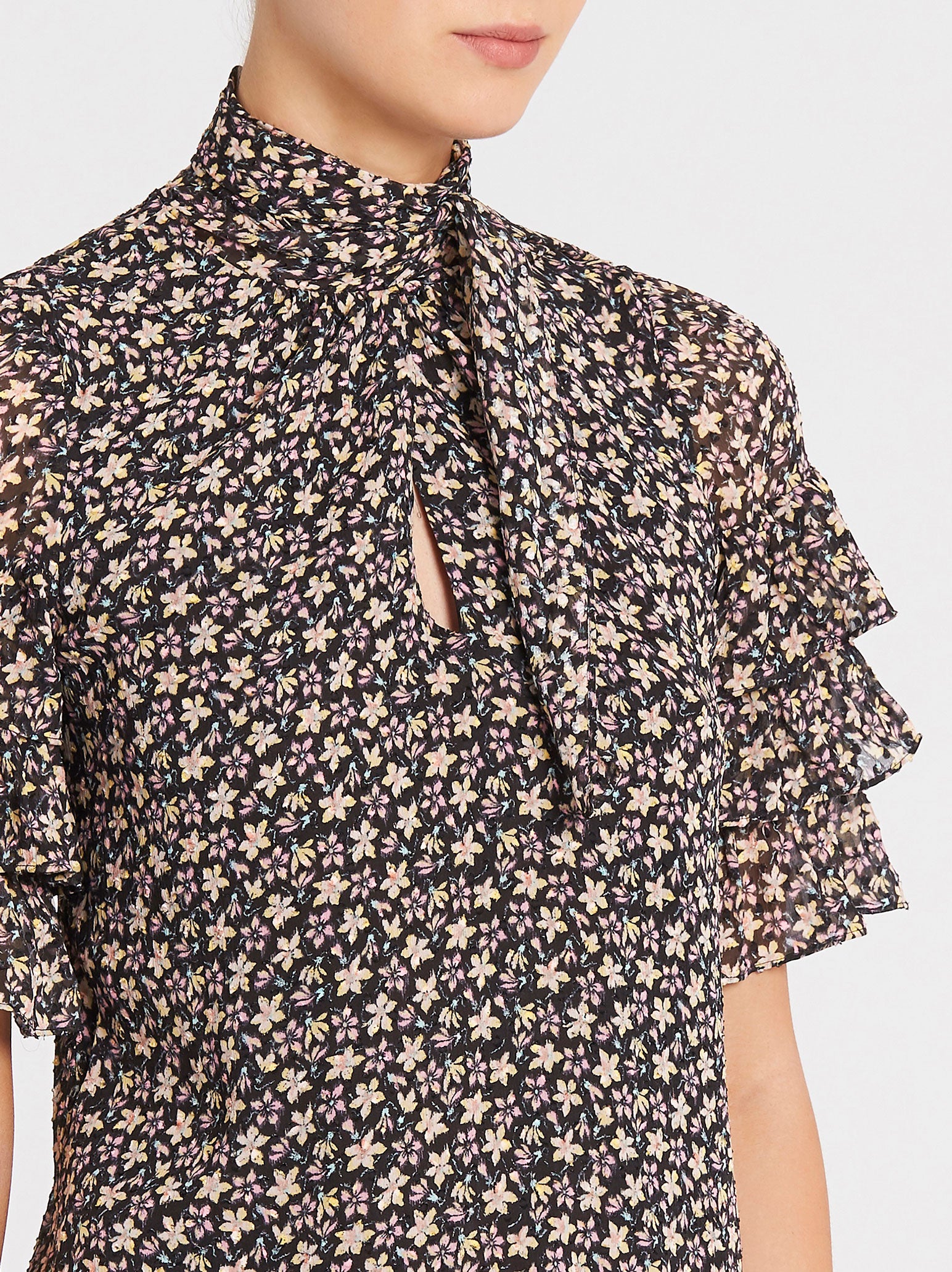 Add some delicate florals to your spring-drobe with the Rebecca Taylor Short Sleeve Louisa Ruffle Top in Yellow Combo. Constructed from a textural chiffon fabric with a delicate yellow floral print this piece features tiered ruffled sleeves and a high keyhole tie neckline which can be finished in a bow or draped open.