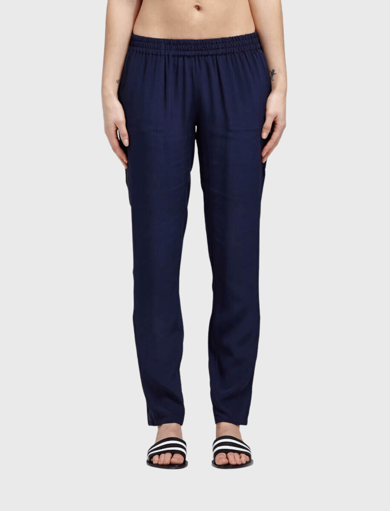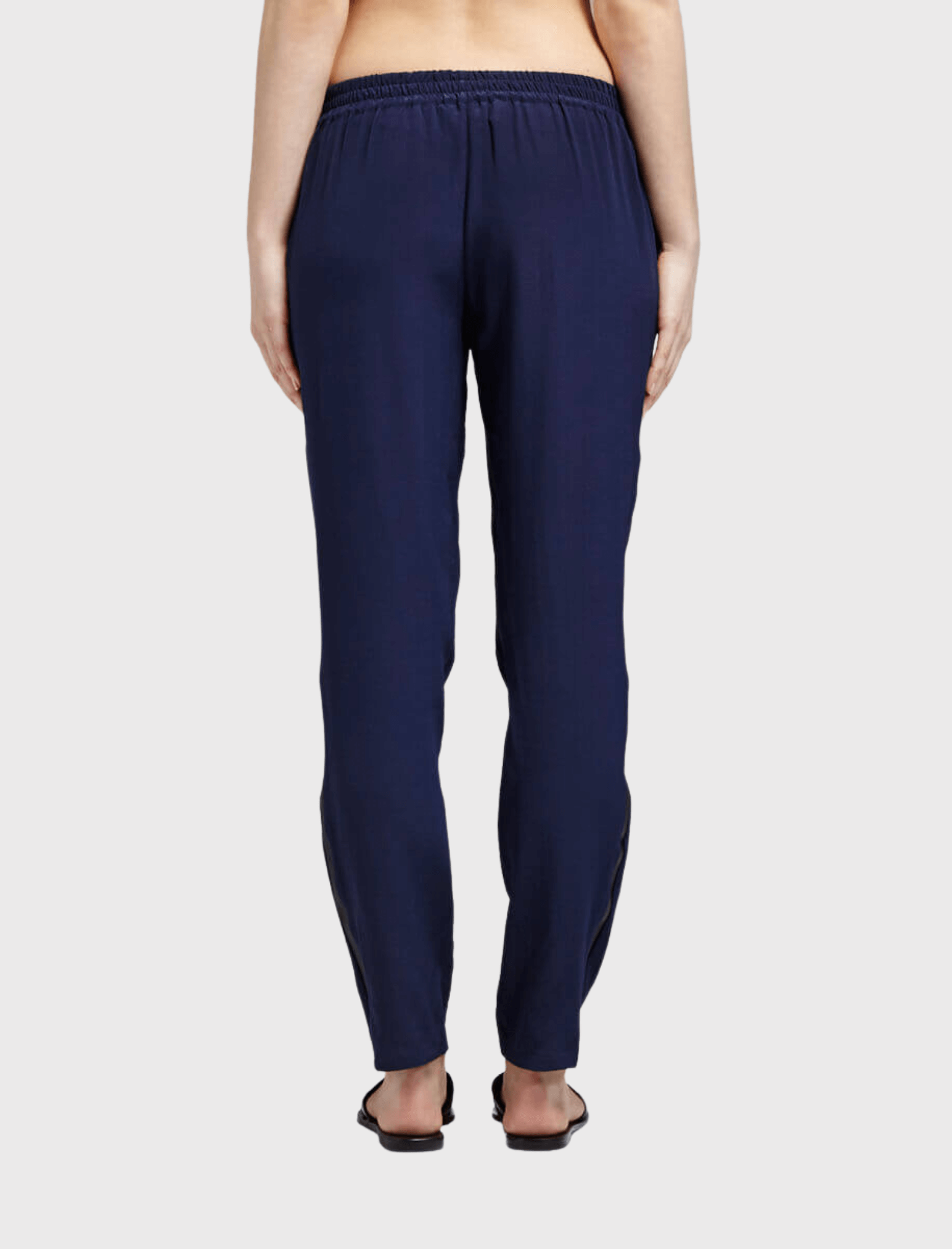 The Joie Julietta C Silk Side Zip Pant in Dark Navy / Caviar are made from 100% Silk