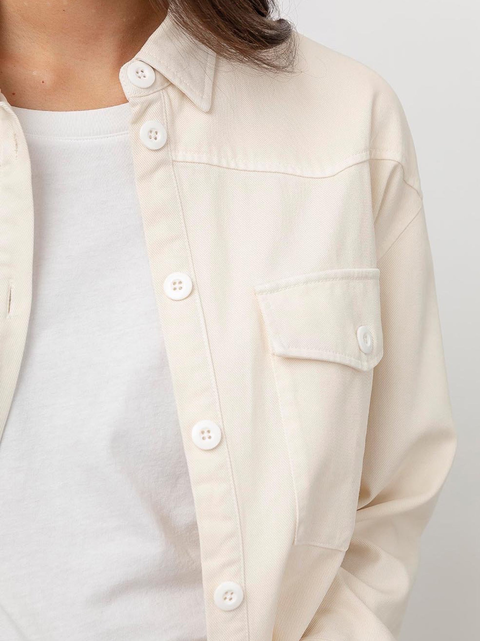 Throw on the August Shacket and get out the door. In the shade Ecru, this piece is a structured twill denim button down shirt jacket with a natural ivory collar and designed for an oversized fit it features a western detail on the yoke details with oversized military patch pockets at chest. This piece will be your new go-to for every outfit, perfect for those cooler nights styled over your favourite summer dress.