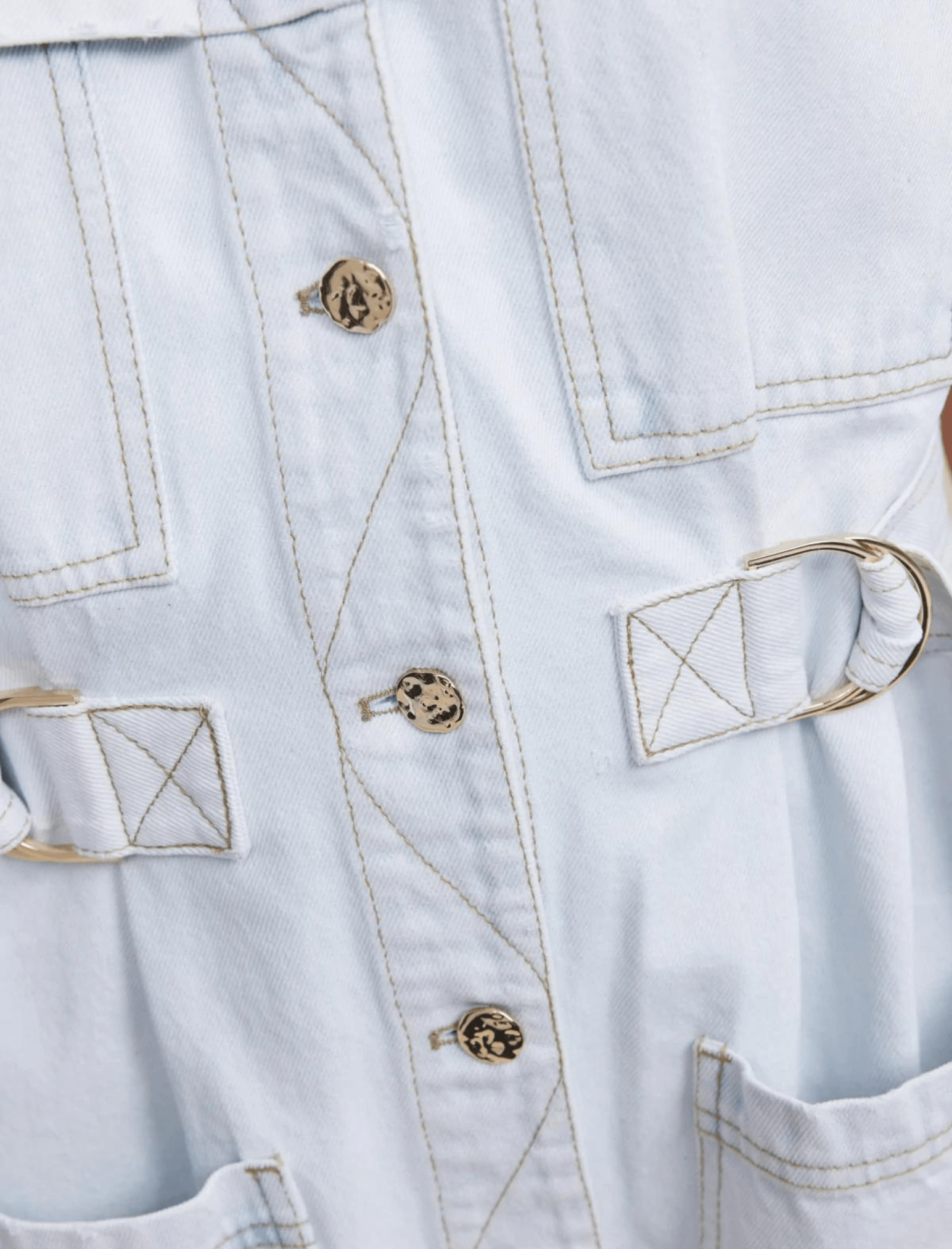 An easy day to night style that will carry you through the summer and into Autumn. The Holmes Dress in Cloud Blue is a shirt dress inspired style features a high neck, elbow length sleeves, twin pockets on the chest and hips. The style has an adjustable waistband with D ring closure and shining gold buttons. Constructed from a light wash cotton it has contrast stitching and a curved skirt hem.
