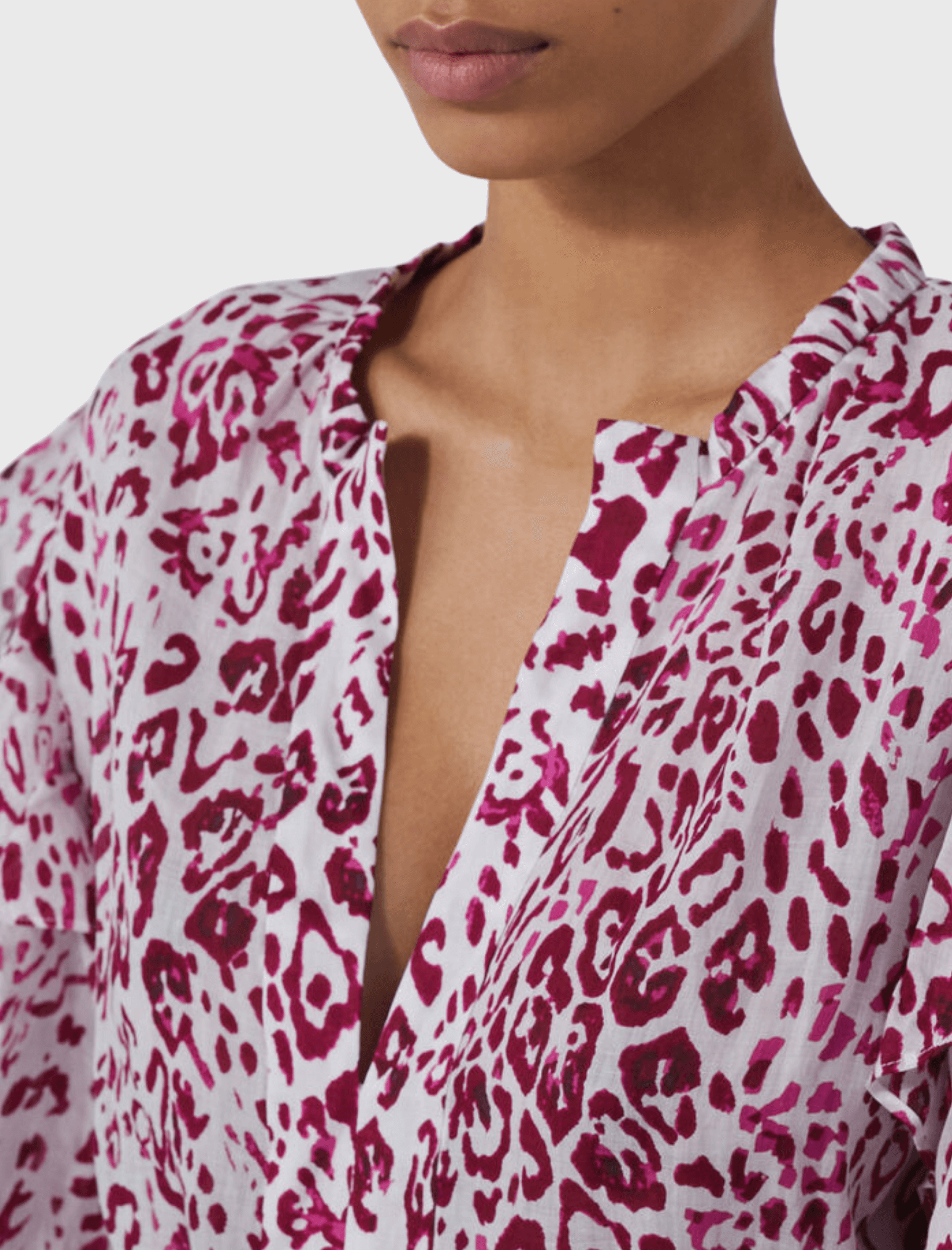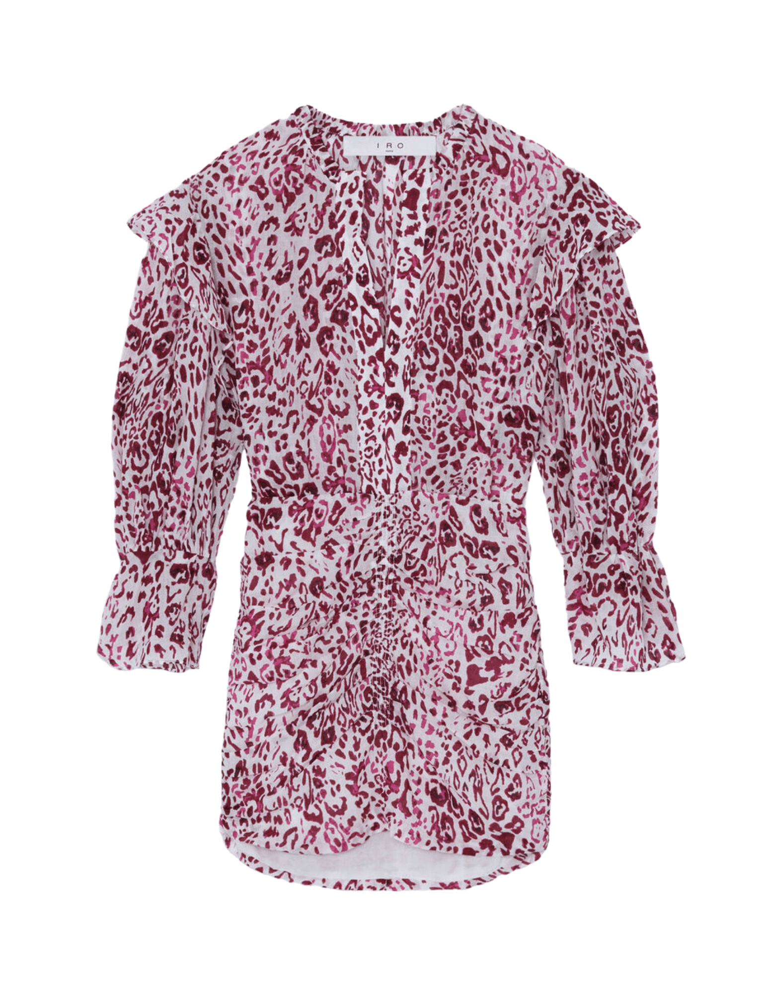 The IRO Gira Dress in a leopard inspired White Pink print is a whimsical piece perfect for a European get away. This long sleeved mini dress is made from a delicate light weight gauzy fabric, perfect for balmy nights. The skirt of the dress is fitted and ruched for a fit close to the body, while the top blouses out. Featuring delicate ruffles on the shoulders, a wide sleeve and an open décolletage.