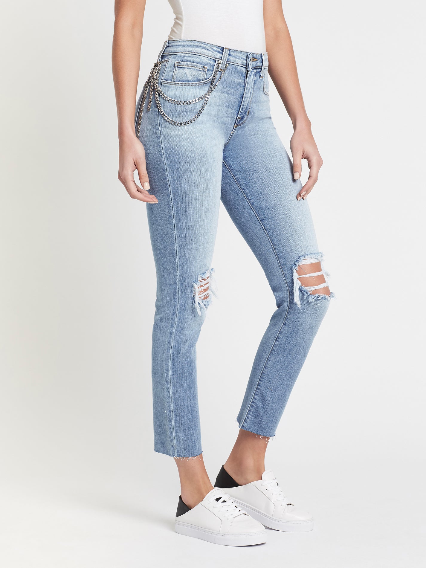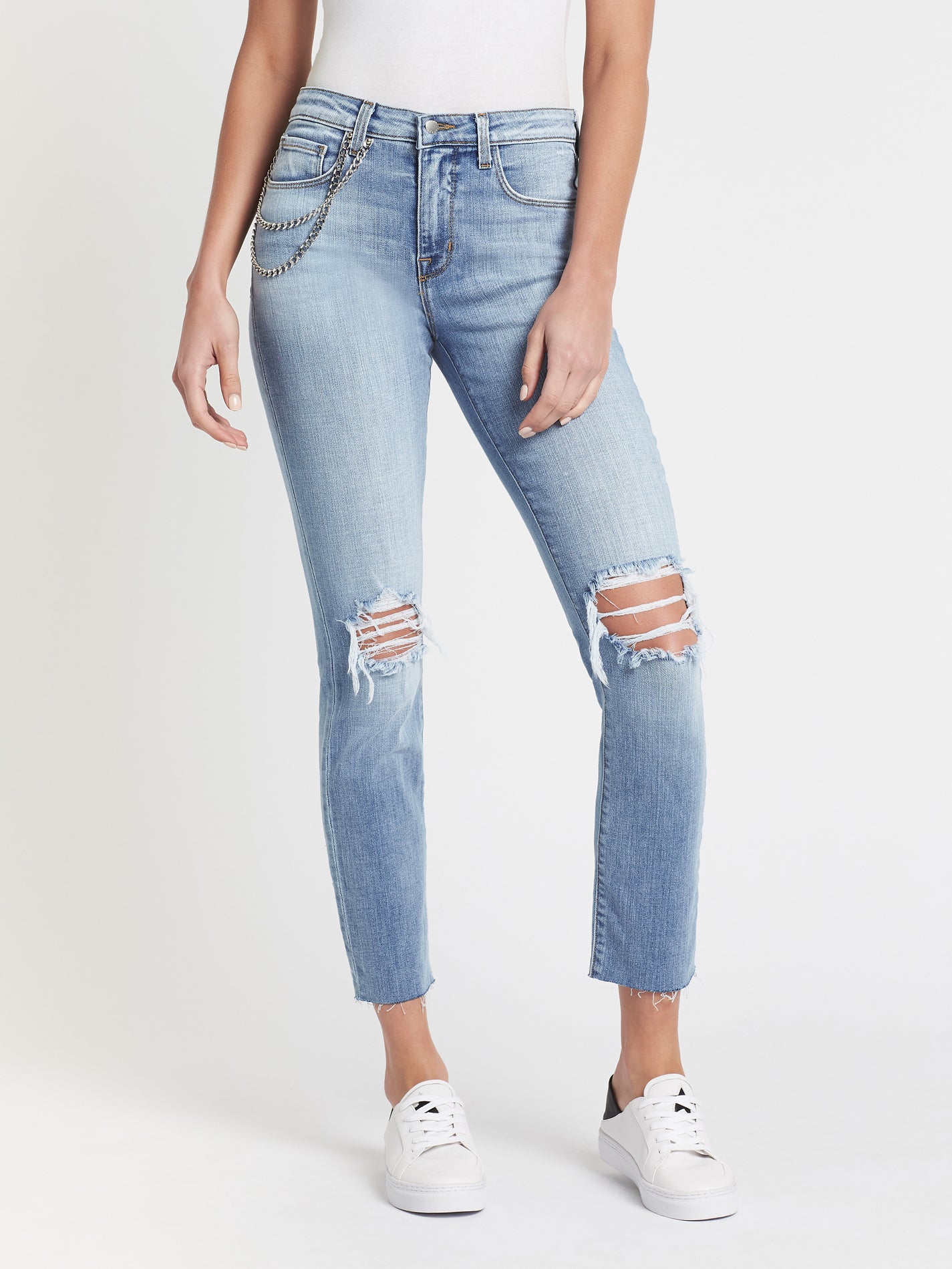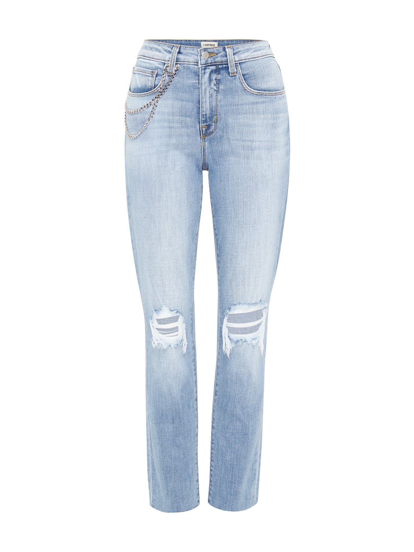 Step out in rocking style with the Luna High Rise Jean in Sedona by L'agence. Constructed in a classic premium denim, this slim fit jean features a light indigo wash with subtle whiskering through the leg, a double chain detail which drapes to one side and duel front and back pockets. Finished with destructed knees, a single zip fly closure with silver metal hardware detailing and a raw hemline for the ultimate elevated edge to your weekend style.