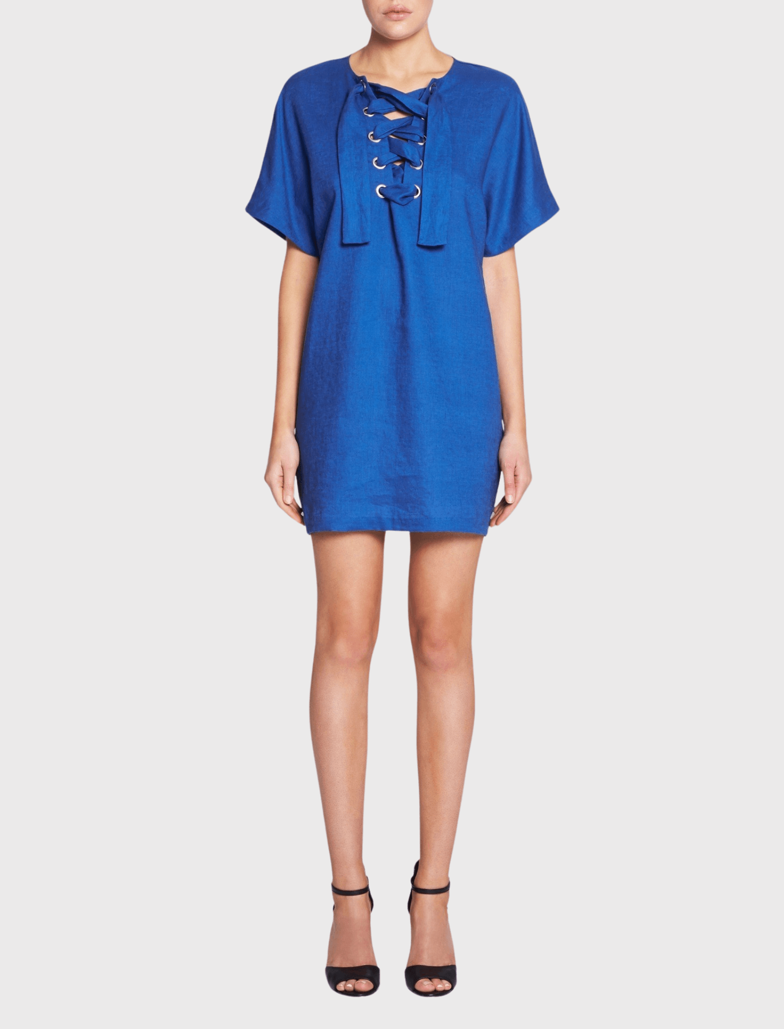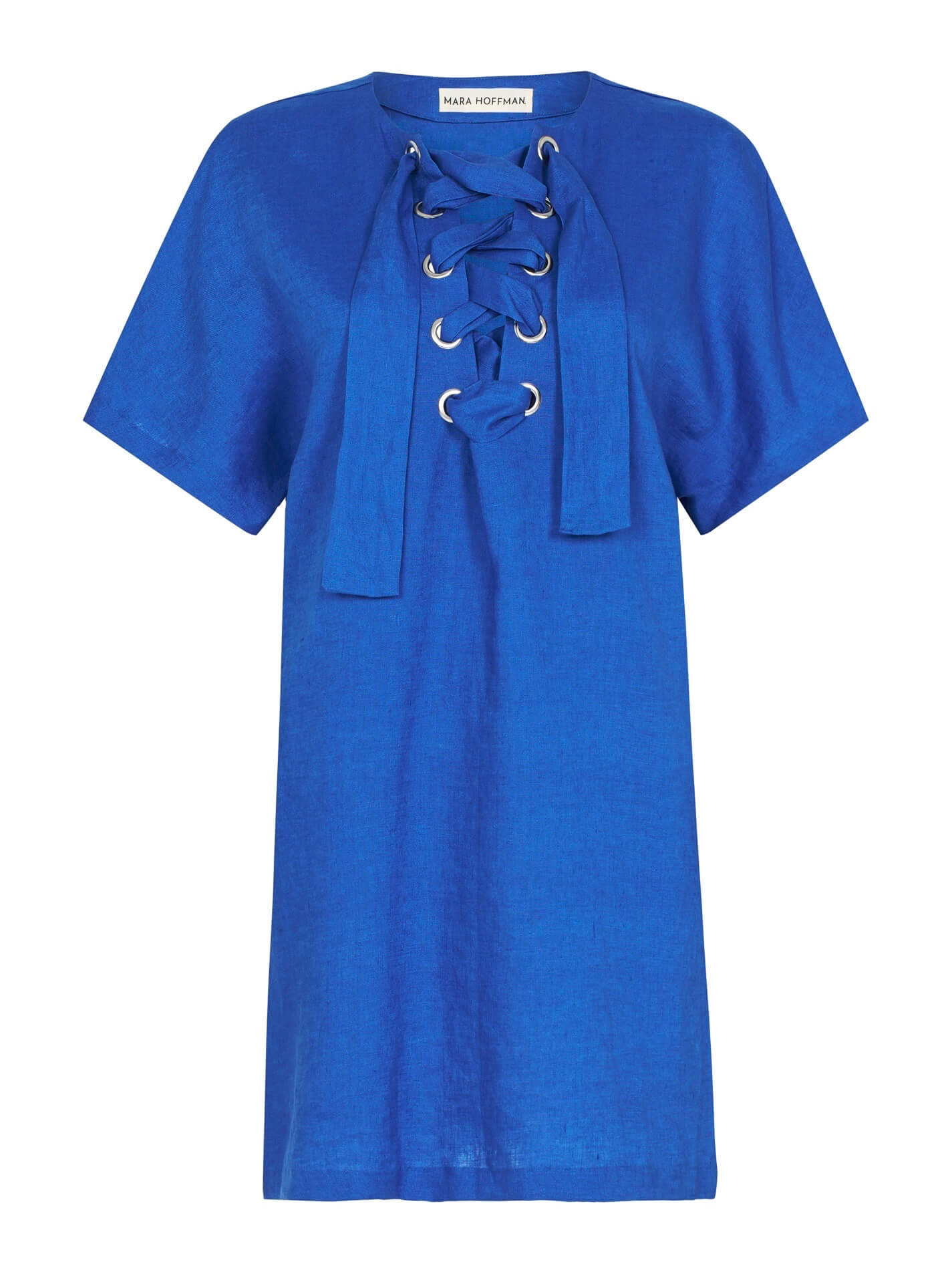 The Mara Hoffman Lace Up Mini Dress in Cobalt is made from 100% Linen