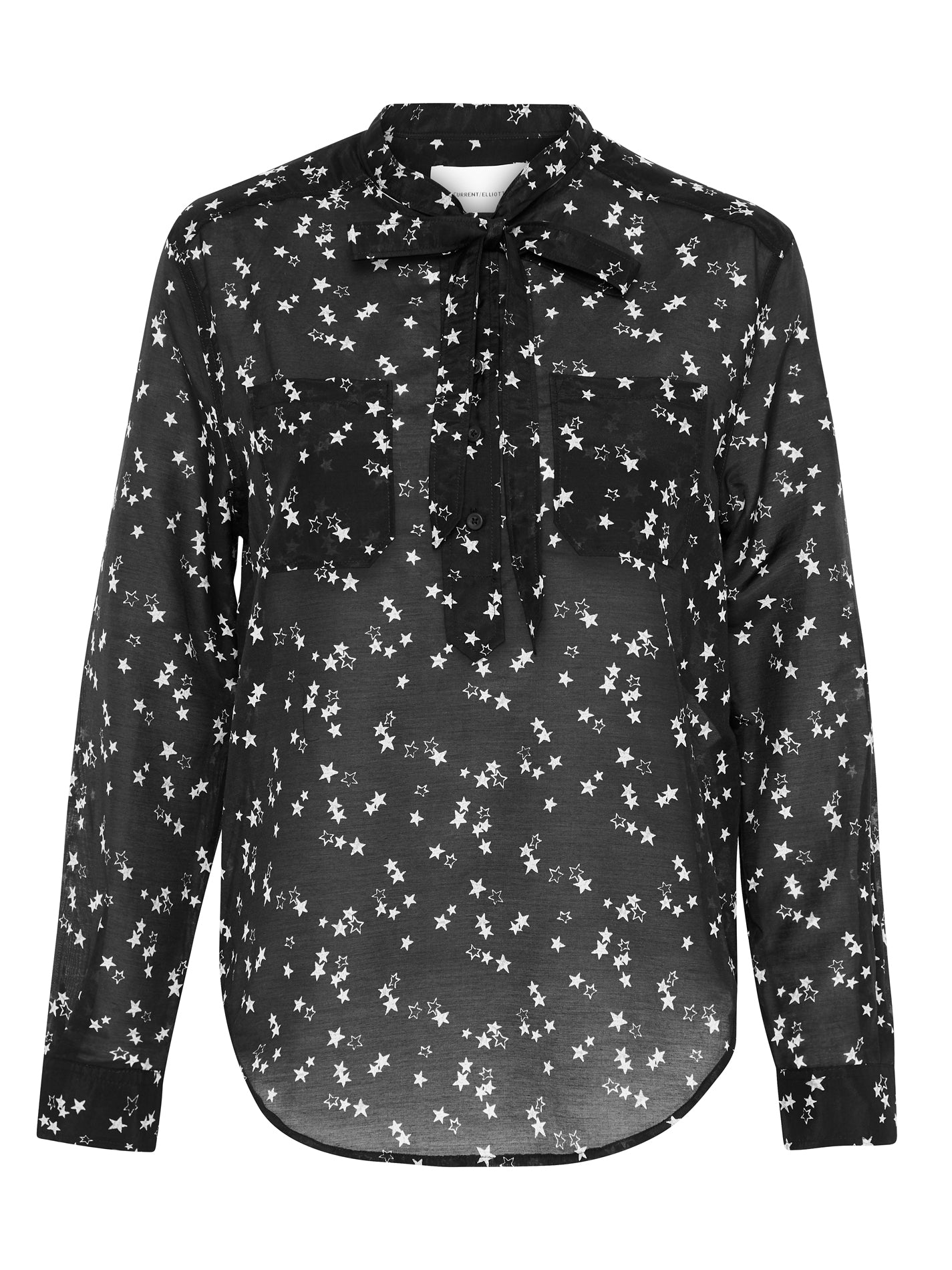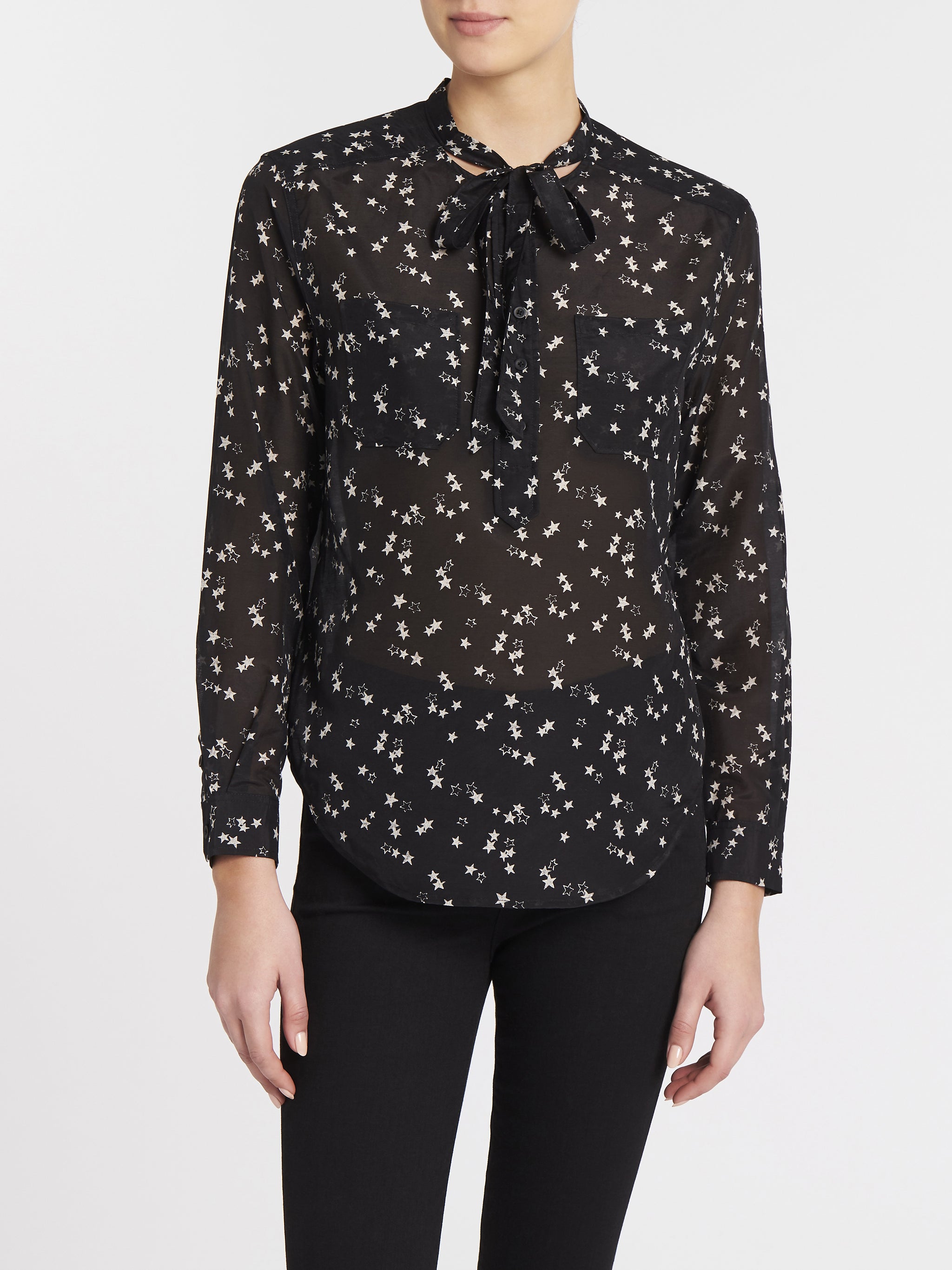 Evoke sophisticated femininity with The Darling Lili Tie Blouse in Star by Current Elliott. Crafted from an ultra soft cotton silk blend this pussy bow necktie blouse features a delicate star print, long sleeves, button down placket, duel breast pockets and is finished with a curved hemline perfect for layering. Team back with a flare denim jean for an effortless done up weekend look.
