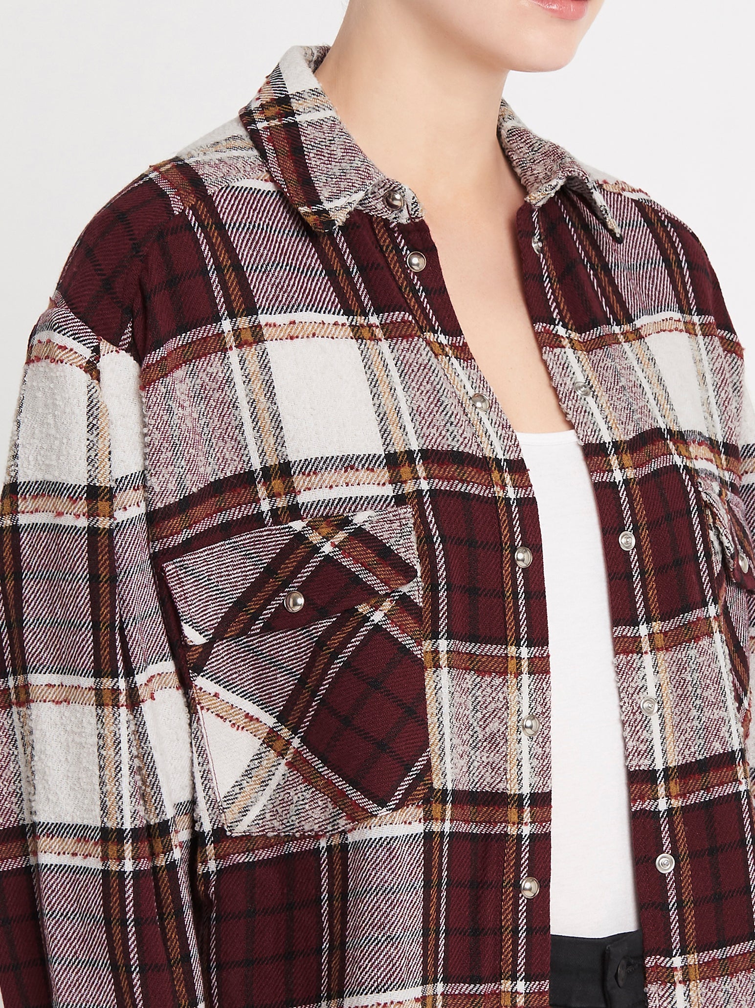 Look like a chic farmer in those clothes with the IRO Hatik Shirt in Red Multico. This soft flannel style showcases a gorgeous burgundy, caramel and cream tartan pattern. Featuring pleated details on the long sleeves, a slightly puffed shoulder, twin chest pockets and snap buttons on the front and cuffs. Finished with a curved raw hem this shirt can be worn open and thrown over a tee or buttoned and tucked into some black high waisted pants for a country cool vibe.