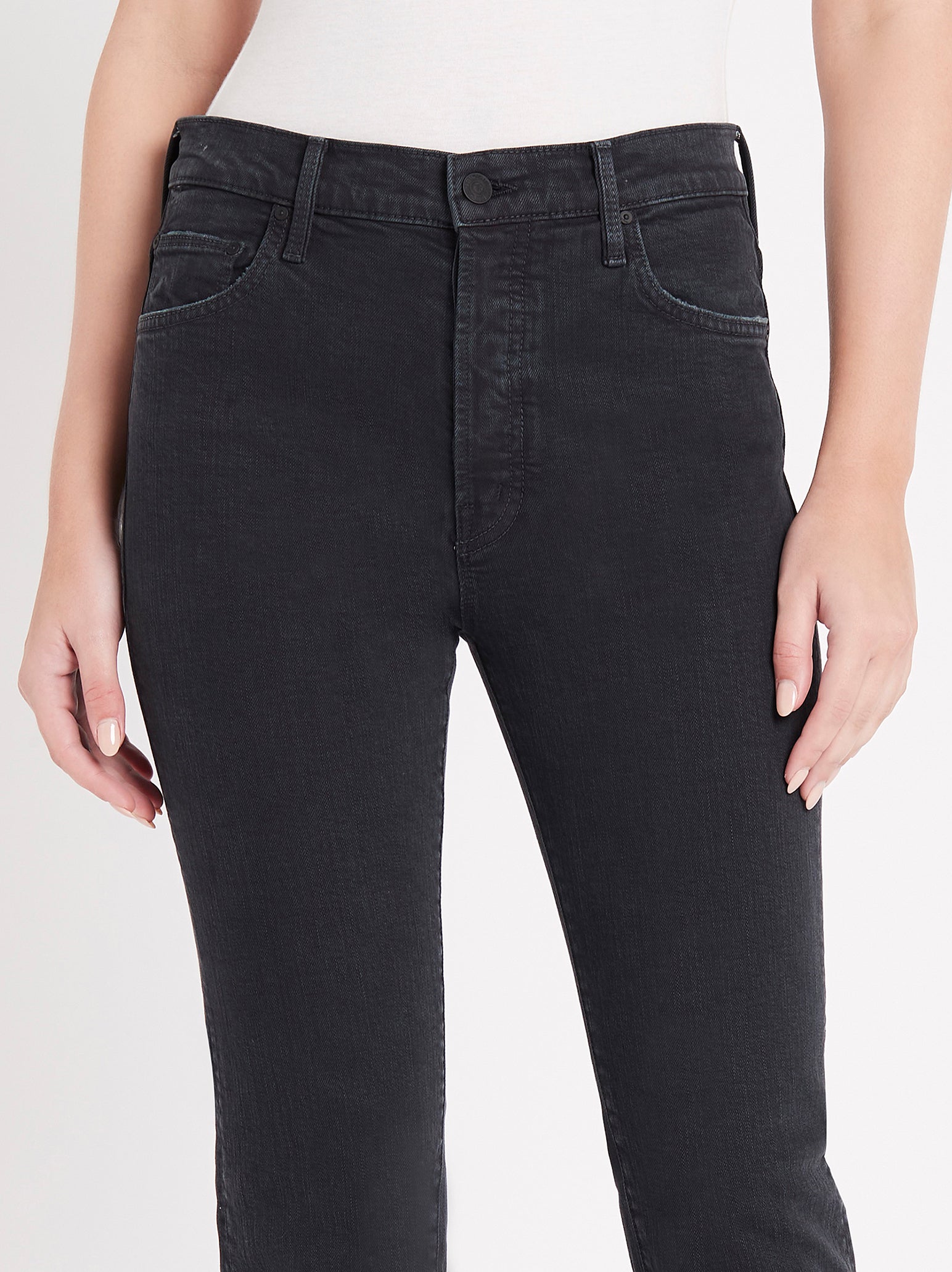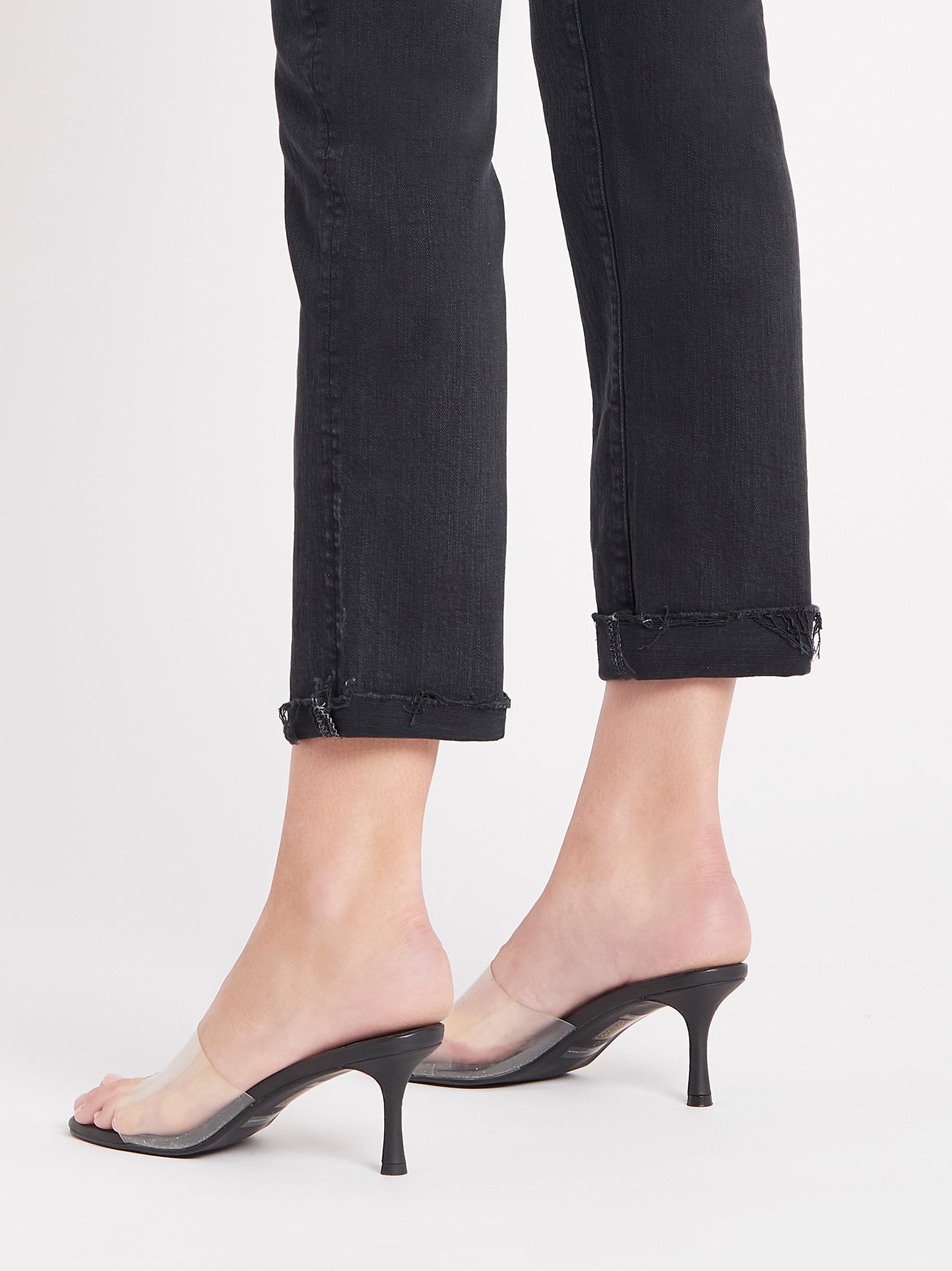 The Mother Denim Scrapper Cuff Ankle Cuff Jean in The Devil May Care Faded Black is made from 98% Cotton and 2% Elastane