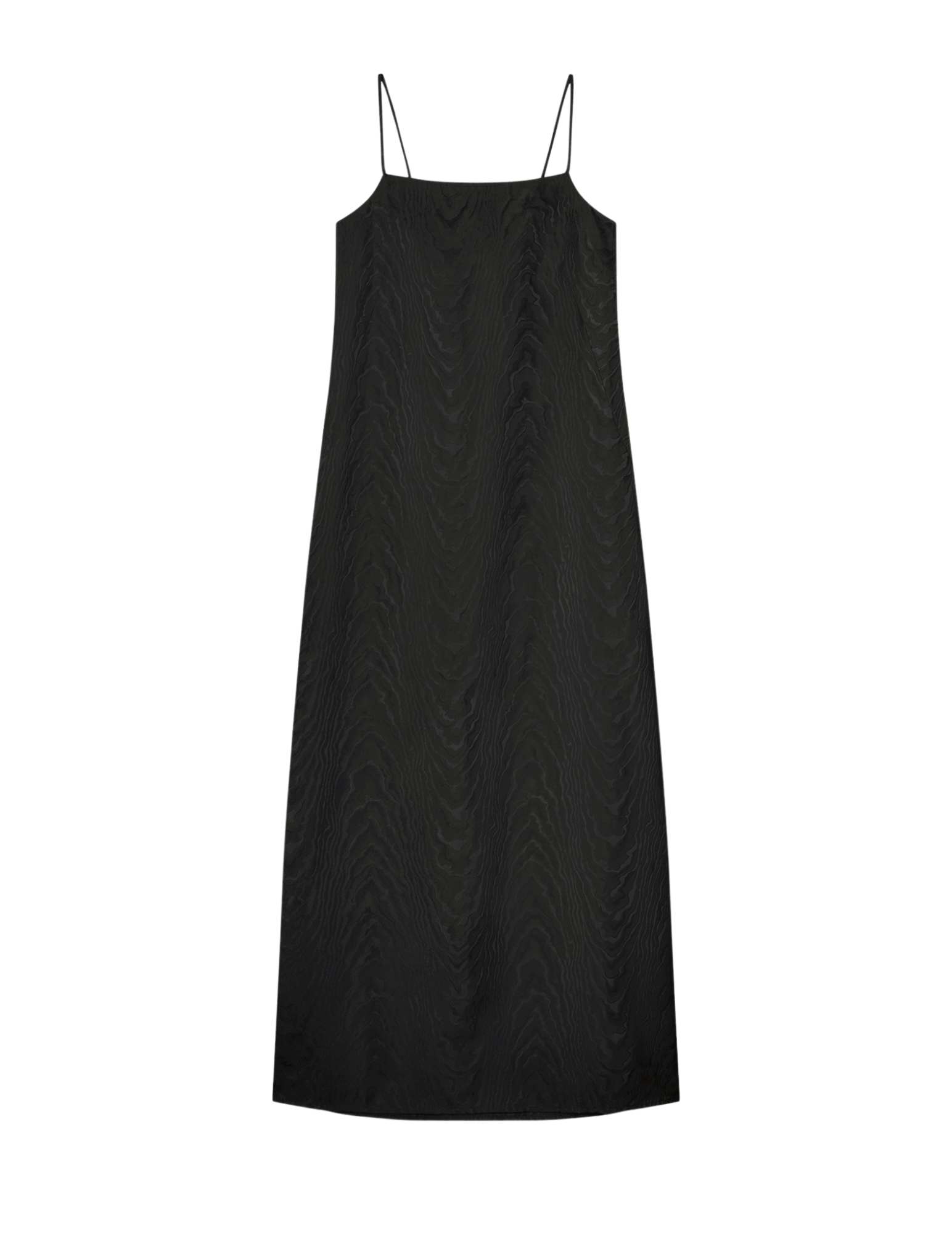Are you looking for a sign? The Róhe Indy Dress in Noir is it. Crafted from black-colored French Moiré fabric, this tank dress features a special fine cord detail at the back, and a knee length split. You've waited for a dress like this your whole life - and here it is. Luxurious, versatile, and made for you.