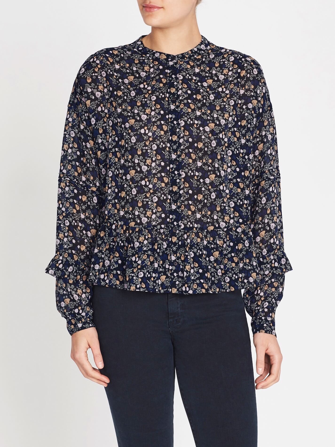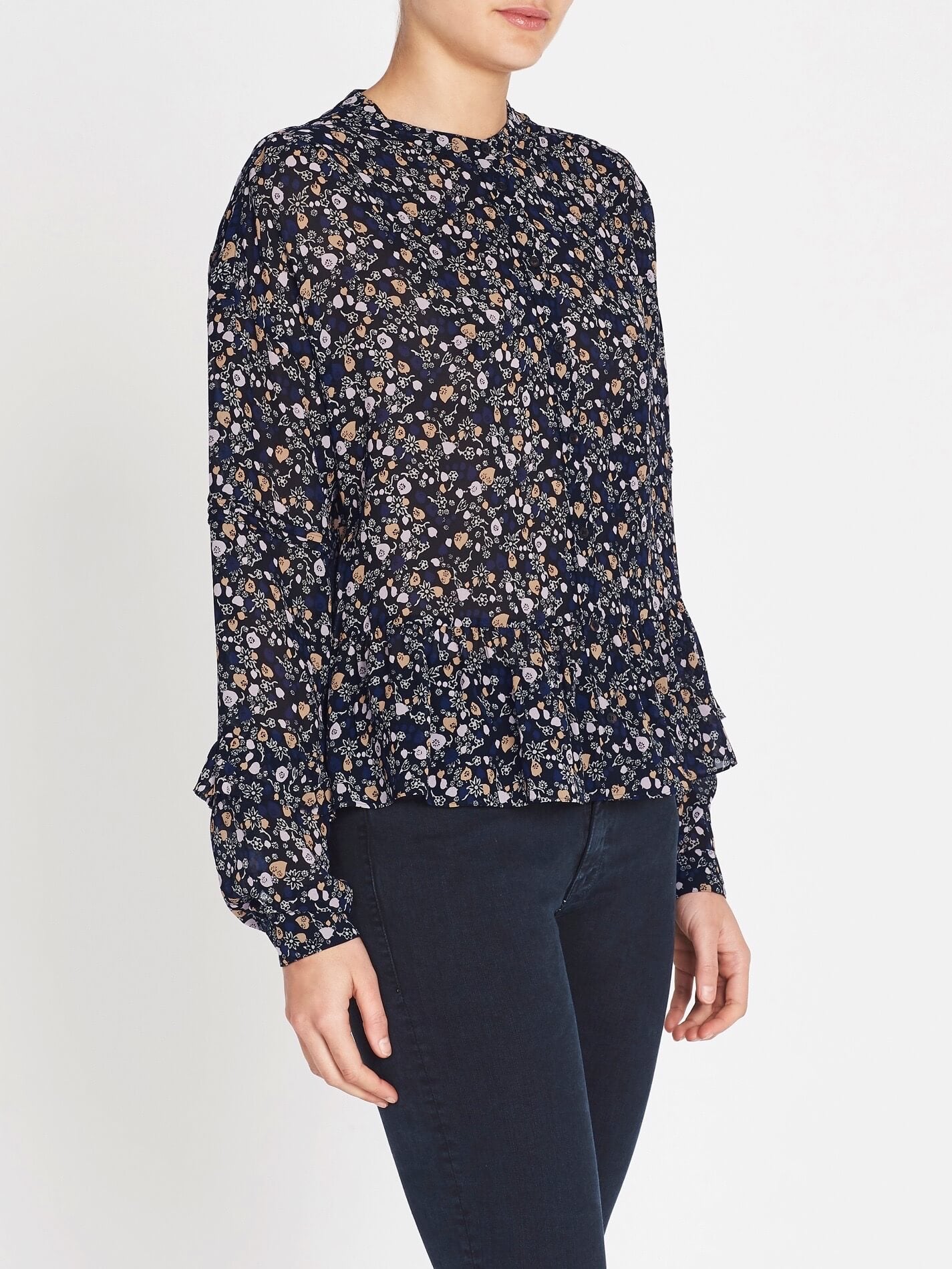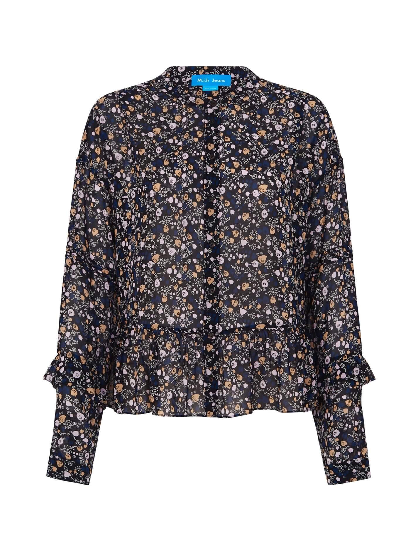 The M.I.H Jeans Ingrid Shirt in Vine Leaf Print is the perfect piece to add some dark florals to your wardrobe this spring. Constructed from a silk georgette this long sleeve pullover style shirt features raw edged frill sleeves with pin tucks, a centre front button opening, a collared neck and is finished with a gathered peplum hem for a distinctive shape.