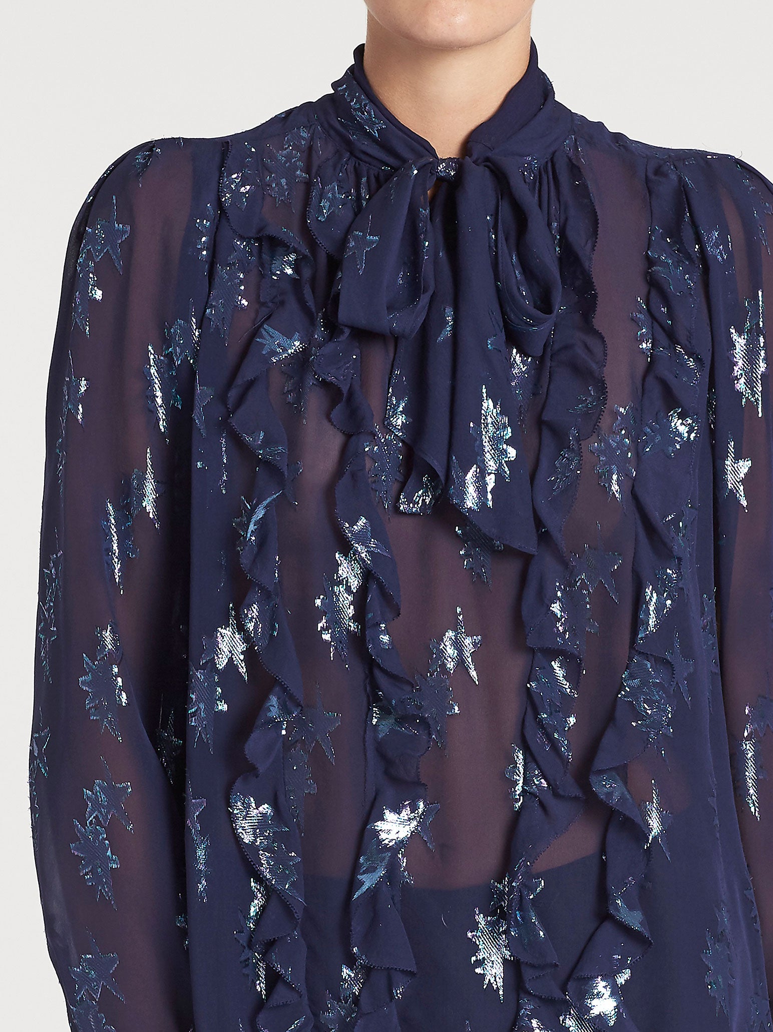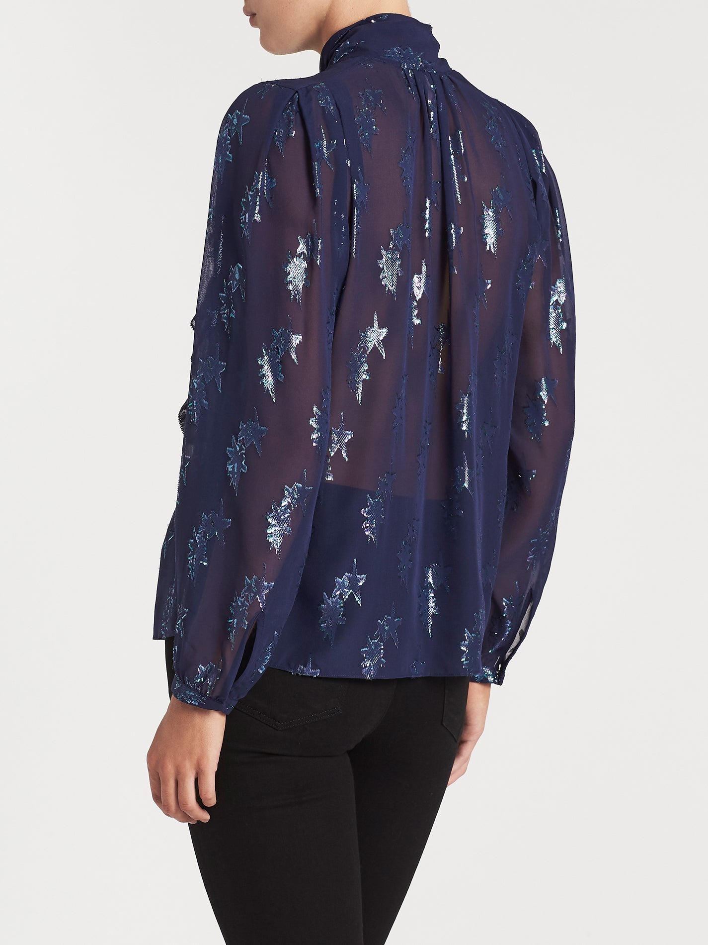 The Rebecca Taylor Metallic Star Clip Tie Neck Top in Gemini is made from 85% Silk 15% Metallic Fibre