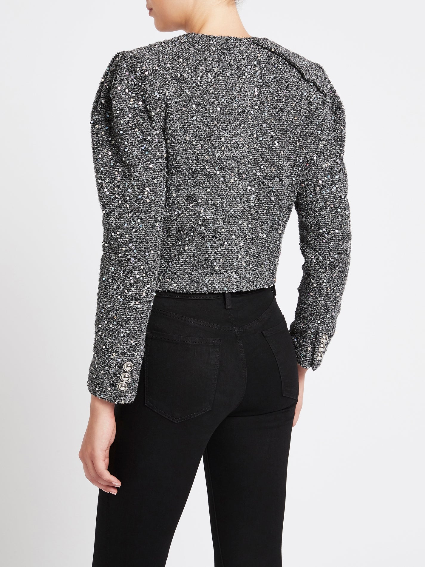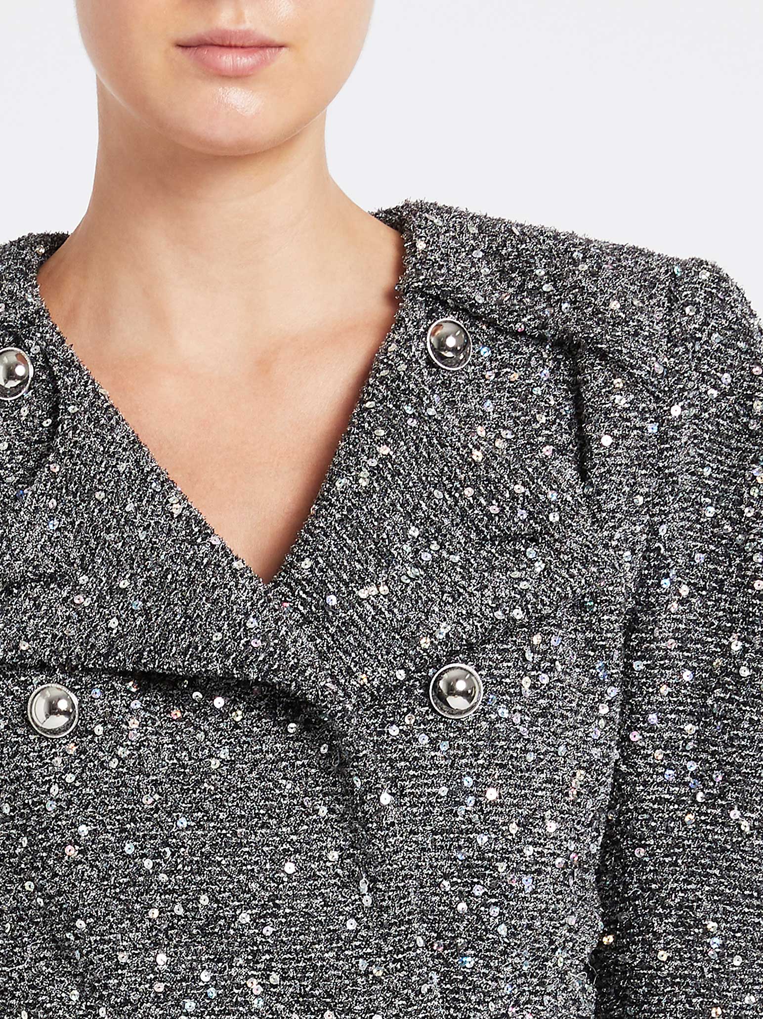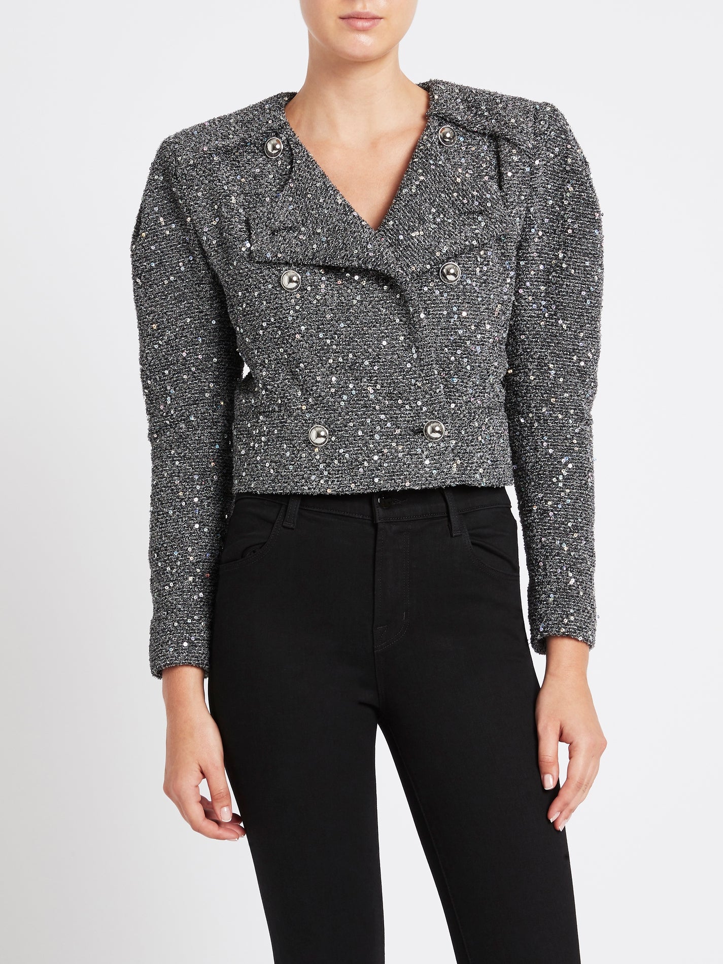 The IRO Sorla Jacket in Silver has a distinct vintage feel mixed with a nonchalant attitude. The notched collar and double-breasted button front create a strong silhouette, dusted in shining metallic sequinned this jacket has a flattering cropped hem and slim fit to make this the perfect addition to any outfit.