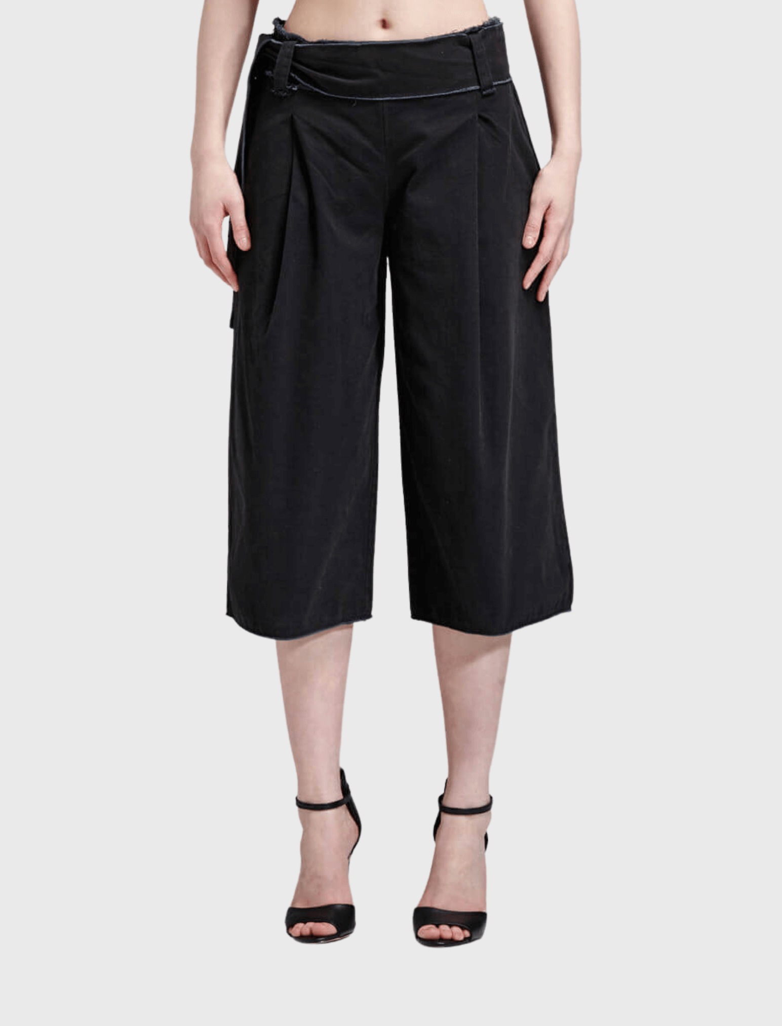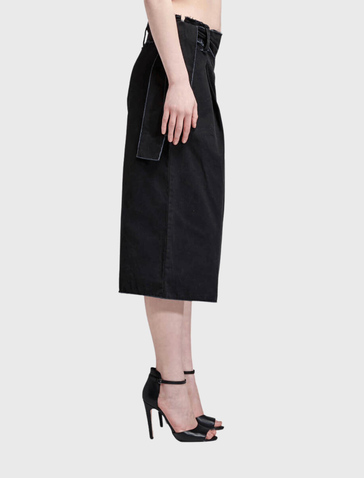 Get trendy in these Wide legged Culottes from N / Nicholas. Made from Cotton Canvas, these pleated black culottes have raw edged detailing, are accented by a wide belt and have exposed side zip closure.