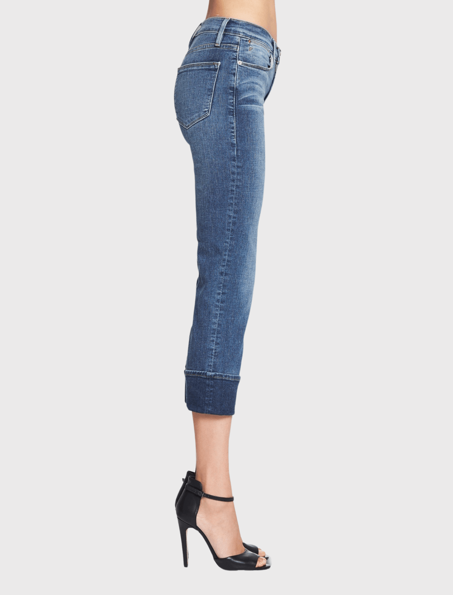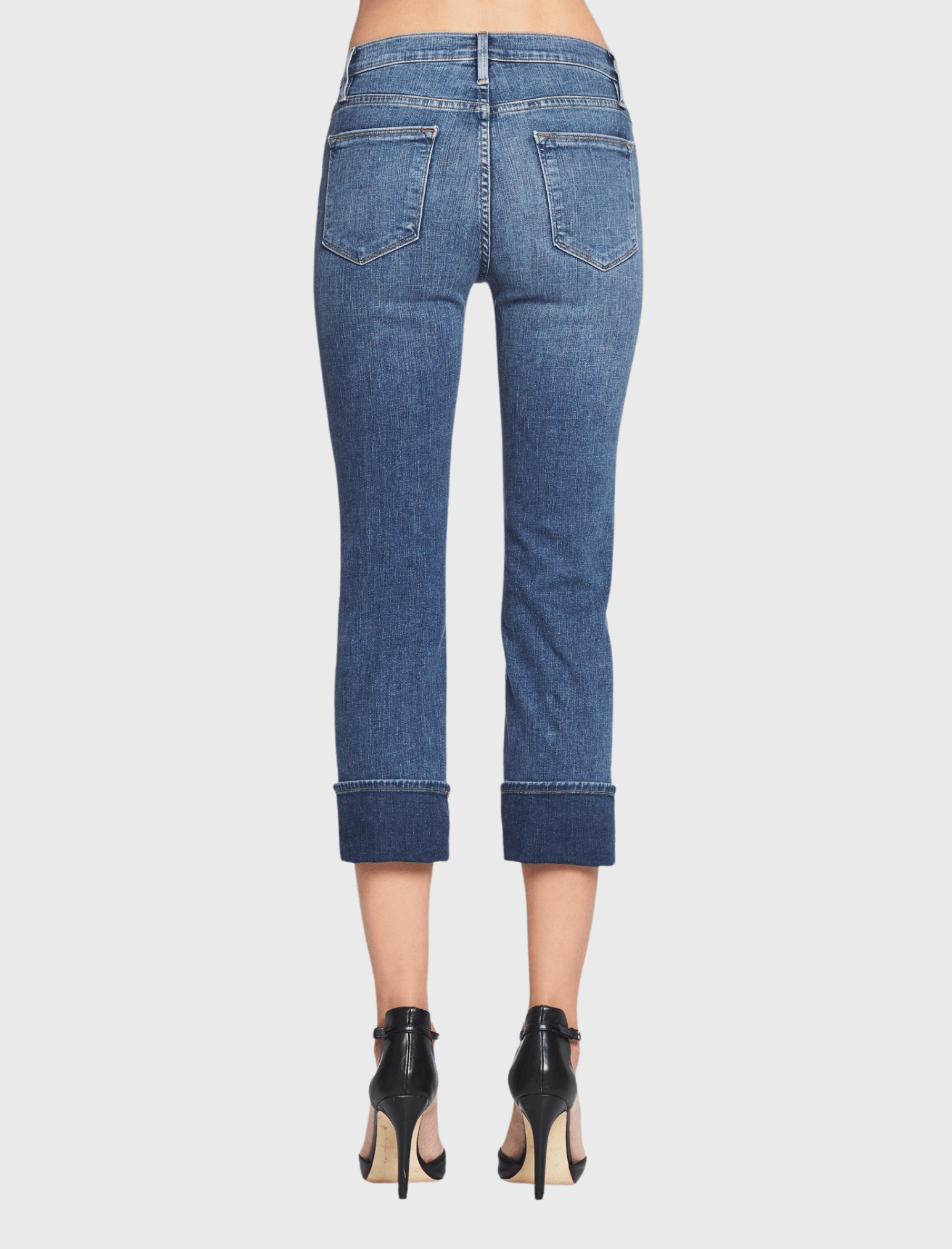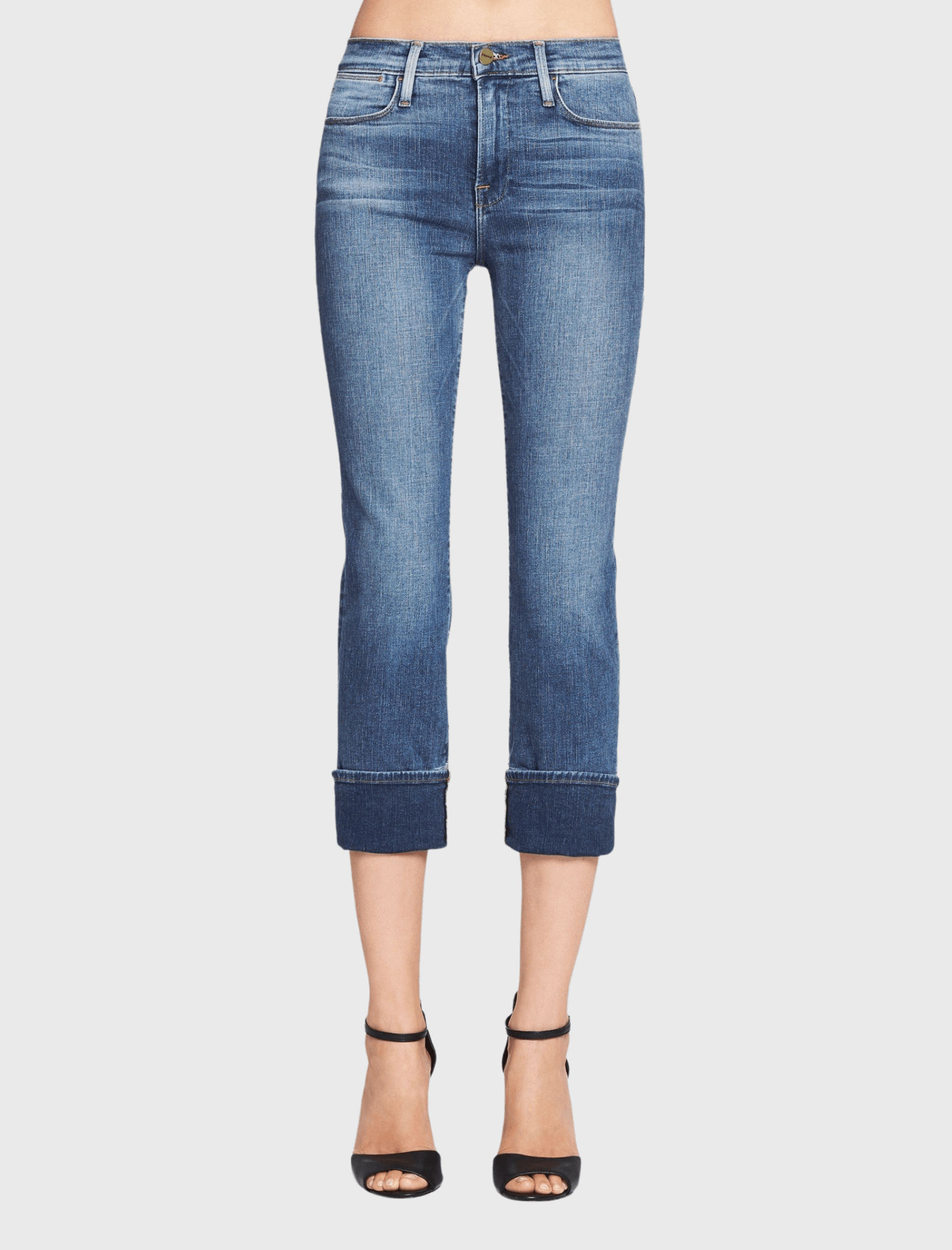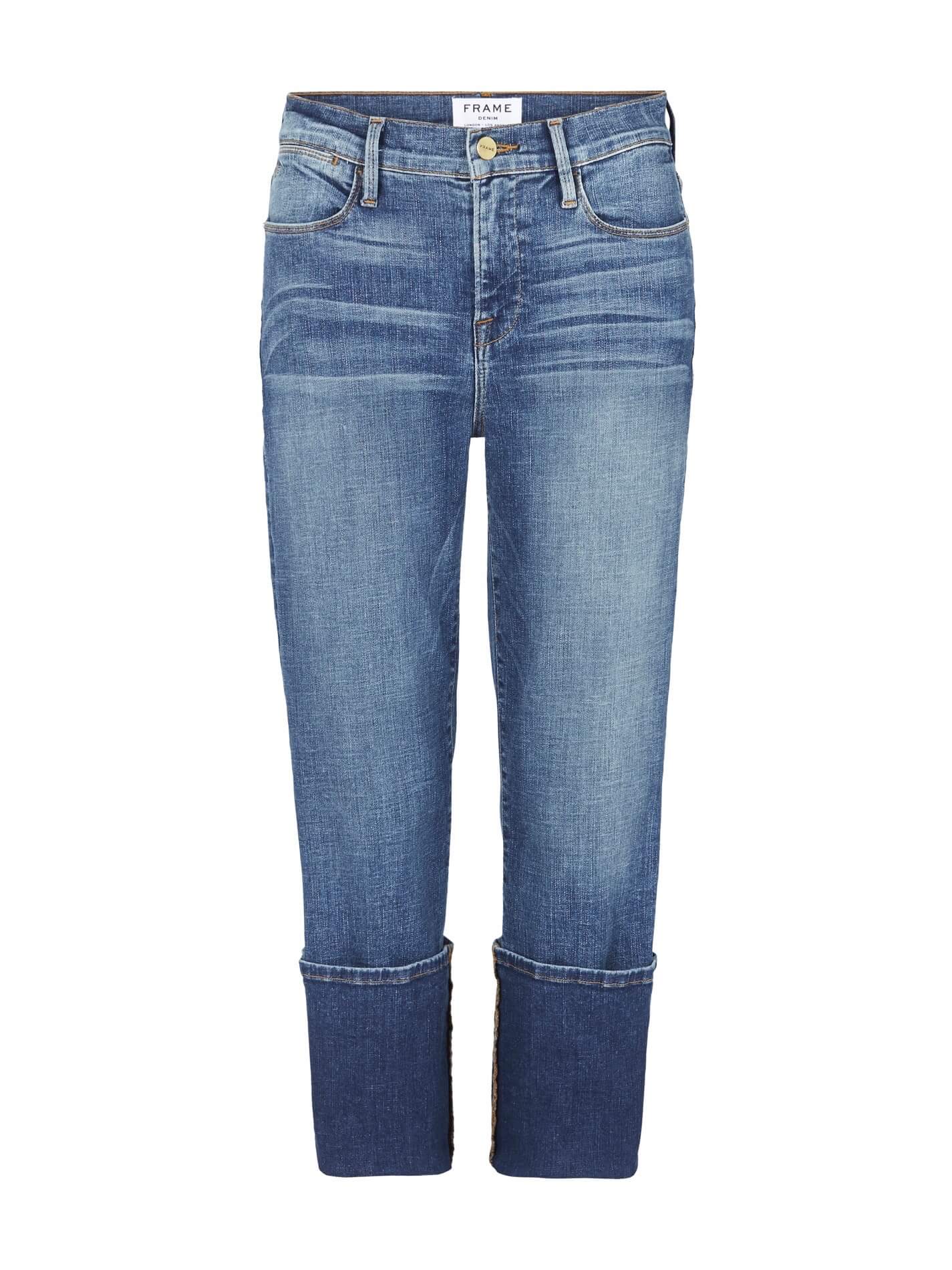 A straight leg style with a high rise, these jeans from Frame Denim feature fading on the butt and thighs, and whisker detail on the waist and inner thigh. These jeans are a mock cuffed cropped cut, embellished with silver hardware.