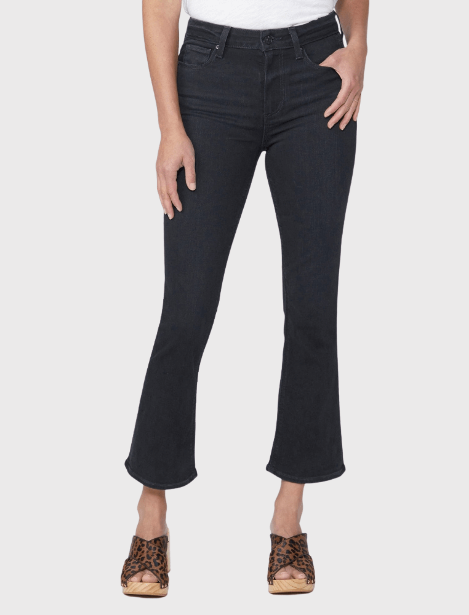 The Colette Crop Flare in Black Caviar from Paige is a classically styled high-rise jean perfect for everyday and evening wear. The cropped flare style fits slimly through the hip and thigh and has a small with a kick flare that starts below the knee that finishes above the ankle ending with a finished hem. Made from Paiges' Patented TRANSCEND VINTAGE this vintage toned black denim wash has all matte black hardware and stitching for a truly clean look. Loved for the stretch and recovery of this fabric, you will feel totally comfortable while looking totally stylish. Perfect for those evenings when the dress code is "jeans and a nice top".
