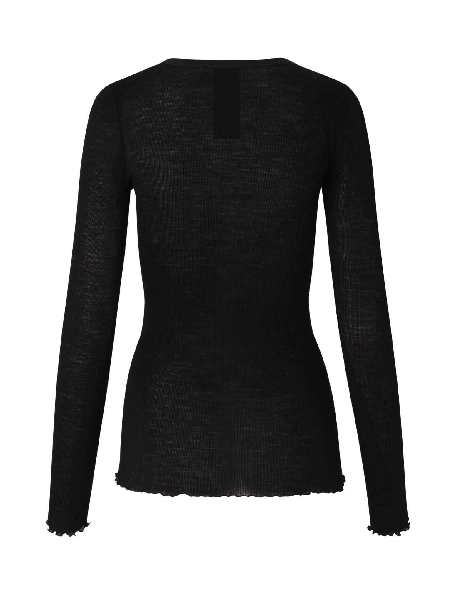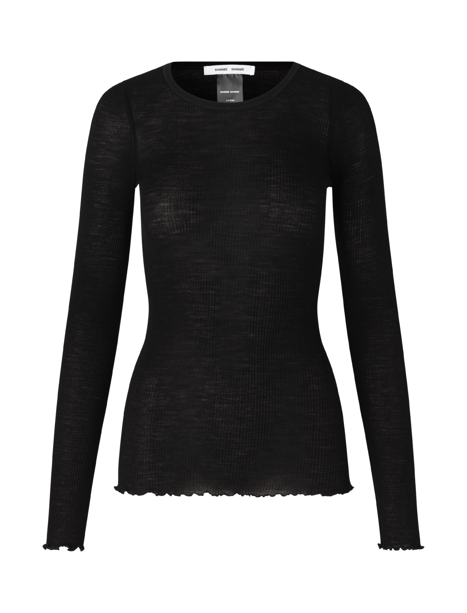 The Samsoe Samsoe Doudo Long Sleeve Rib Top in Black is made from 100% Wool