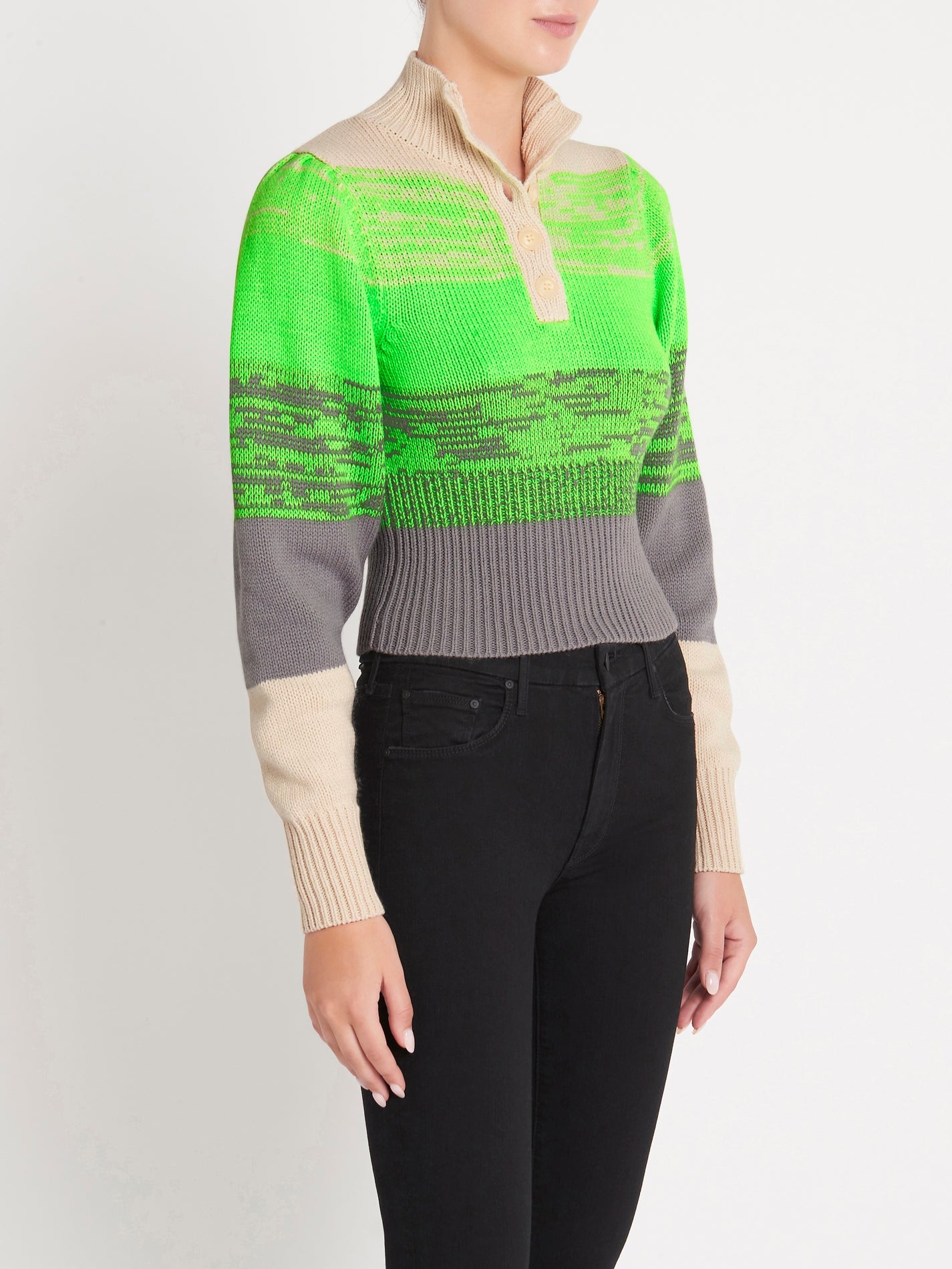 The Baum Und Pferdgarten Caroleen Sweater in Whitecap Grey is the eye-catching addition your wardrobe needs this spring. This jumper features a high neckline with button closures, banding at the bodice and wrists with a cropped silhouette to ensure a flattering fit and voluminous sleeves. The neck can be worn open or closed. Pair with white jeans or pant for a fun spring outfit.
