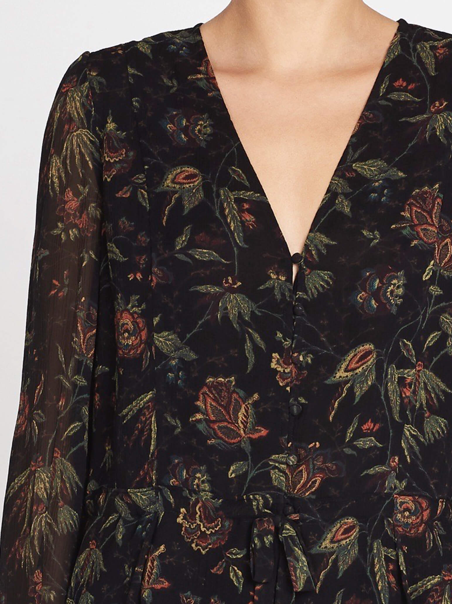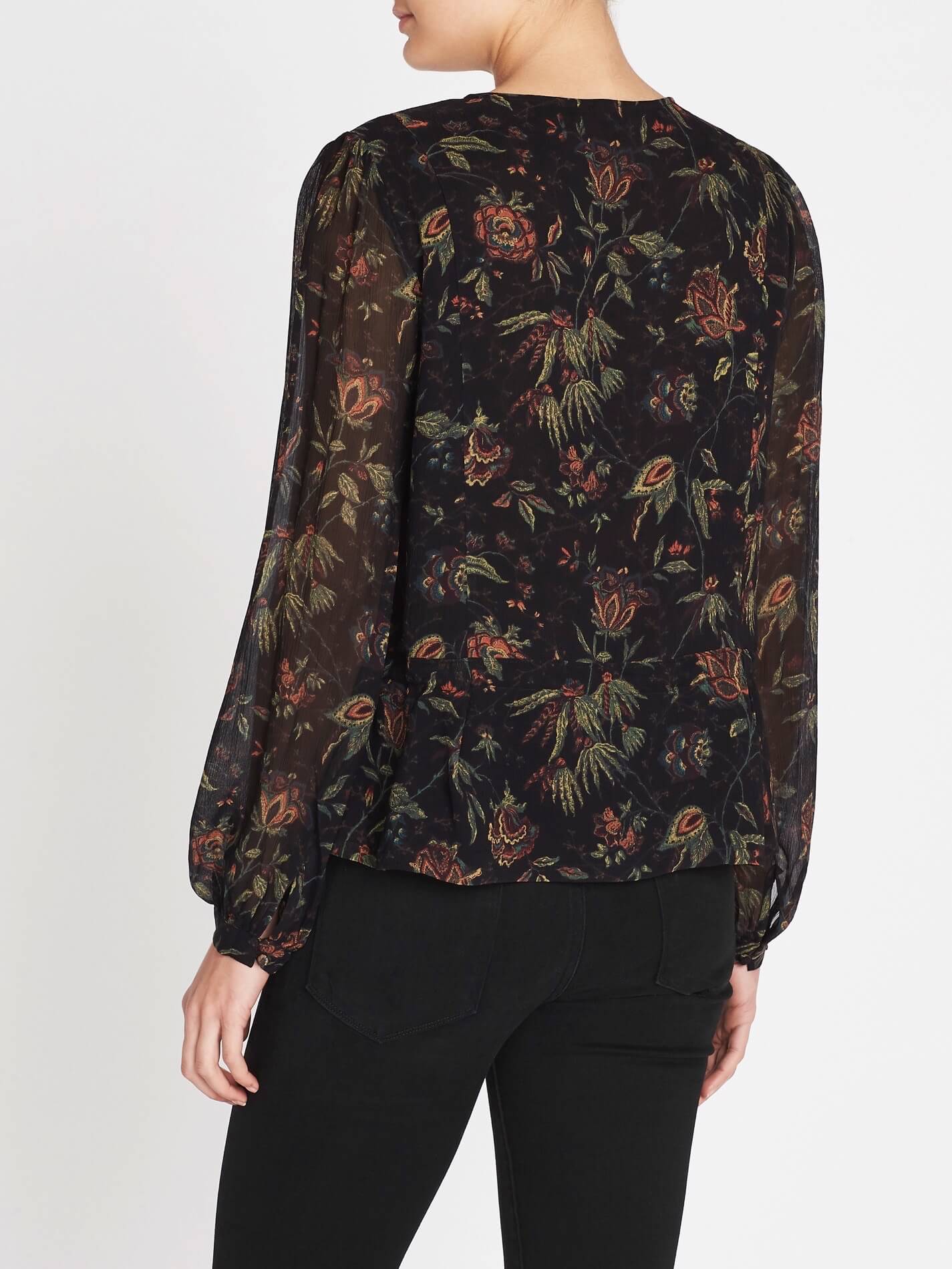 The Carmona Blouse in Black/Golden Sky is a lightweight, long-sleeved blouse that cinches at the waist for a flattering peplum shape. Detailed with sheer sleeves and fabric-covered buttons, this silk blouse features a dark garden floral print.