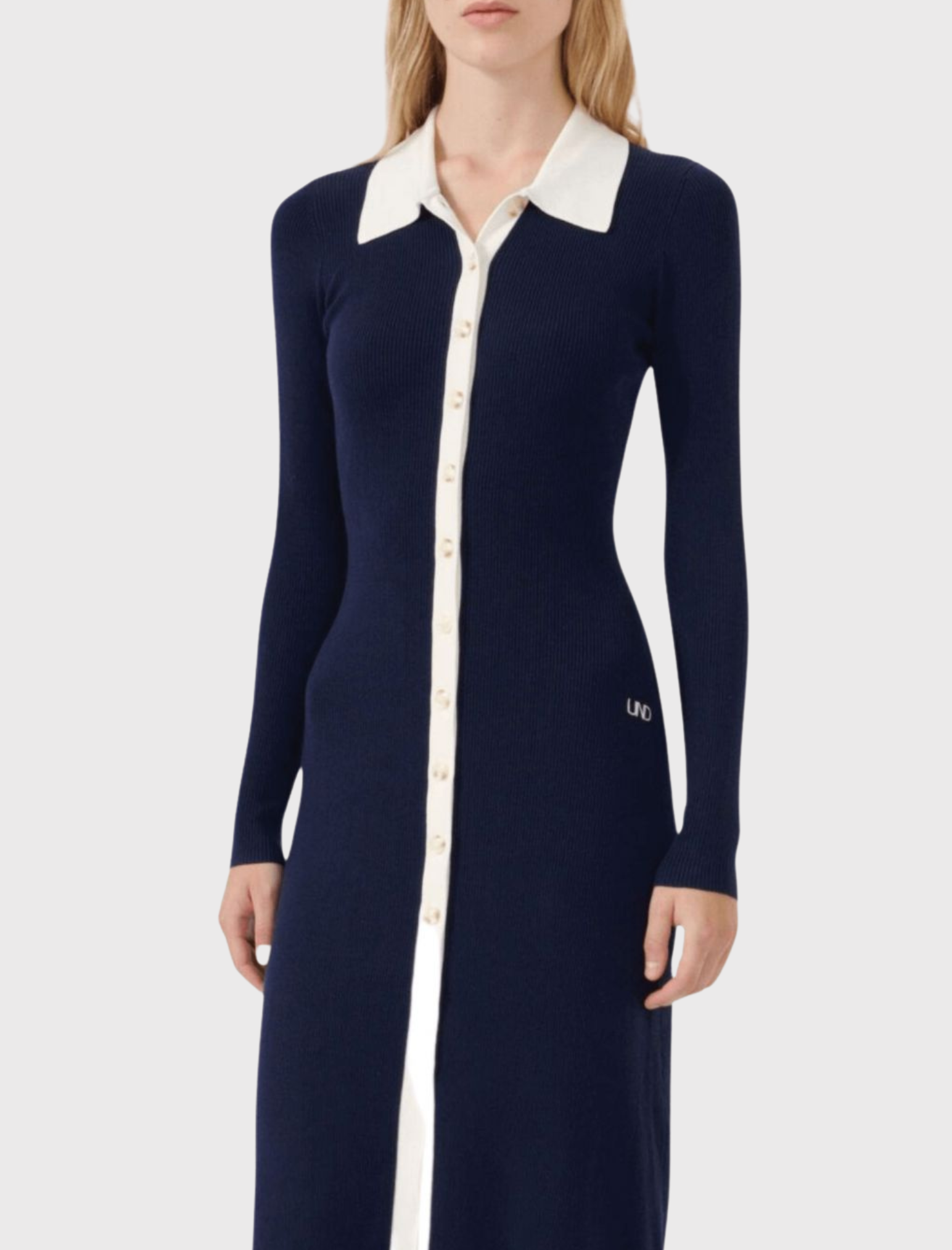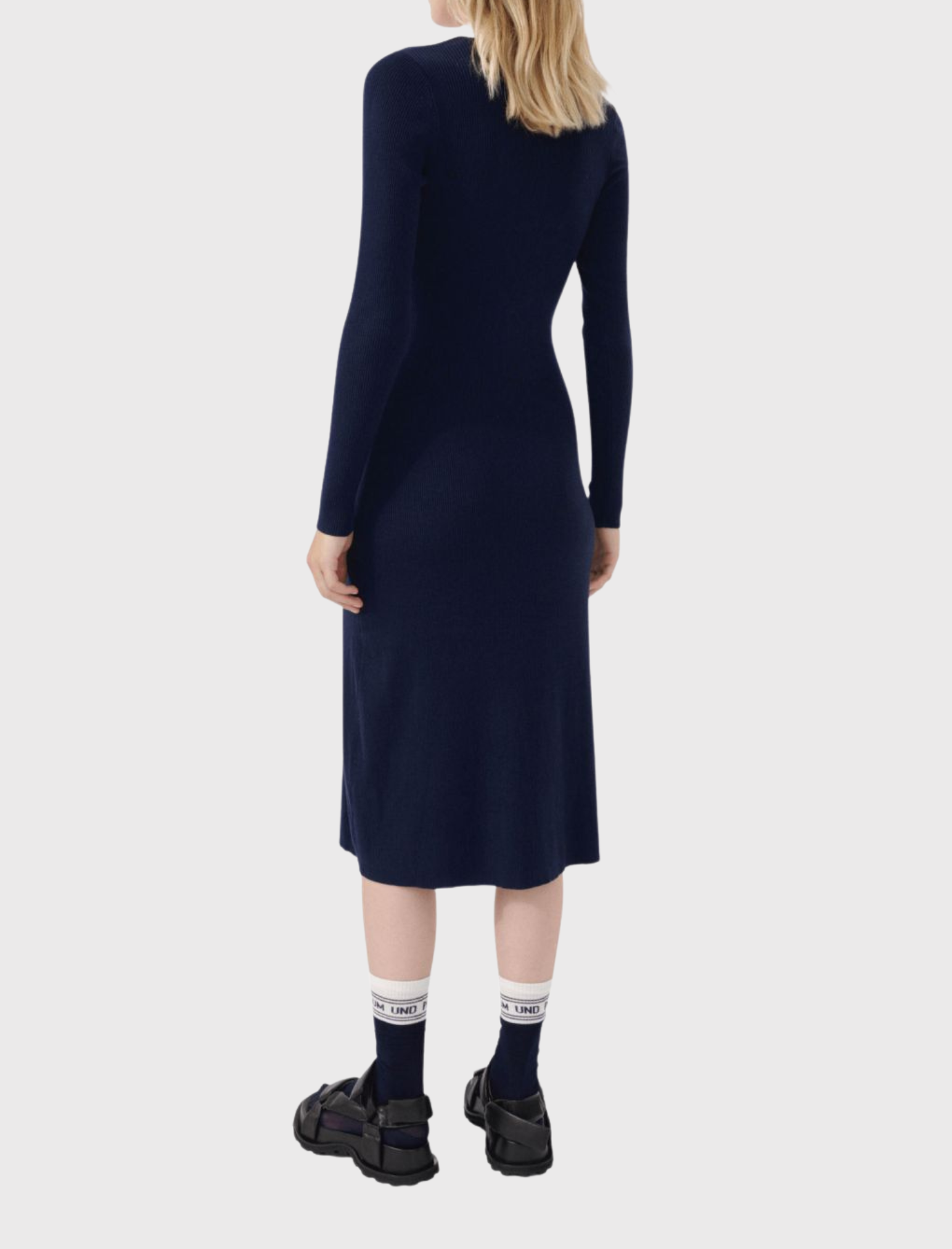 The ultimate between season piece the Casja Dress in Navy Blazer from Baum Und Pferdgarten is a ribbed knit cardigan style dress. Featuring long sleeves, contract collar and button placket. This midi length knit dress is form fitting and has a side hip embroidery details reading UND. Do double duty and wear this open like a long line cardigan over jeans and a tank top.