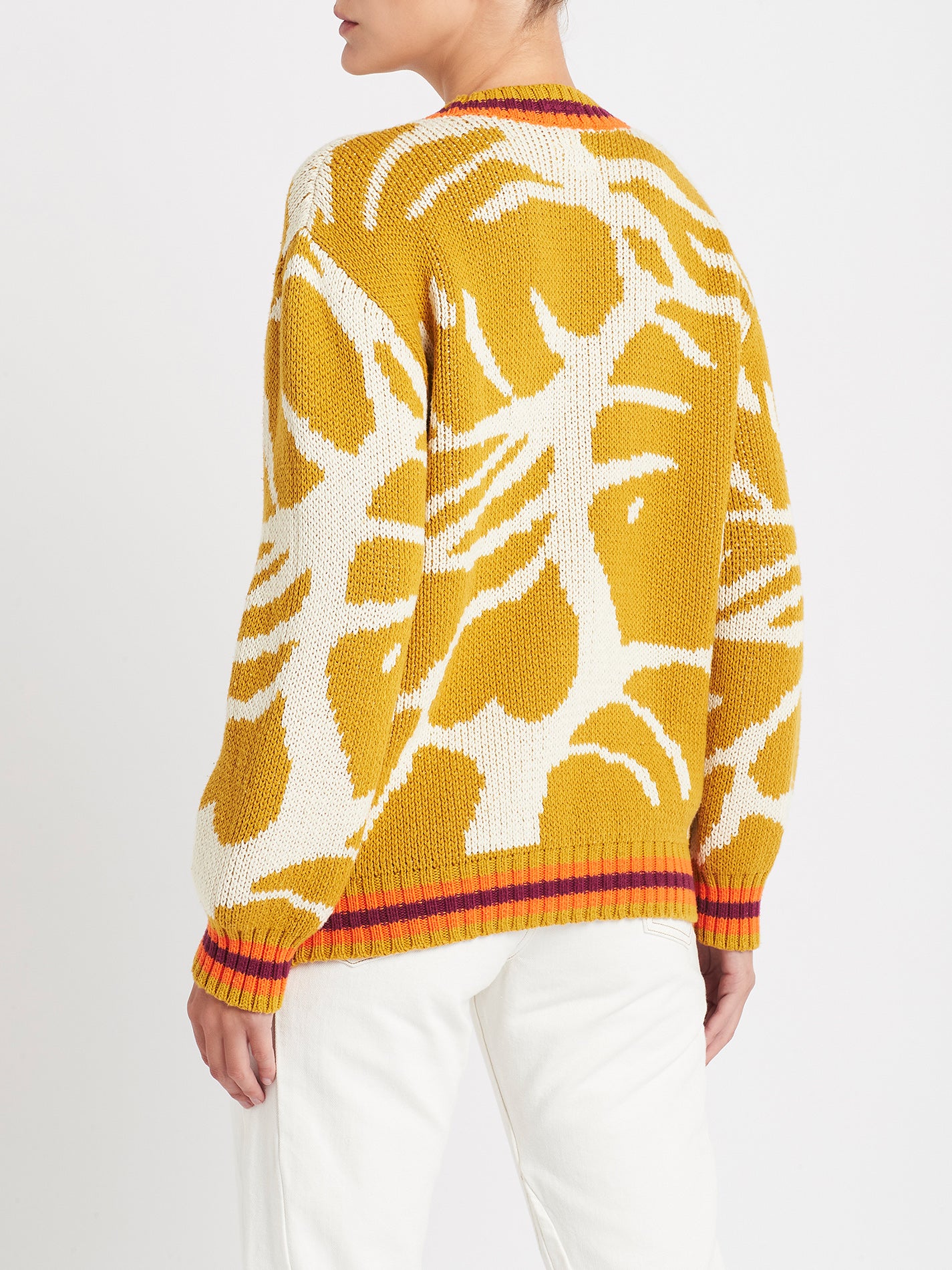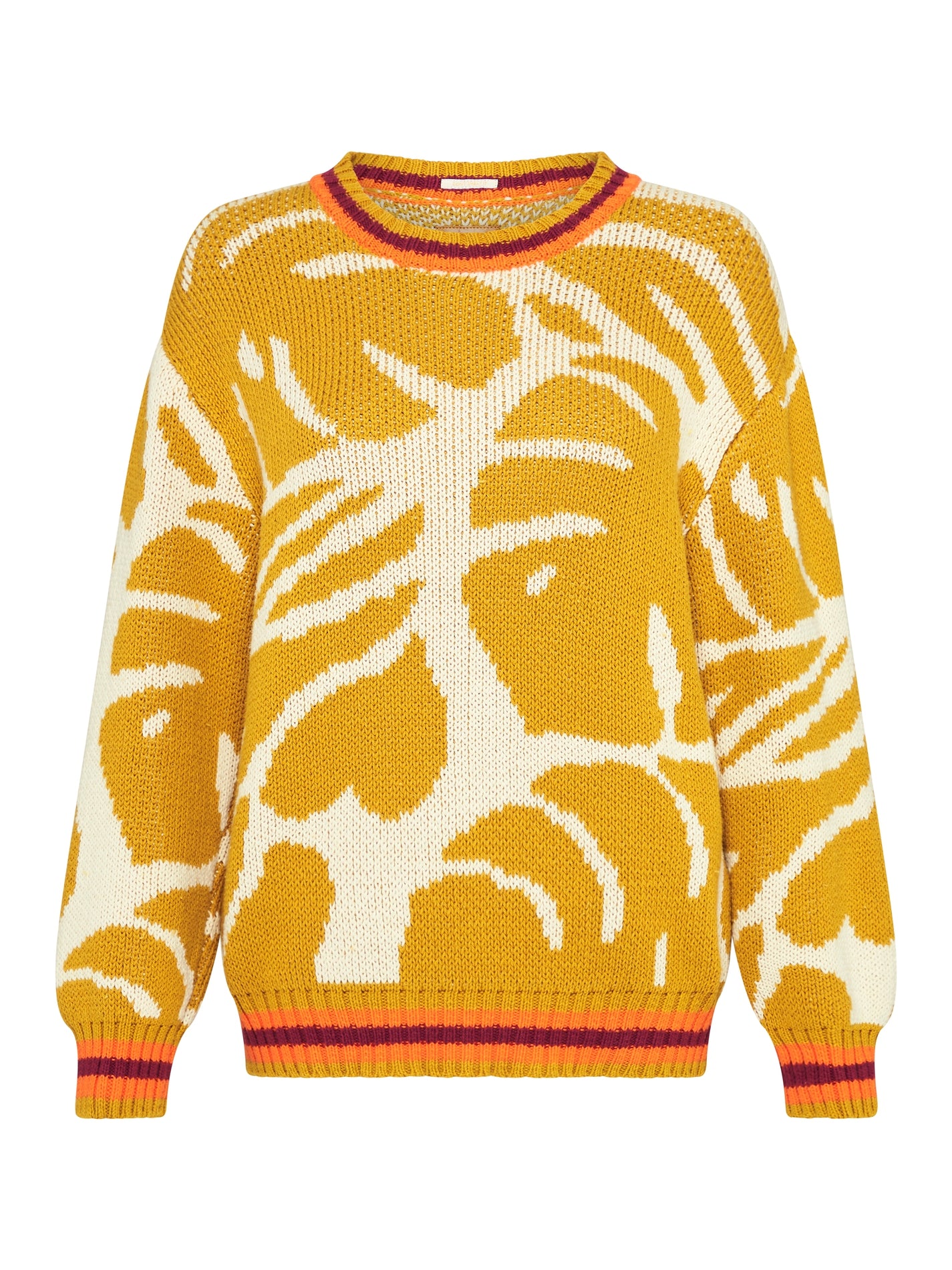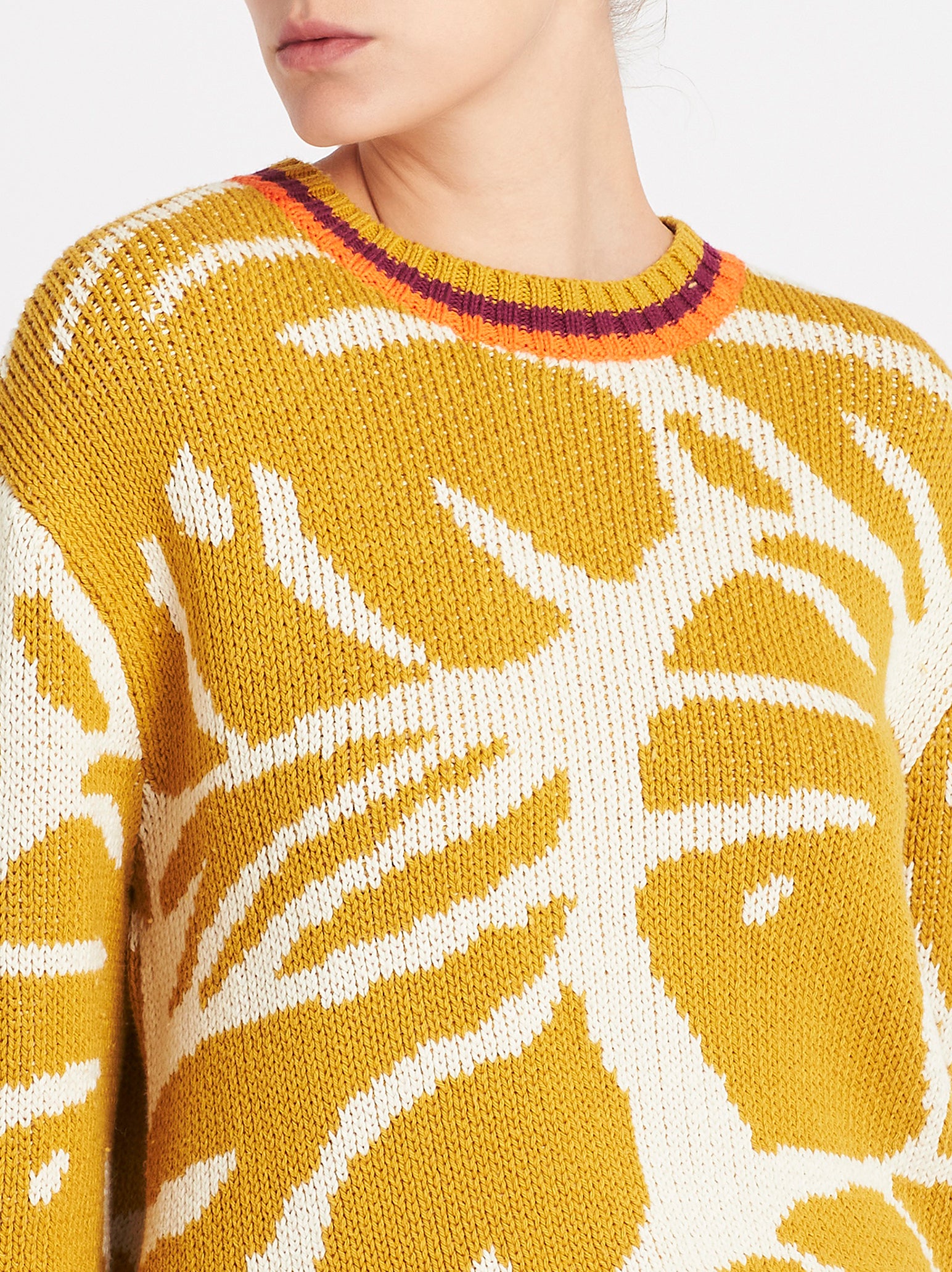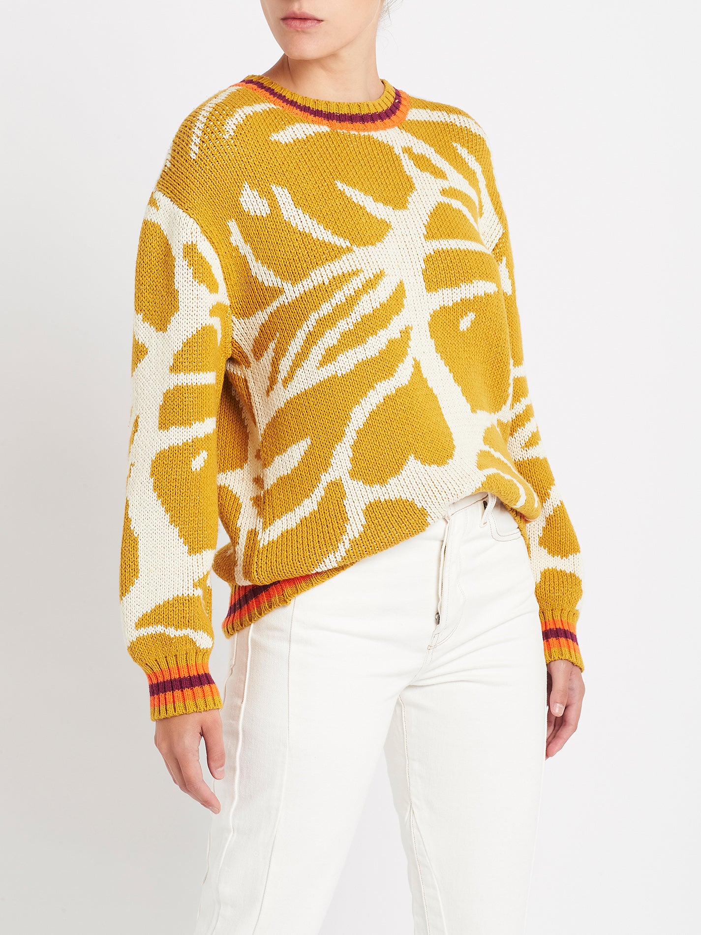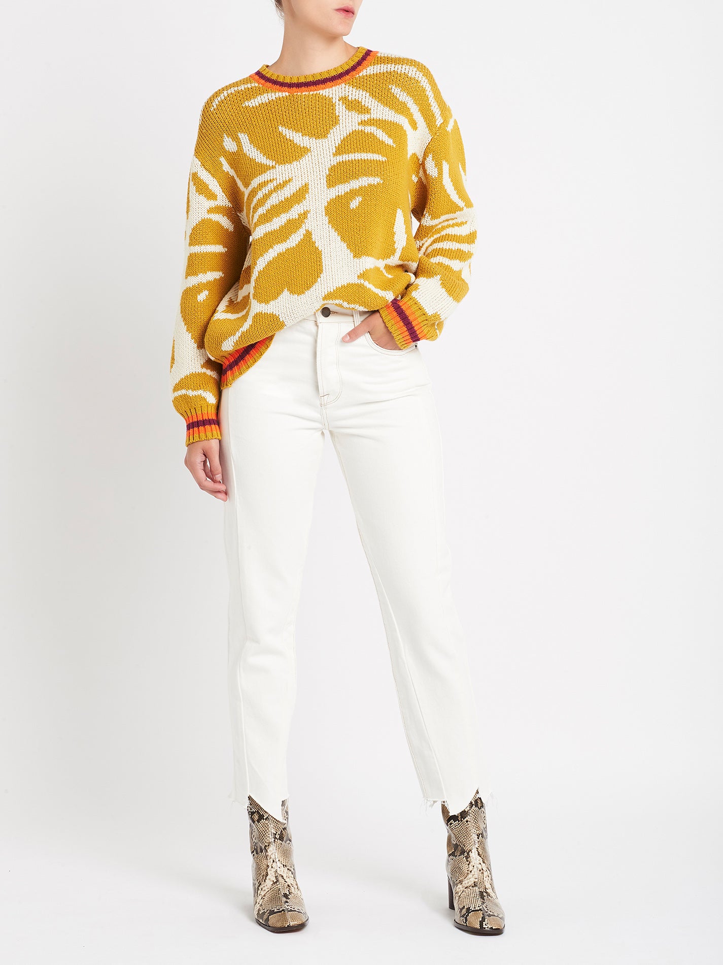 Are you ready for your new favourite jumper? Mother Denim presents The Jumper in Wild Palms, a pullover sweater with a crewneck and relaxed fit. Made of 100% cotton, the sweater features monstera leaves and varsity stripes. Soft to touch, versatile, and waiting for you.