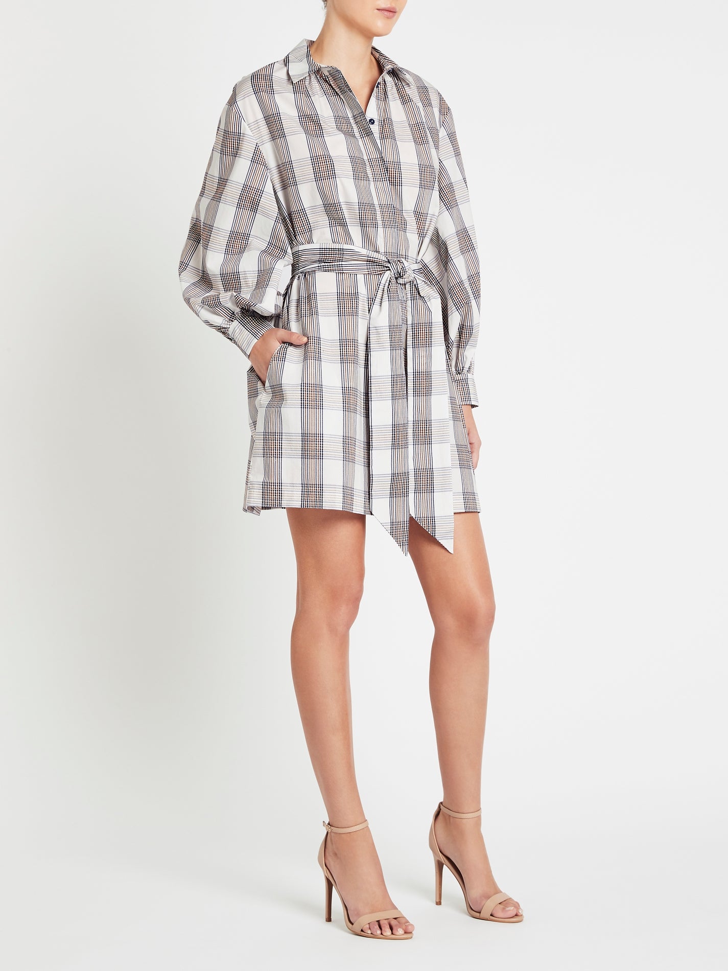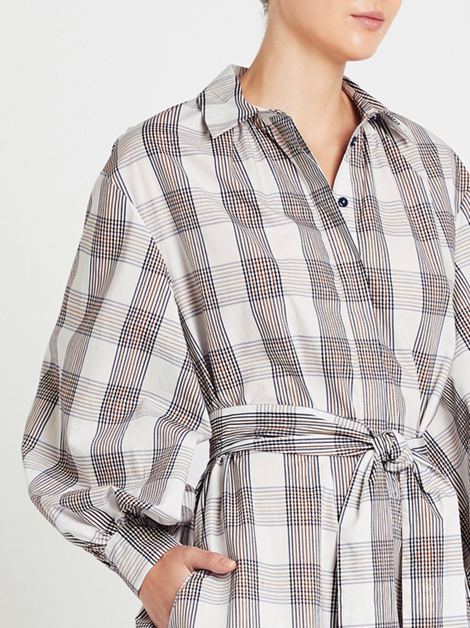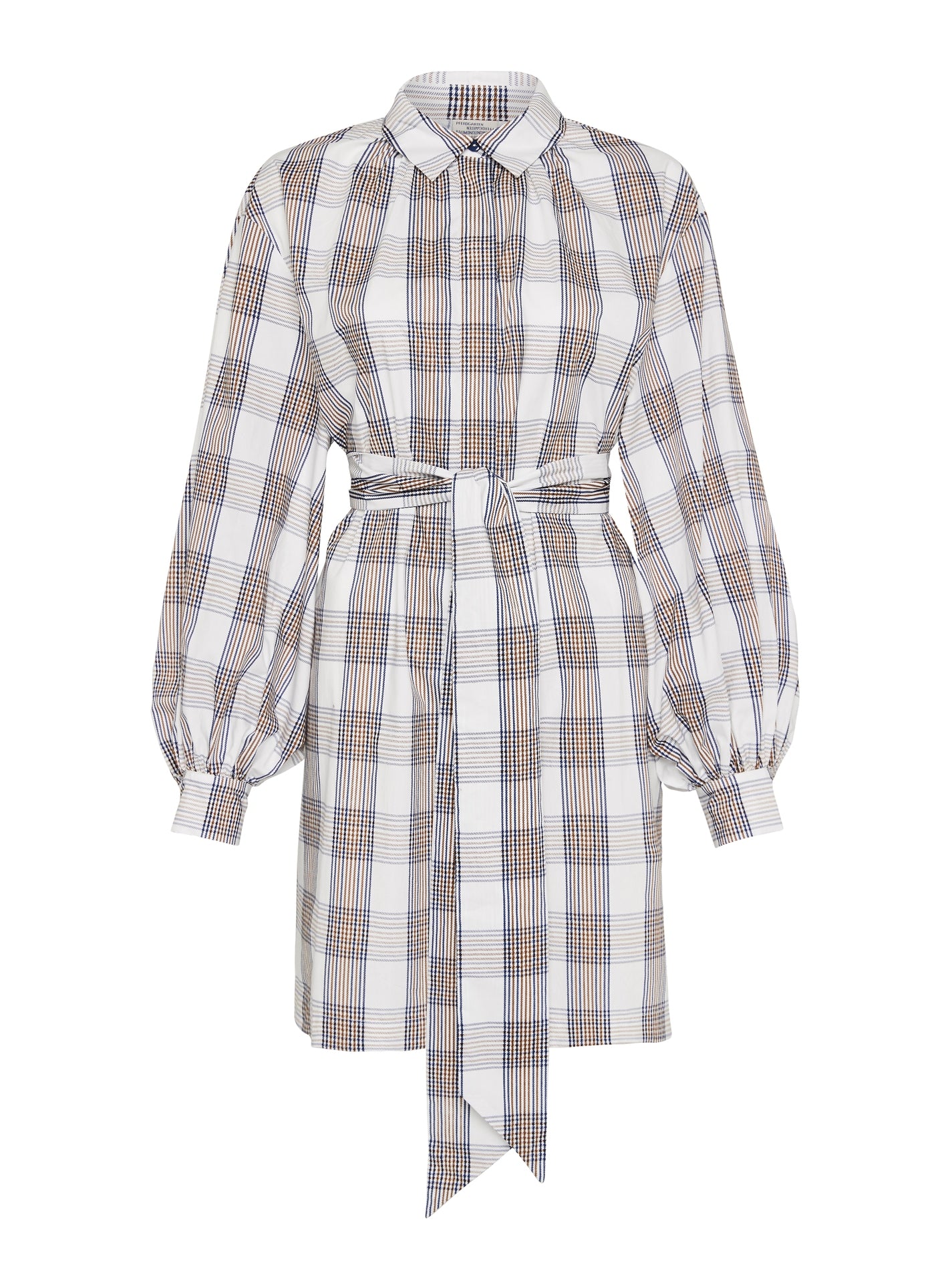 Nail the WFH, casual chic look with the Aubree Dress in Cream Navy Brown Checks by Baum Und Pferdgarten. Constructed from super soft organic cotton, this long sleeved mini dress features a classic collar and button down style, stunning modern and refined check print, ruched cuff detailing and is accompanied by a detachable waist tie belt. Pairs perfectly with a power blazer or team back with a leather jacket and killer boots.