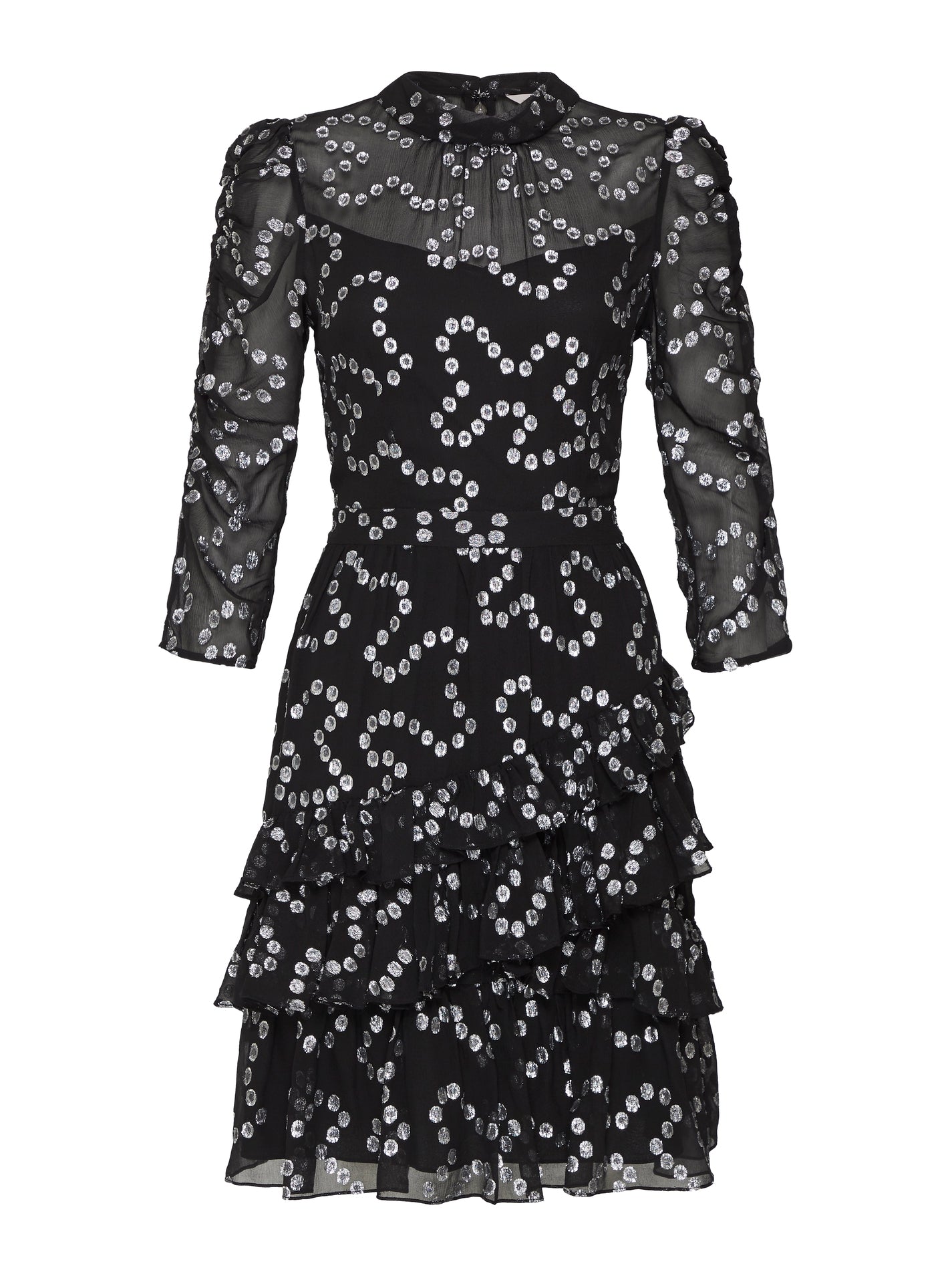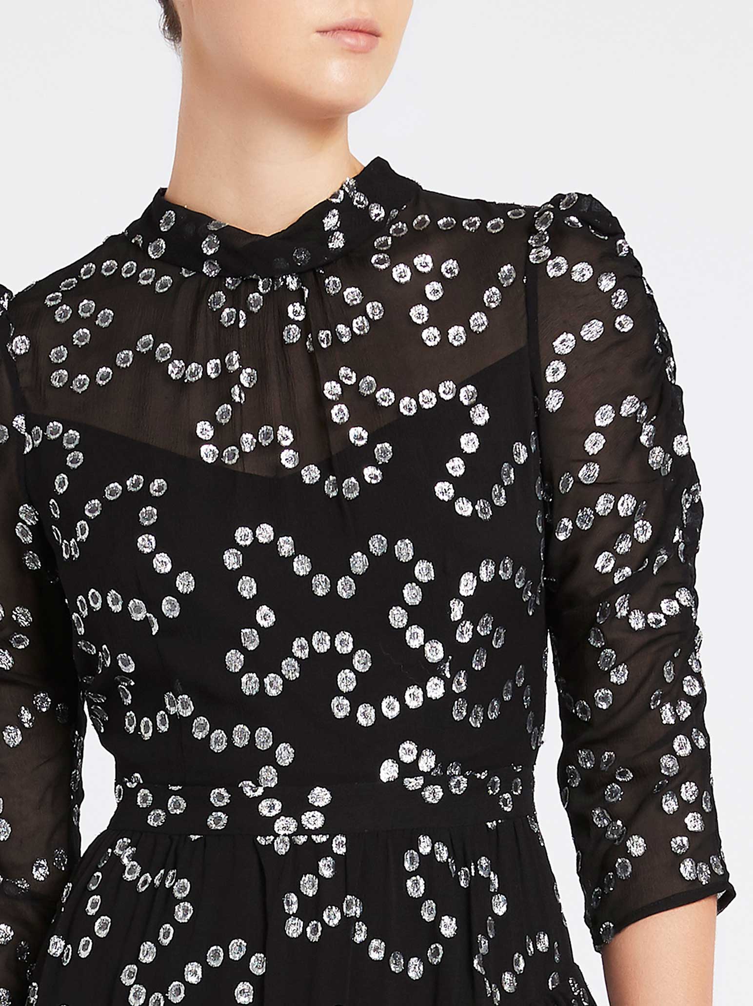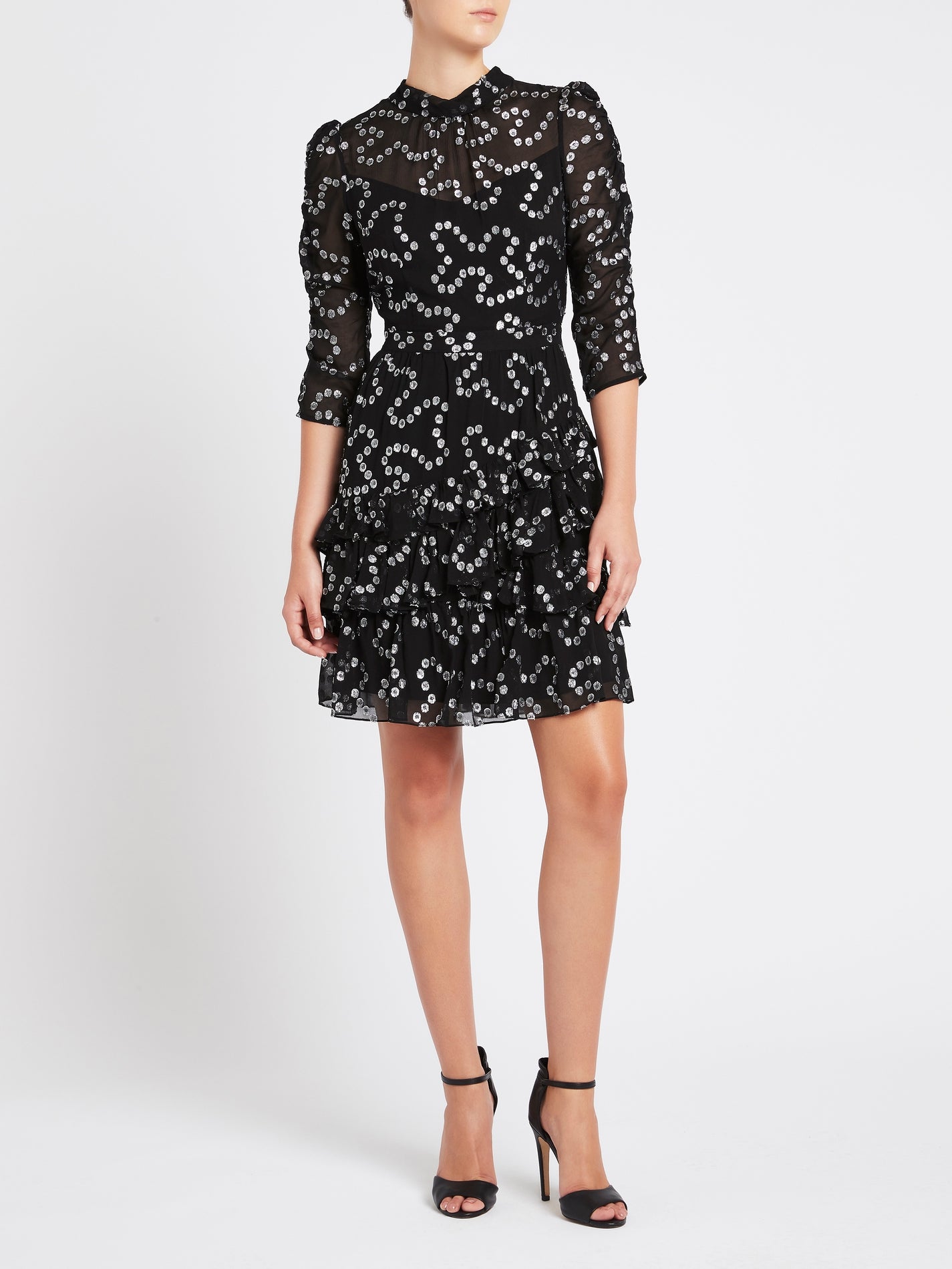 Add sparkle to a special occasion in the Rebecca Taylor Nuage Metallic Chifon Dress in Black Gunmetal. Crafted from chiffon silk with a metallic blend, this mini dress features a high neckline with ruched sleeves complimenting a ruffle tiered skirt and is finished with mesmerizing silver lurex dot print. Pair with killer heels for a show stopping look.
