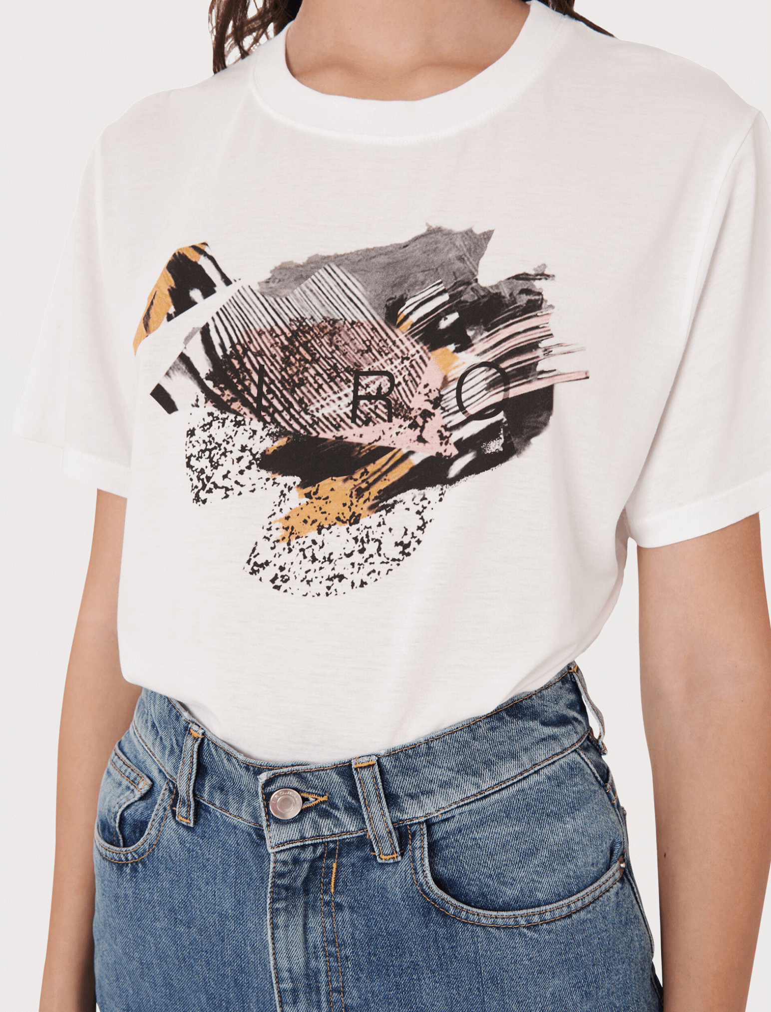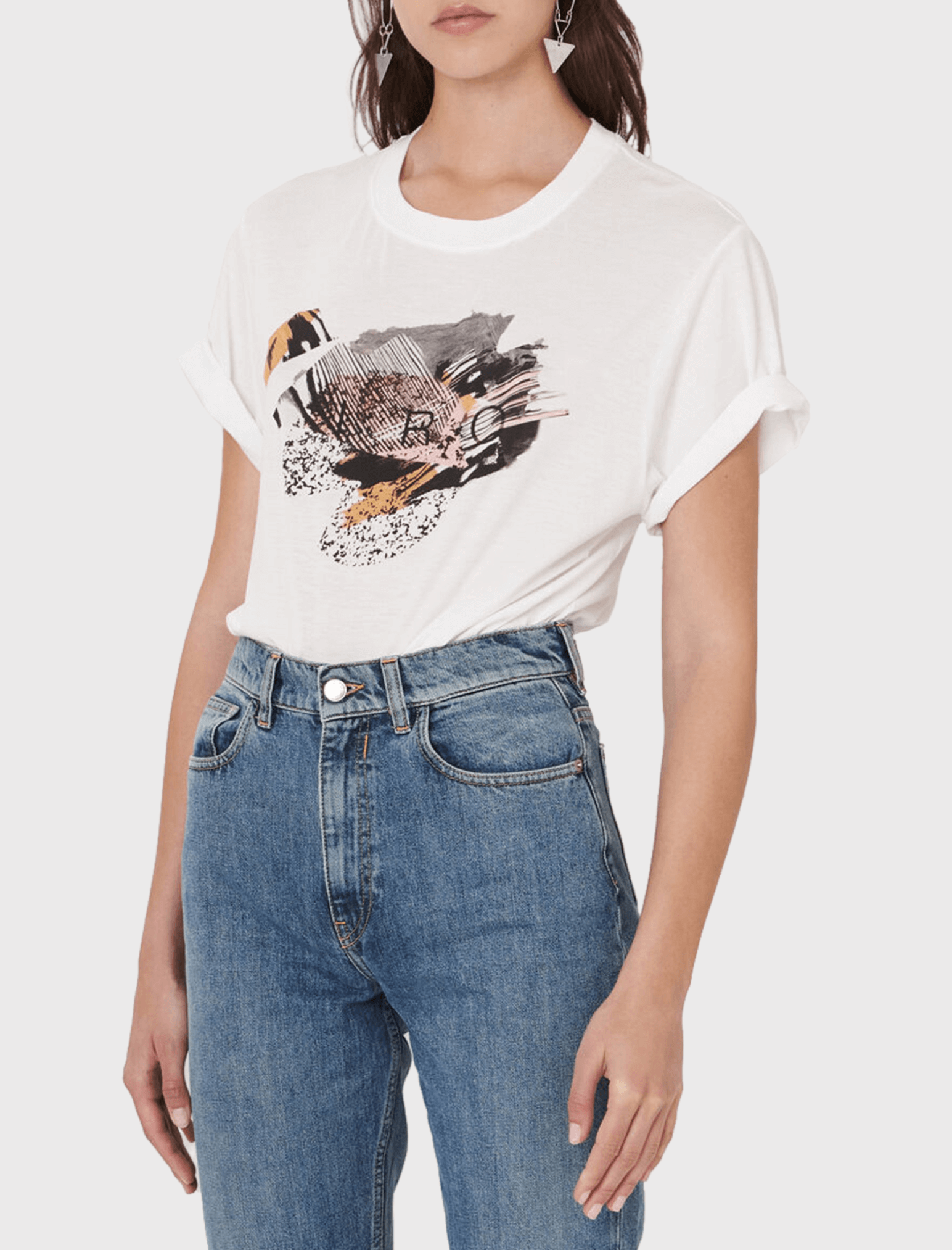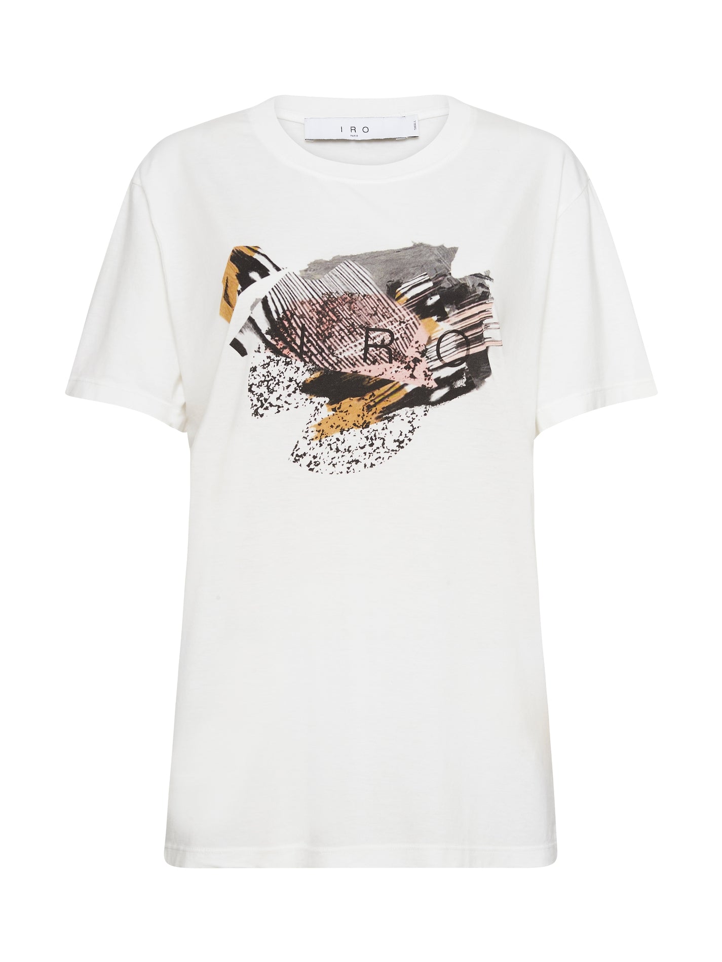 The IRO Croft T-Shirt in White is an everyday essential crewneck tee elevated by a IRO silkscreen. The designer logo print in pink and honey hues with a graphic black and white texture will pair perfectly with jeans and sneakers for a fun everyday look.