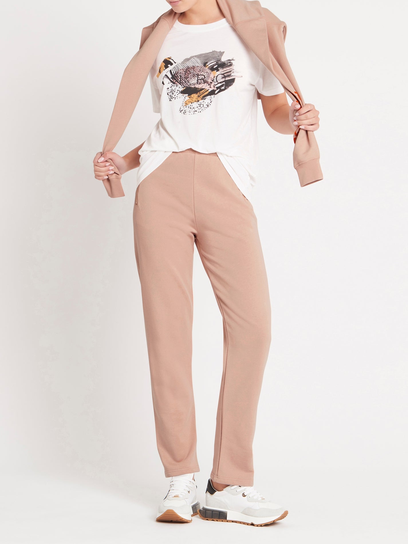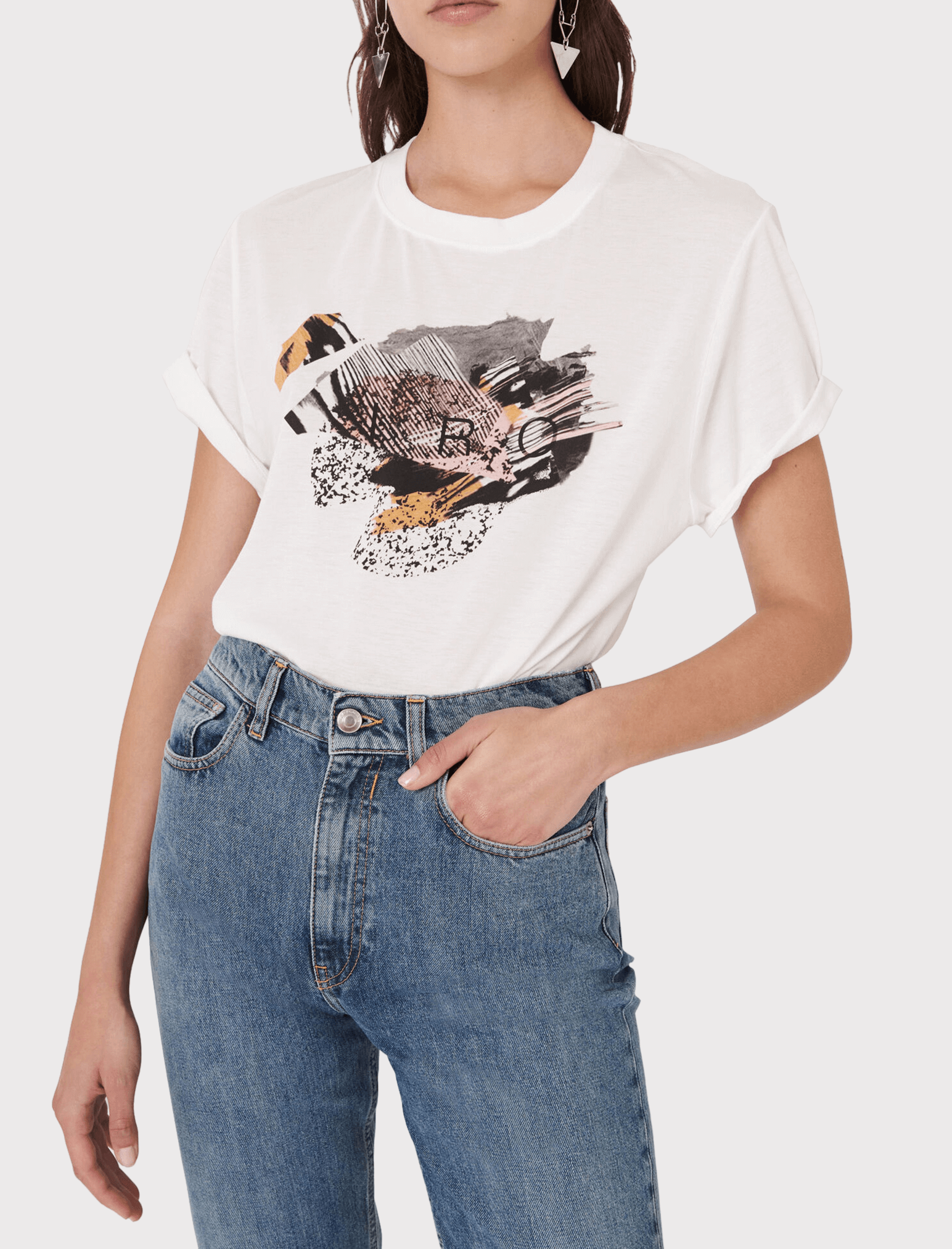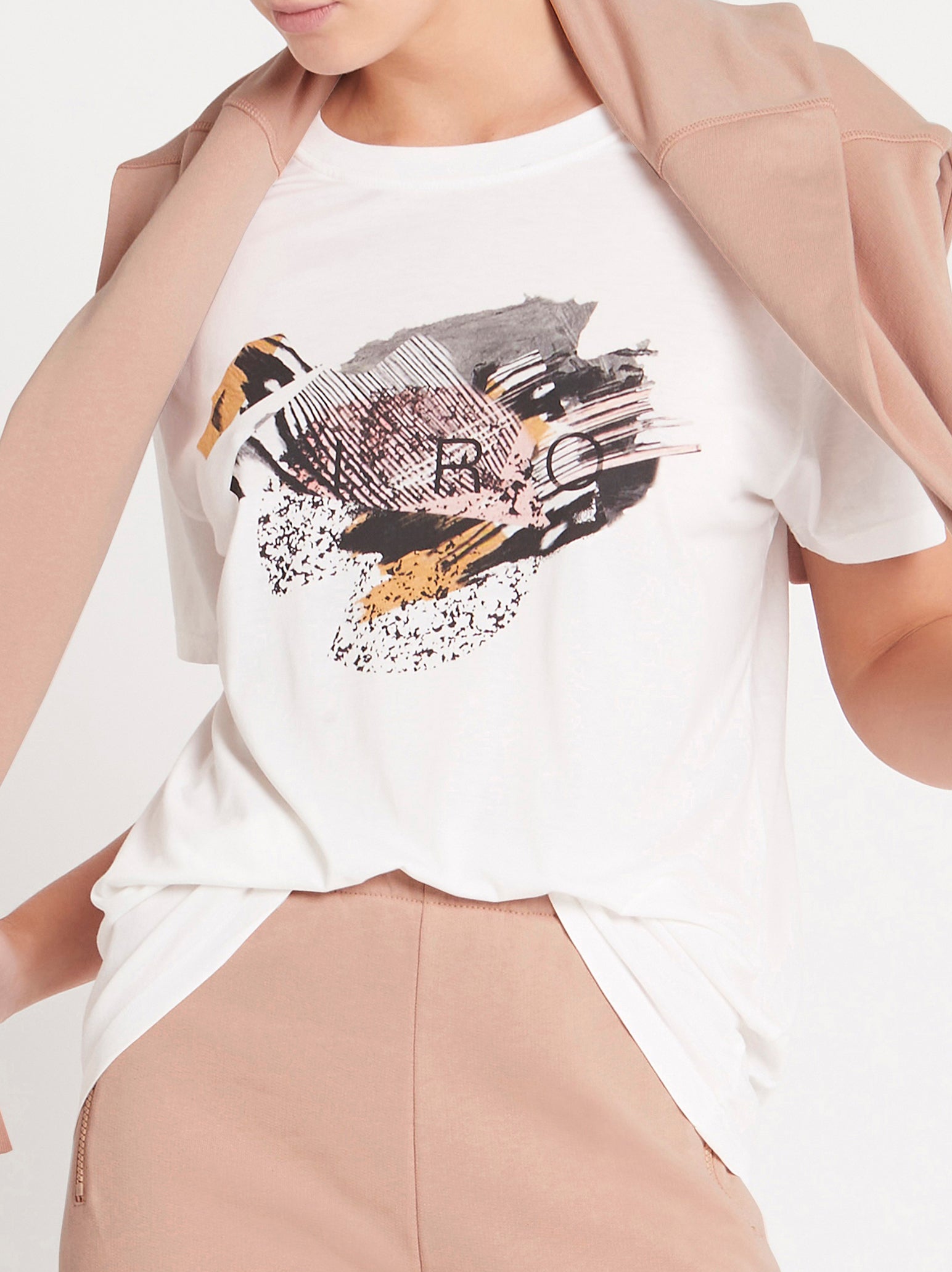 The IRO Croft T-Shirt in White is an everyday essential crewneck tee elevated by a IRO silkscreen. The designer logo print in pink and honey hues with a graphic black and white texture will pair perfectly with jeans and sneakers for a fun everyday look.