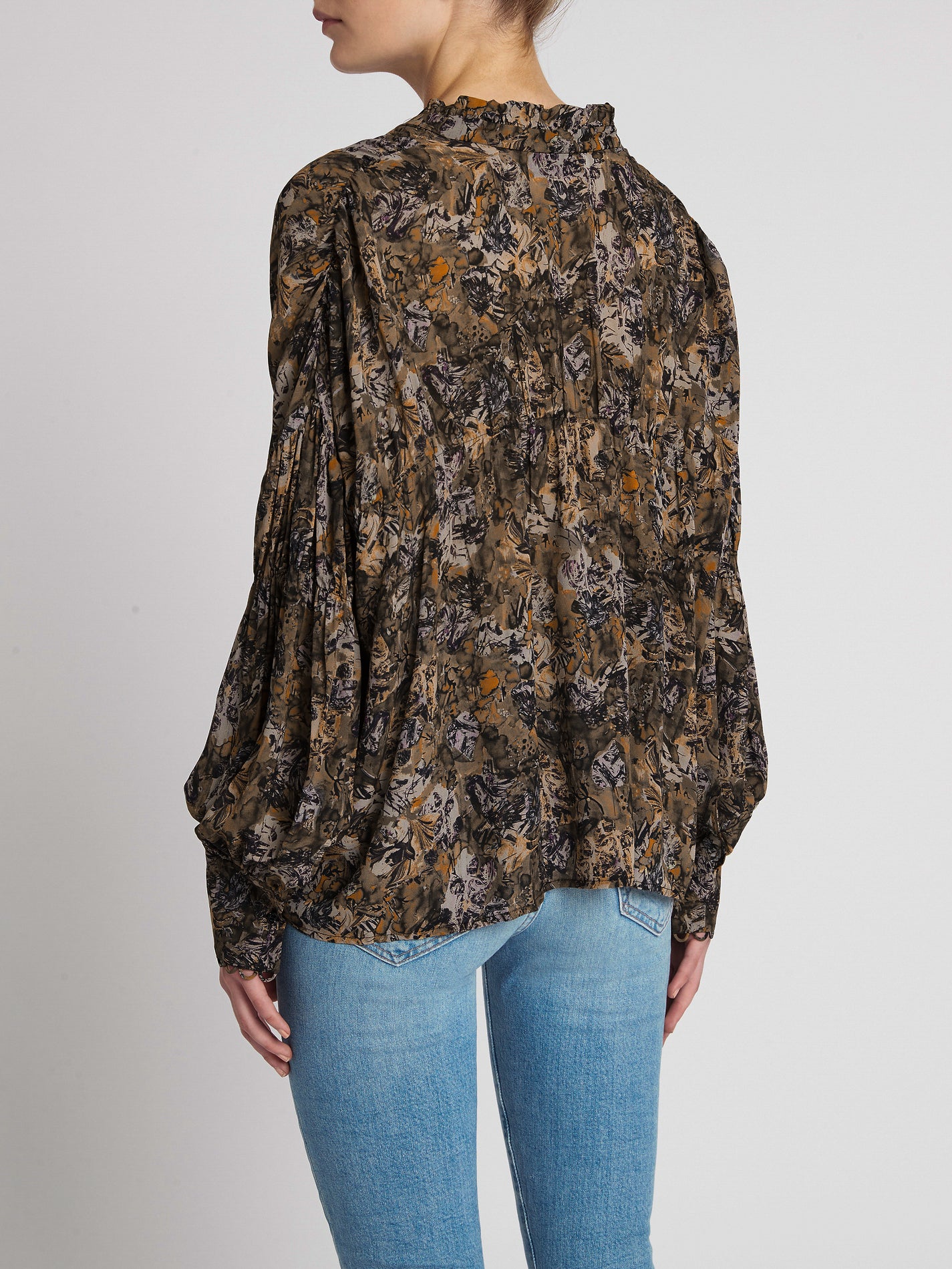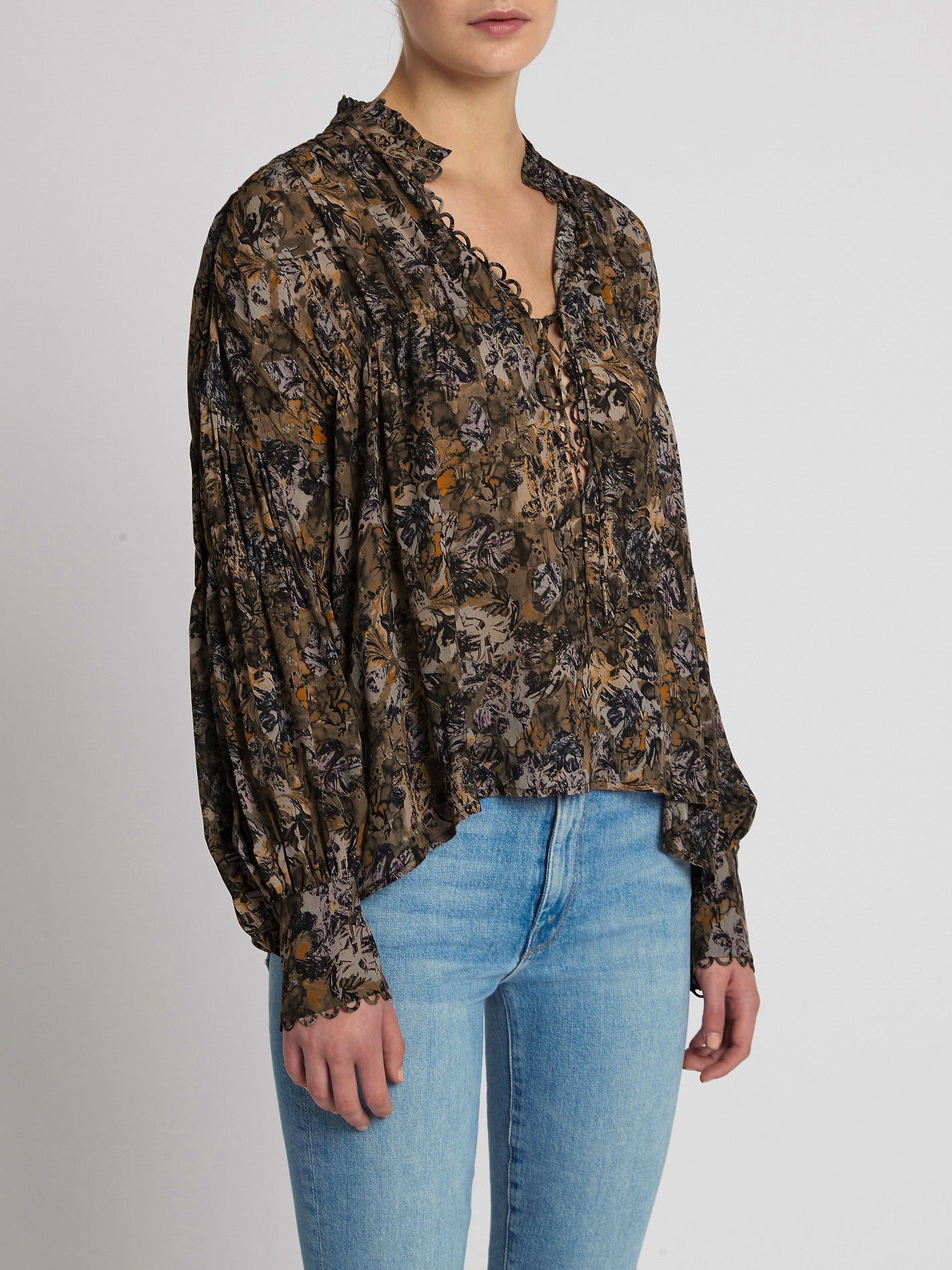 Channel your feminine Parisian side in the IRO Jorik Top in Khaki/Black. Constructed from ultra soft viscose, this flouncy floral long sleeved blouse features a stunning original IRO print with a deep V neckline, frilled hem and billowy sleeves. Team back with your favourite noir denim and heels for a look that will transition you from day to night.