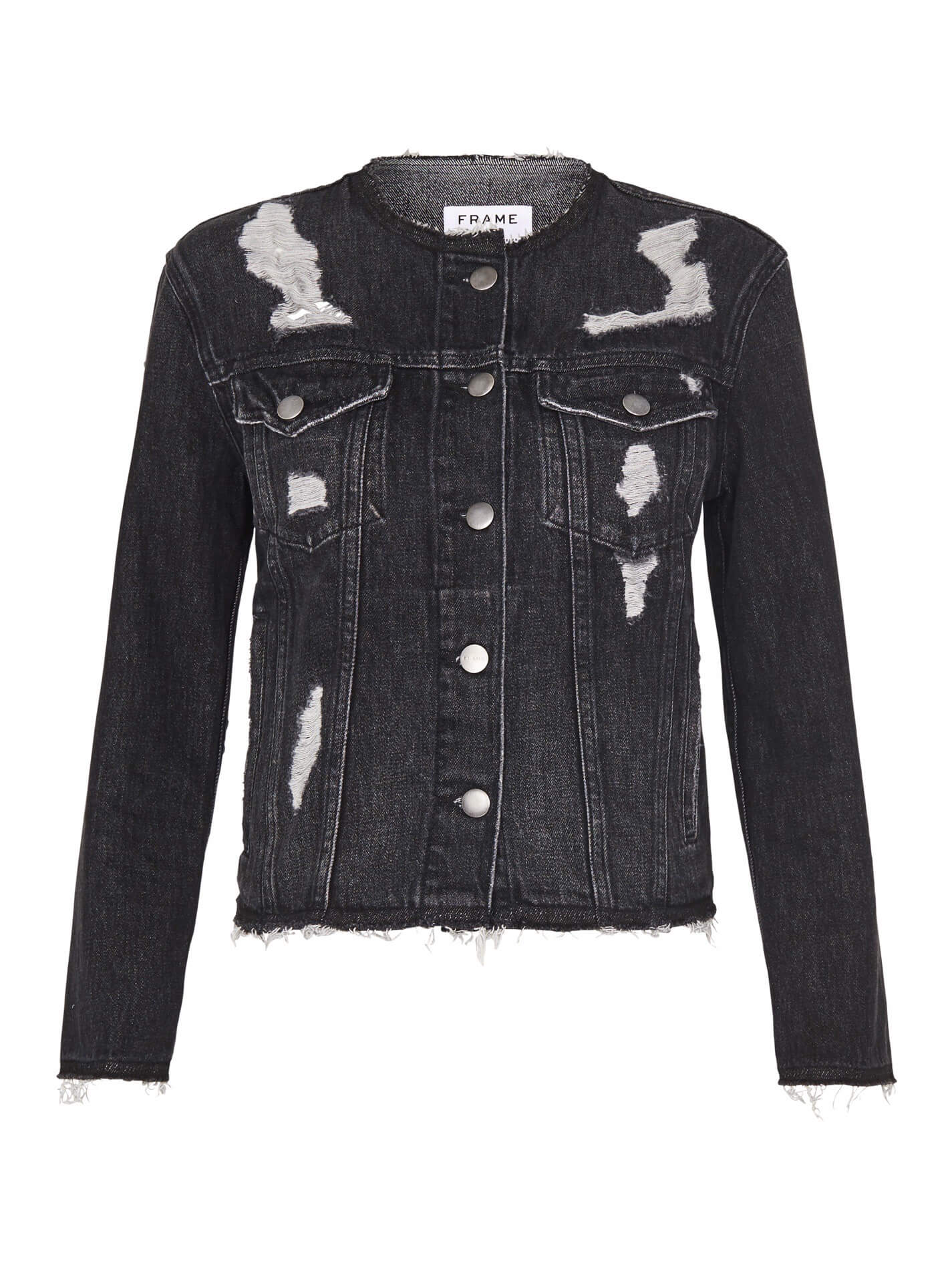 Paying homage to 80s denim style, the Frame Denim Rigid Re-Release Le Jacket in Gaven is a must have addition to your off duty wardrobe. Constructed from a rigid black denim this jacket has a structured silhouette featuring a collarless design, threadbare patches, raw, undone edges and is finished with silver hardware.