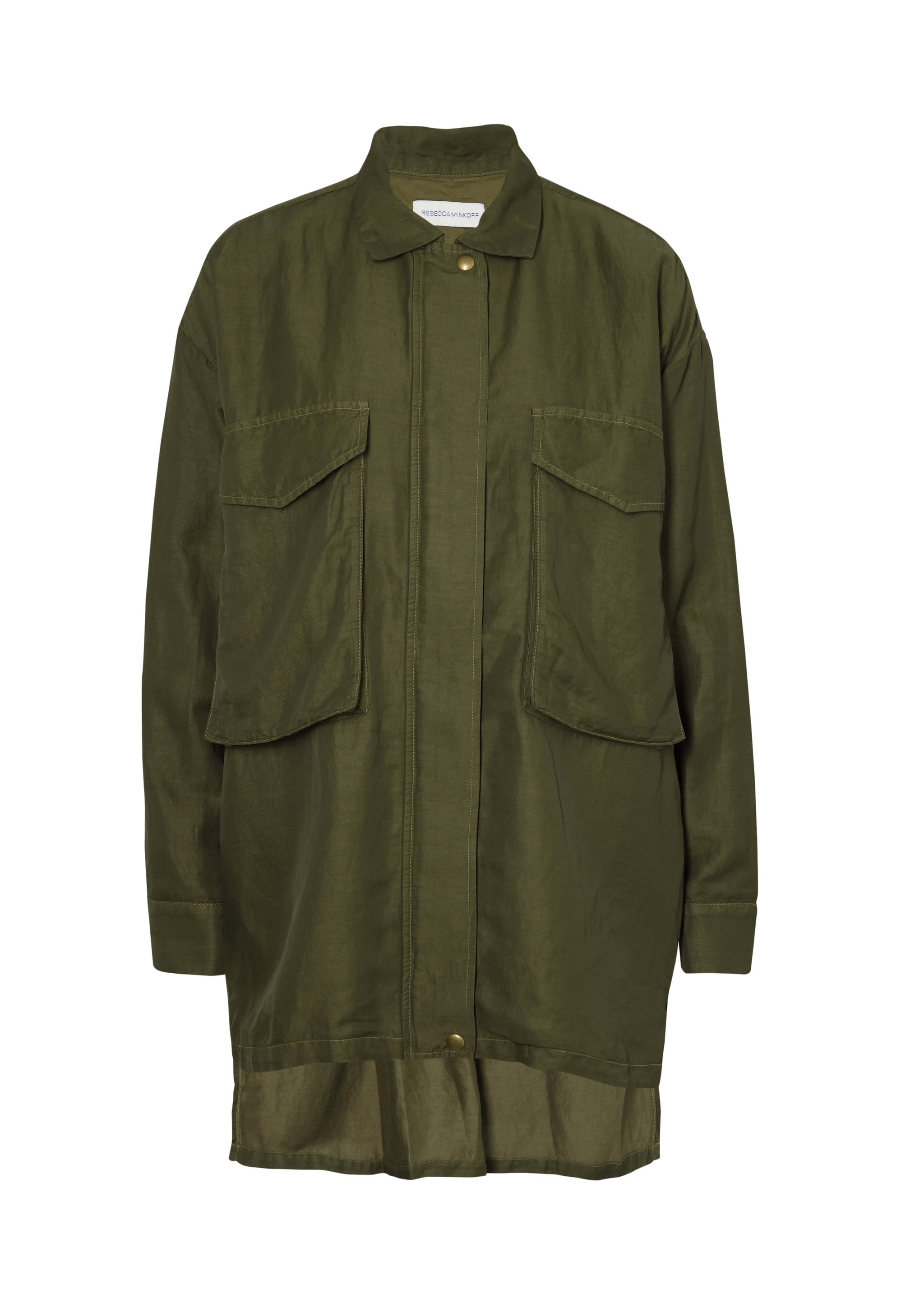 The Rebecca Minkoff Beckals Jacket in Military is made from 39% Cupro 34% Linen 27% Cotton