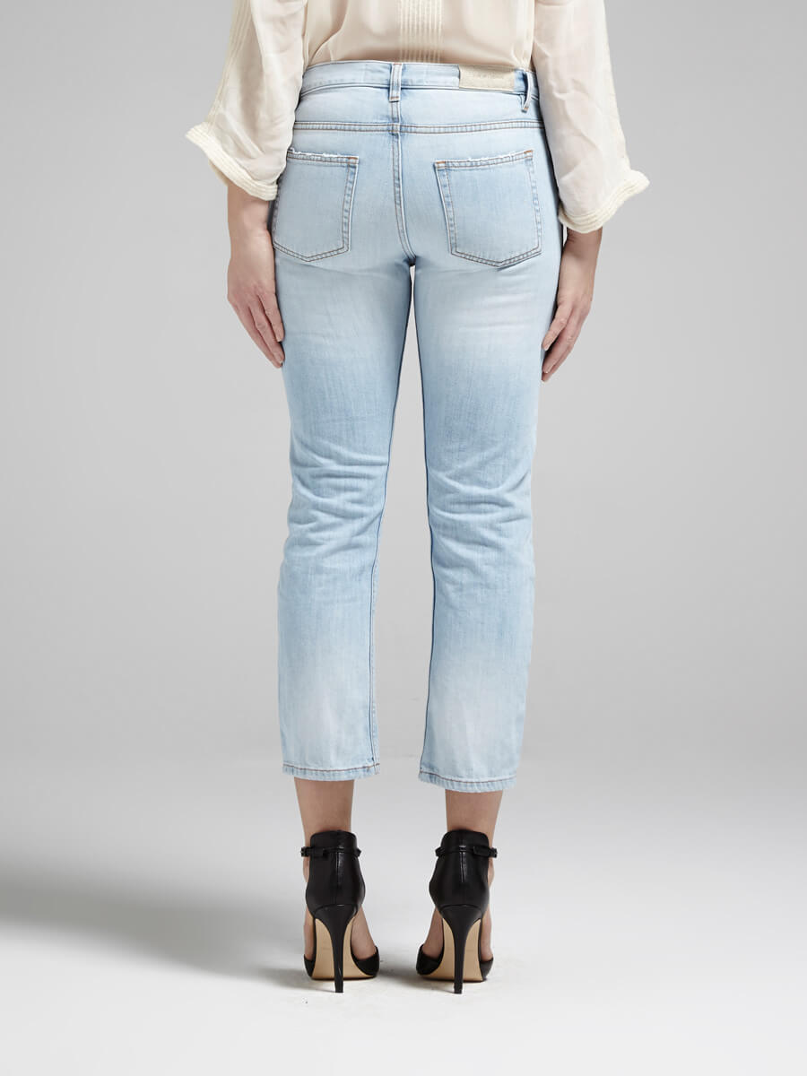 A killer crop boyfriend jean from IRO Jeans. The bleached out Nalyn Jean in BLEACHED USED have a low slung waist, 10 inch rise and twin pocket detailing at the back. The thigh wrinkle detail and cropped leg and are accented by silver hardware.