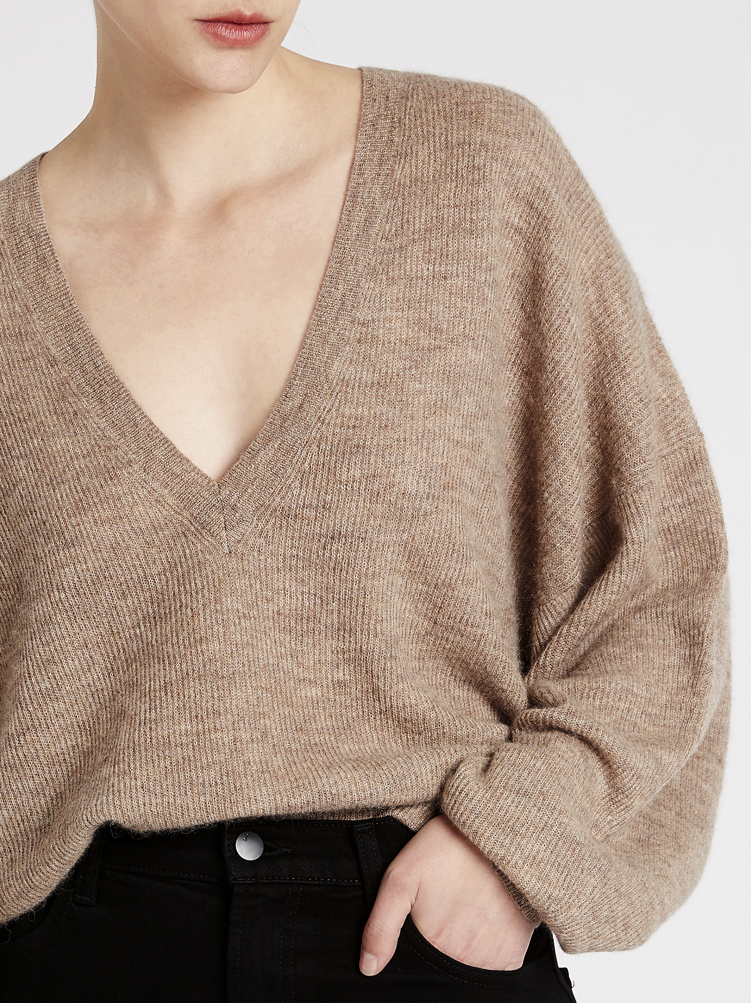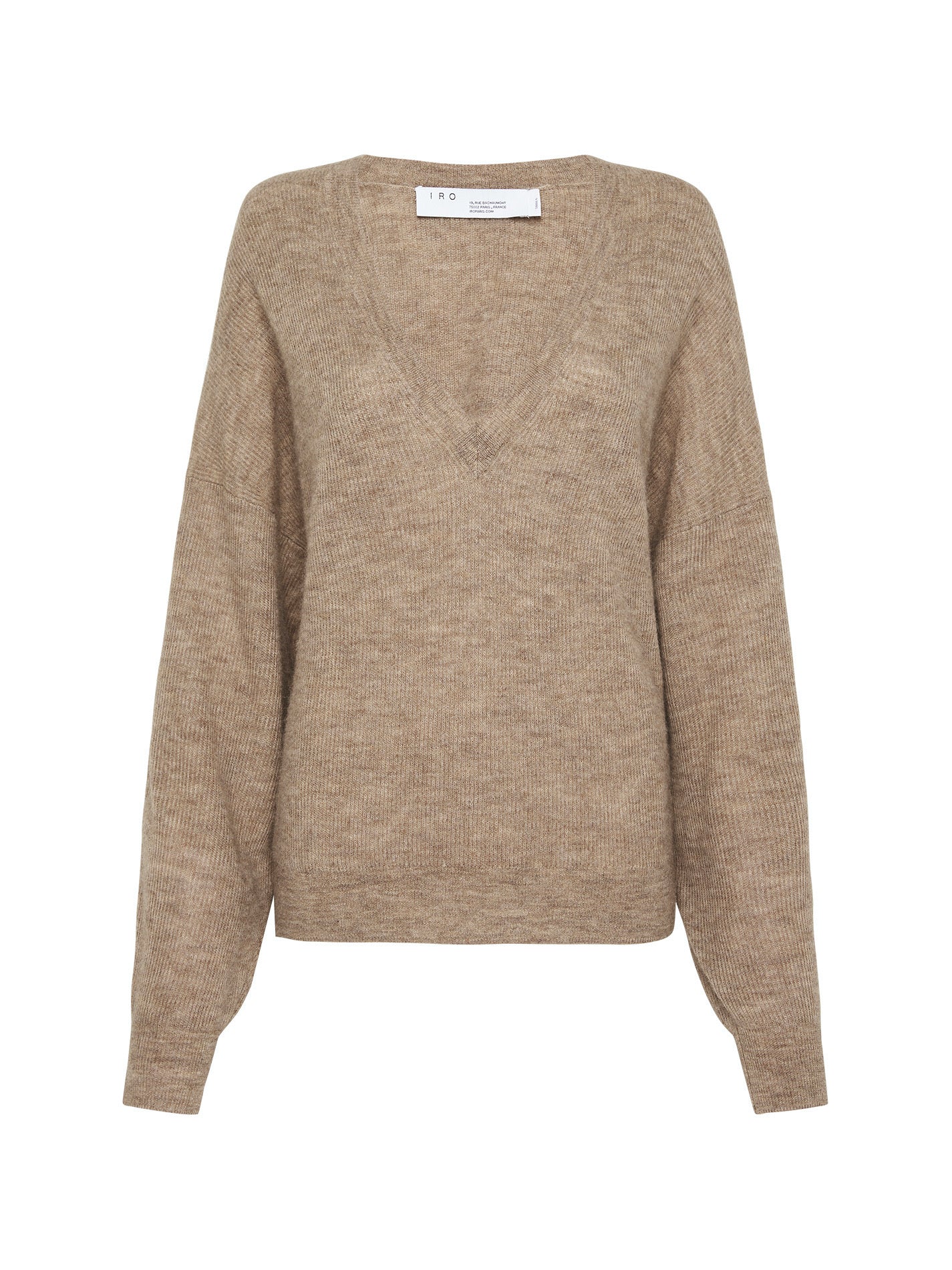 The IRO Electra Sweater in Mixed Taupe is made from 49% Alpaca, 35% Nylon, 19% Merino Wool