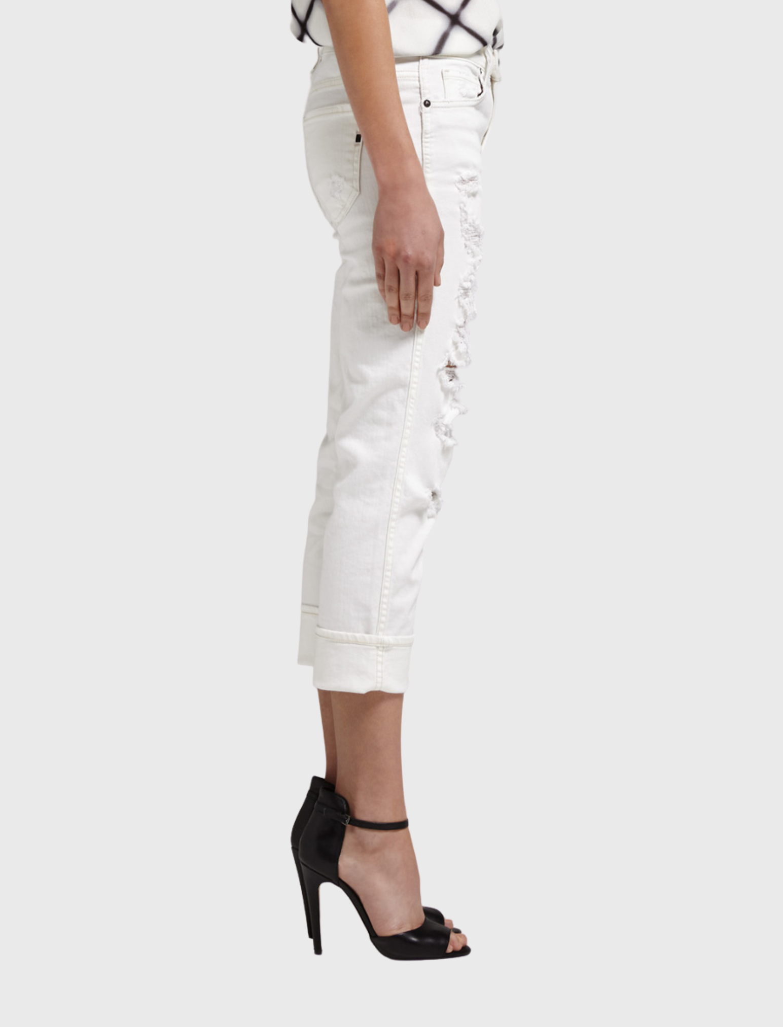 These Genetic Denim Birkin High Rise Straight Crop Jean are a straight leg cropped style jeans. They have a high rise of 9.5 inches and feature matte black hardware, destruction along the thigh and calf, and rip detail on the back right pocket.