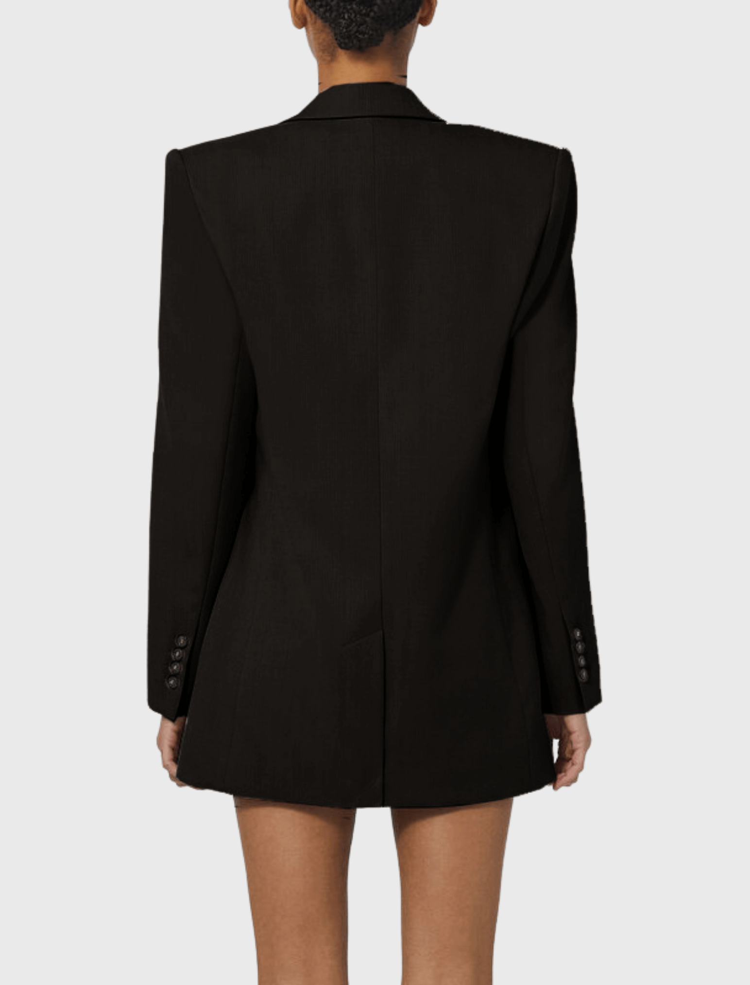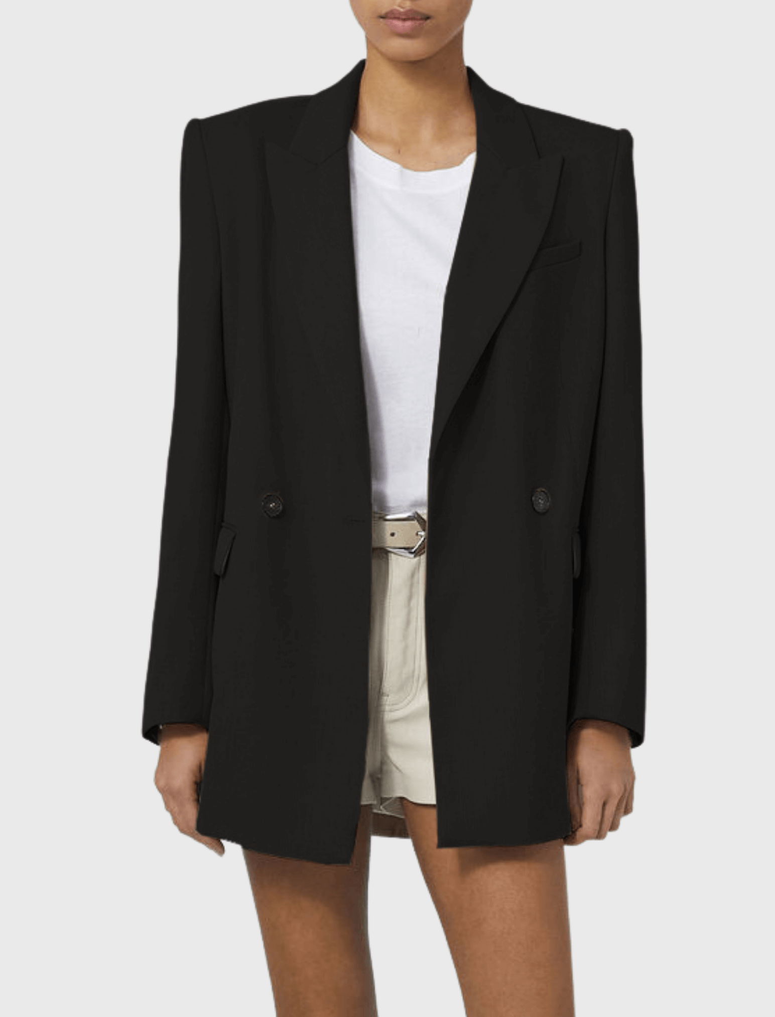 A classic Black oversized blazer that everyone should have in their wardrobe. The Myvi Jacket from IRO is the perfect double breasted Blazer in the most sort out jacket silhouette of the season. A stately wide collared lapel with twin front buttons, it imbues a borrowed from the boys vibe while retaining an air of sophistication making it a versatile for both work and play.