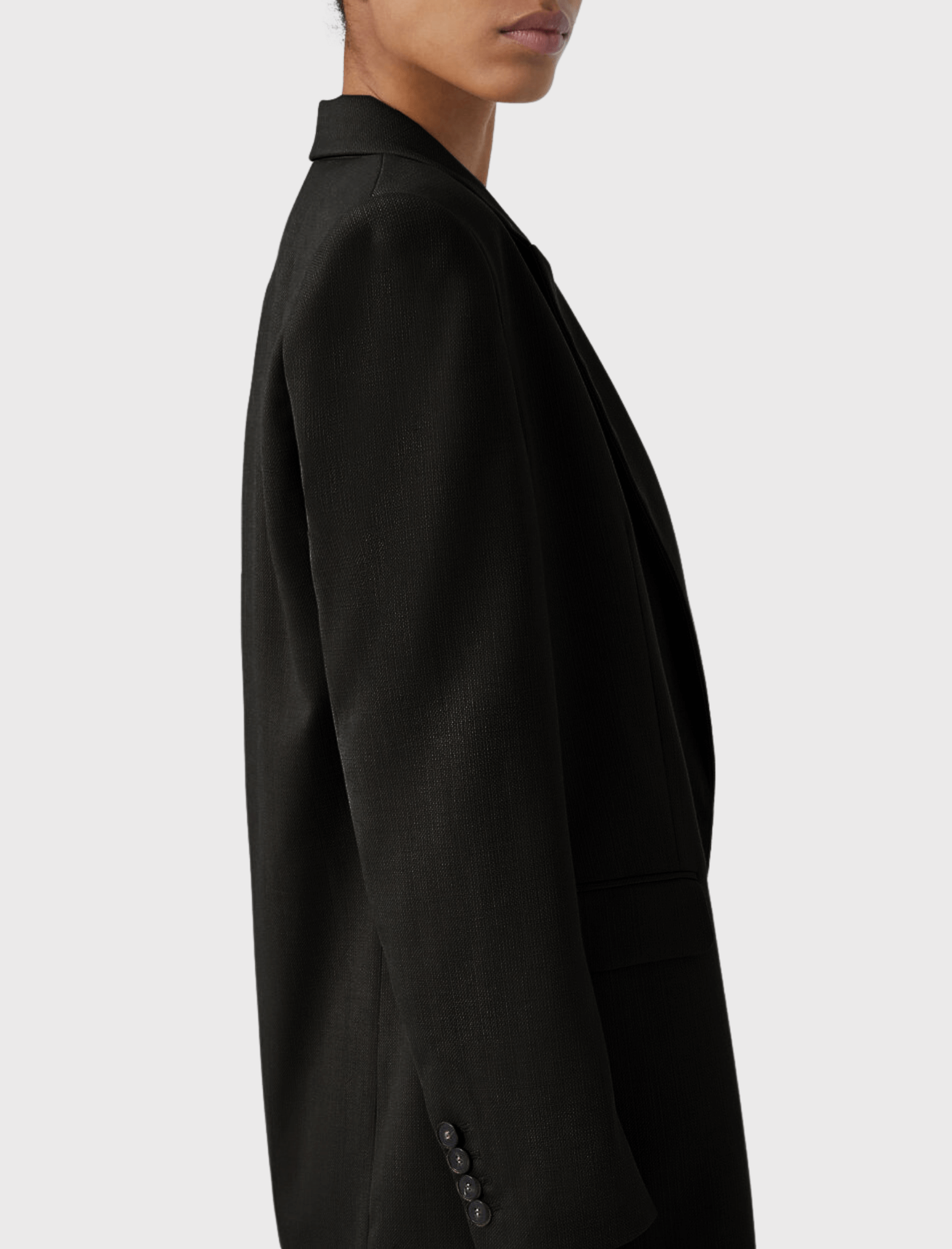 The IRO Myvi Jacket in Black is made from 66% Polyester, 32% Rayon & 2% Spandex, Lining: 51% Cotton & 49% Viscose