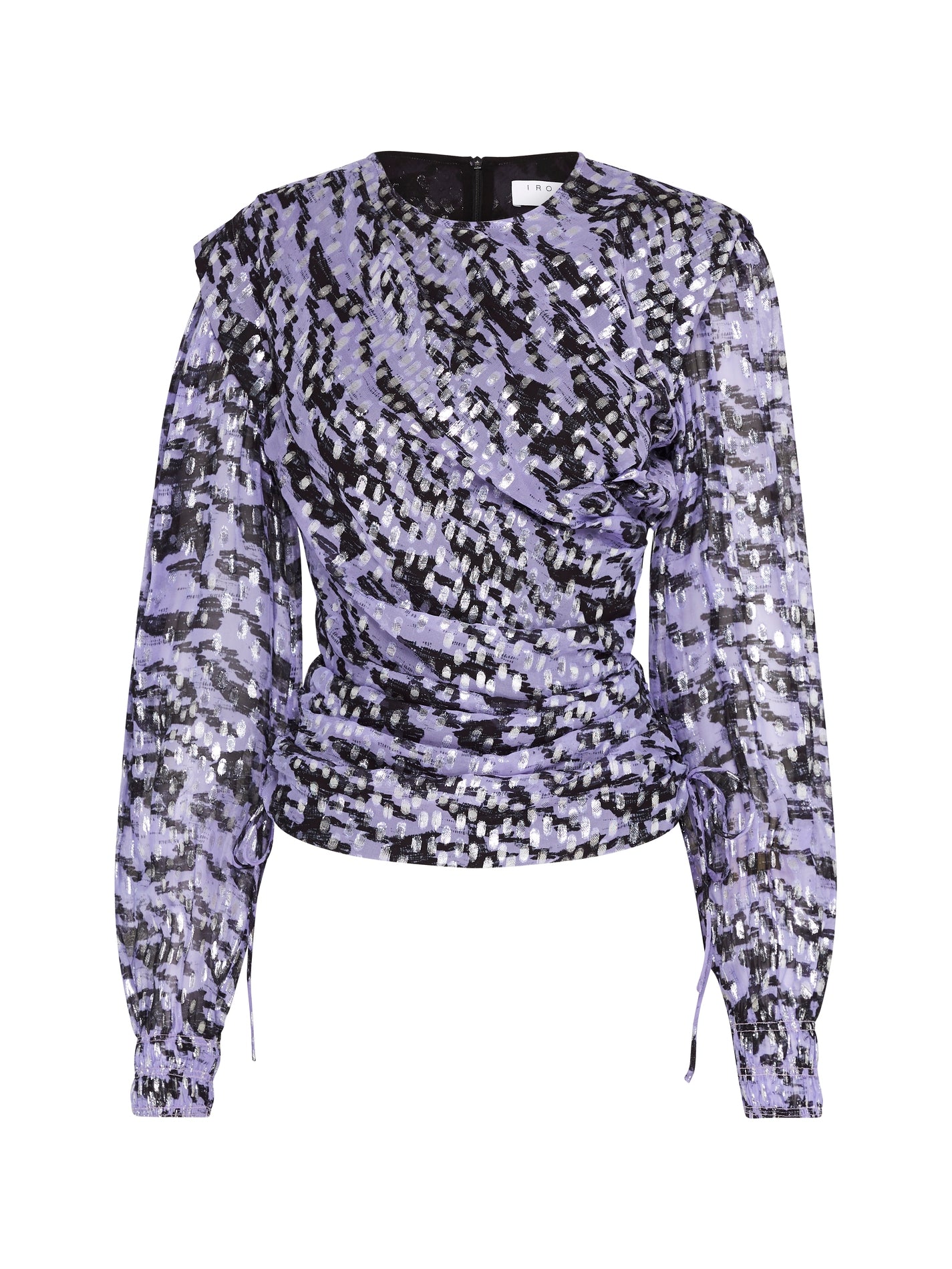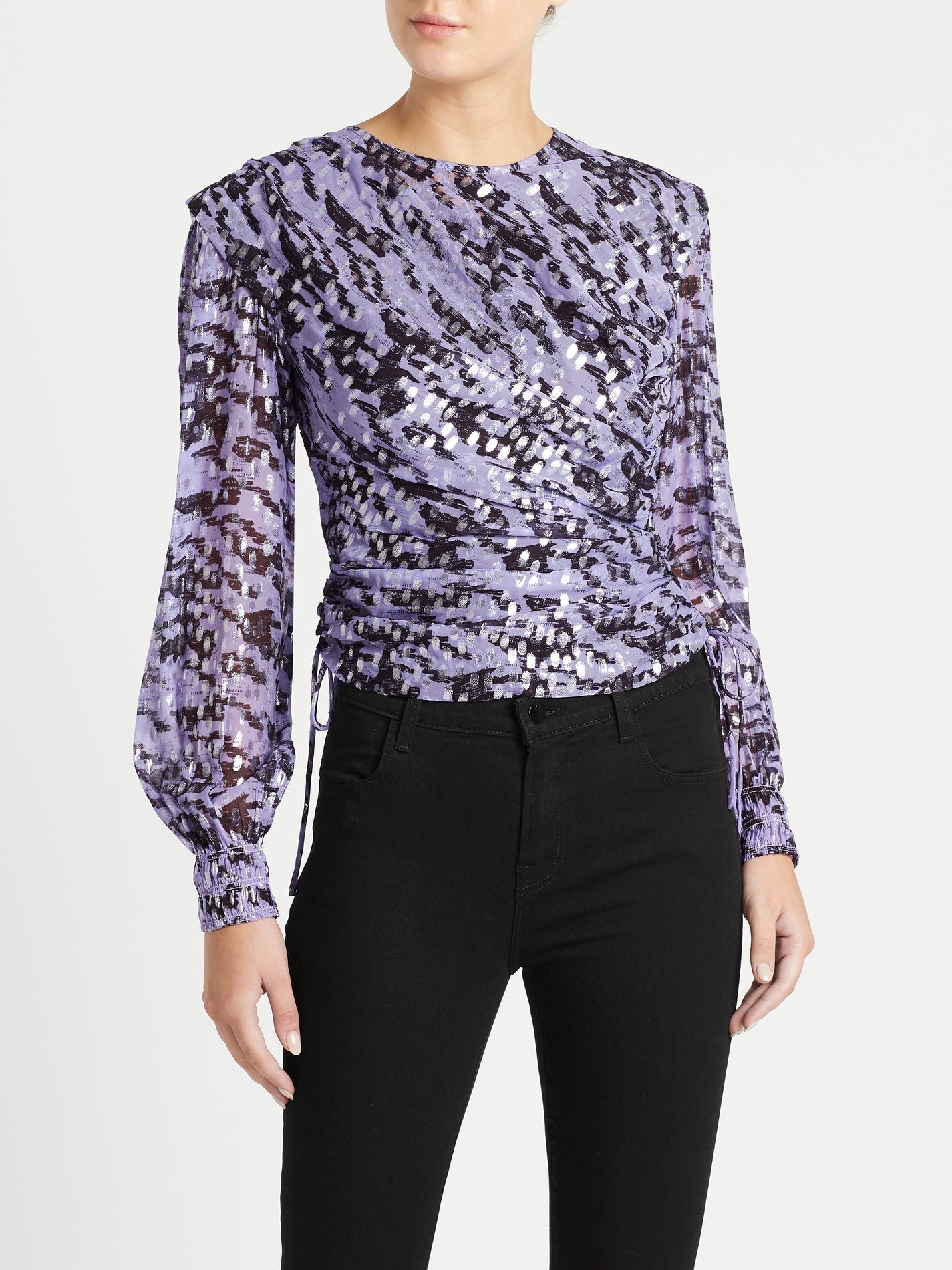 The IRO Kleok Top in Lilas Silver is the ultimate party piece. This blouse features ruched tie up sides, long sleeves with shirring details on the cuffs and external shoulder pads. The print is an artistic brushed stroke inspired print with metallic accents, the top fits close to the body at the waist and opens up around the neck for a 80's inspired silhouette.