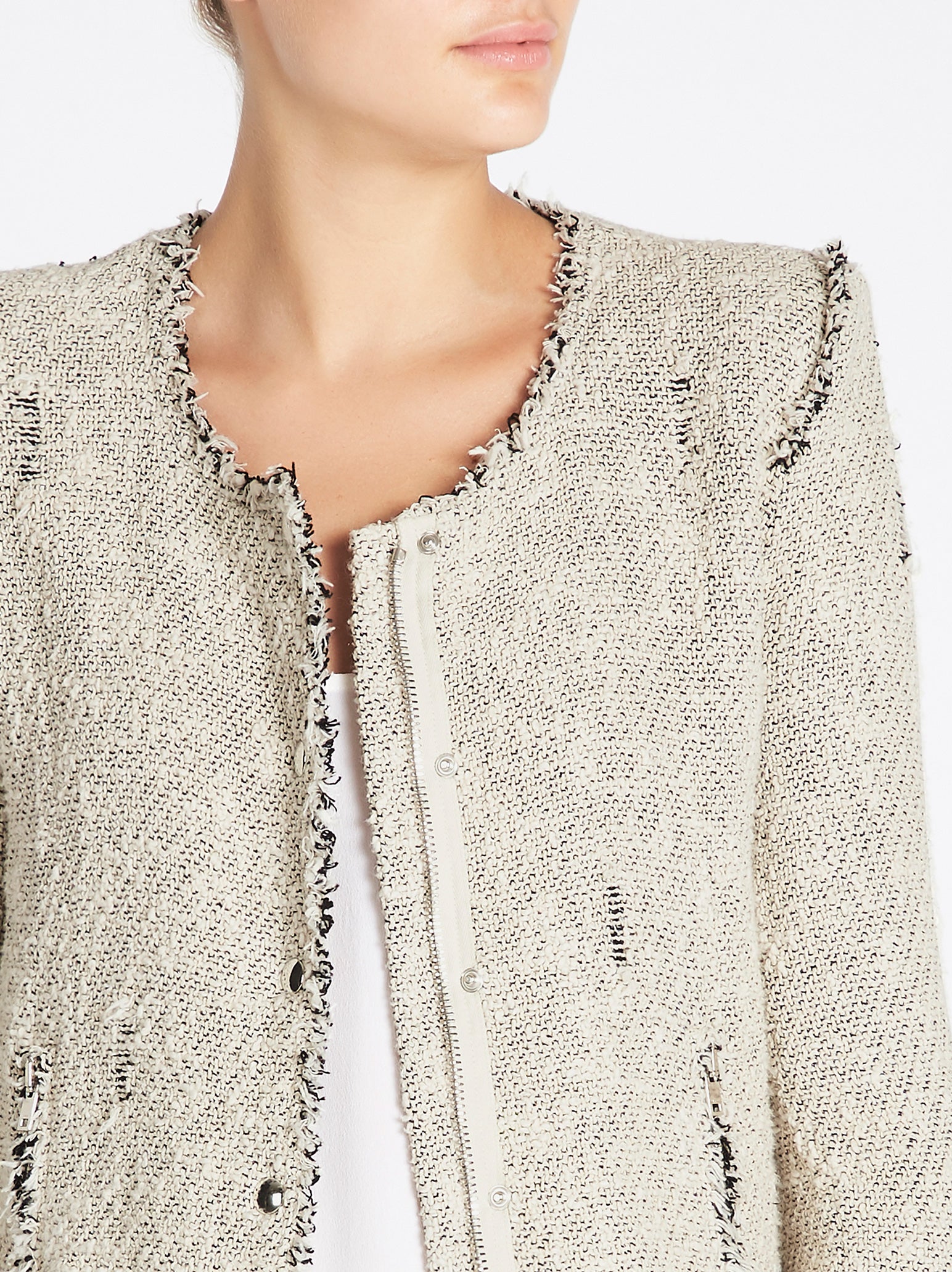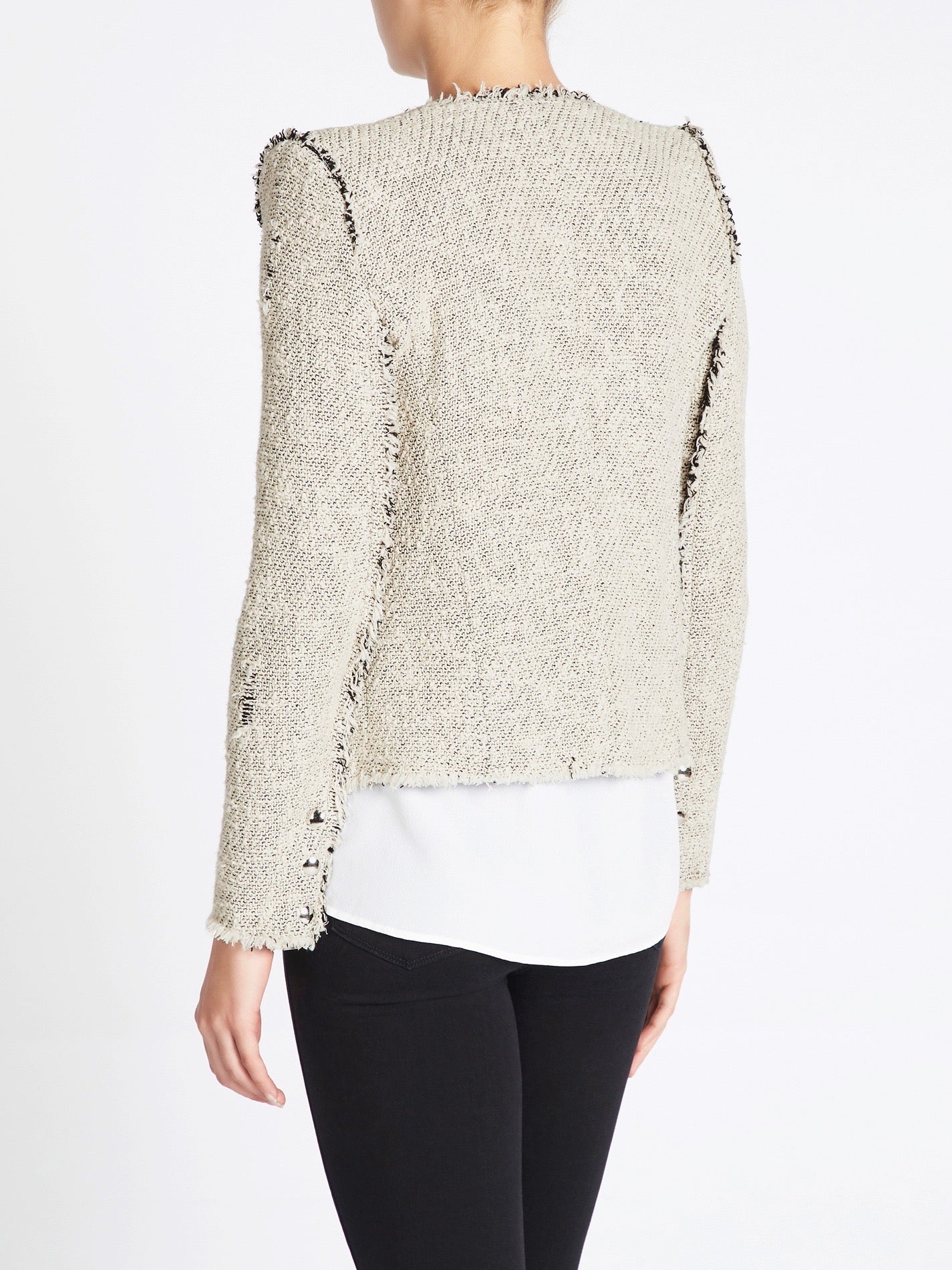 The sophisticated Agnette button down jacket from IRO is made from white and black distressed weave. This coveted style has frayed edges and seams. Featuring a hidden zip and stud closure, shredded accents and shoulder padding, this collarless jacket is a must have wardrobe staple.