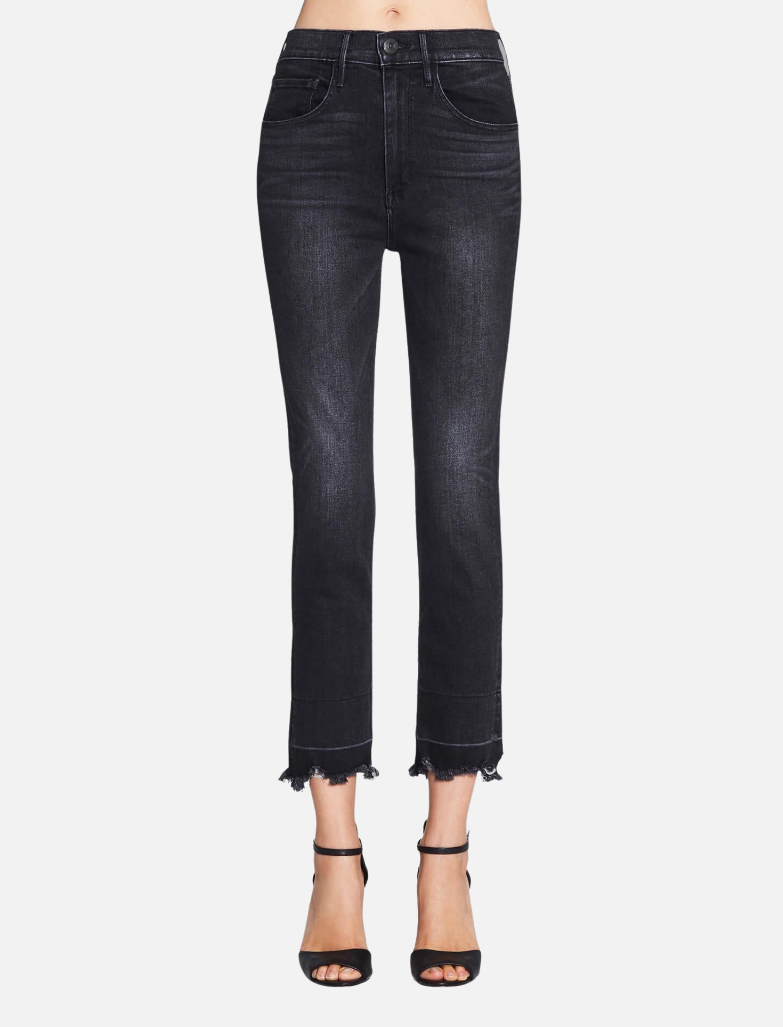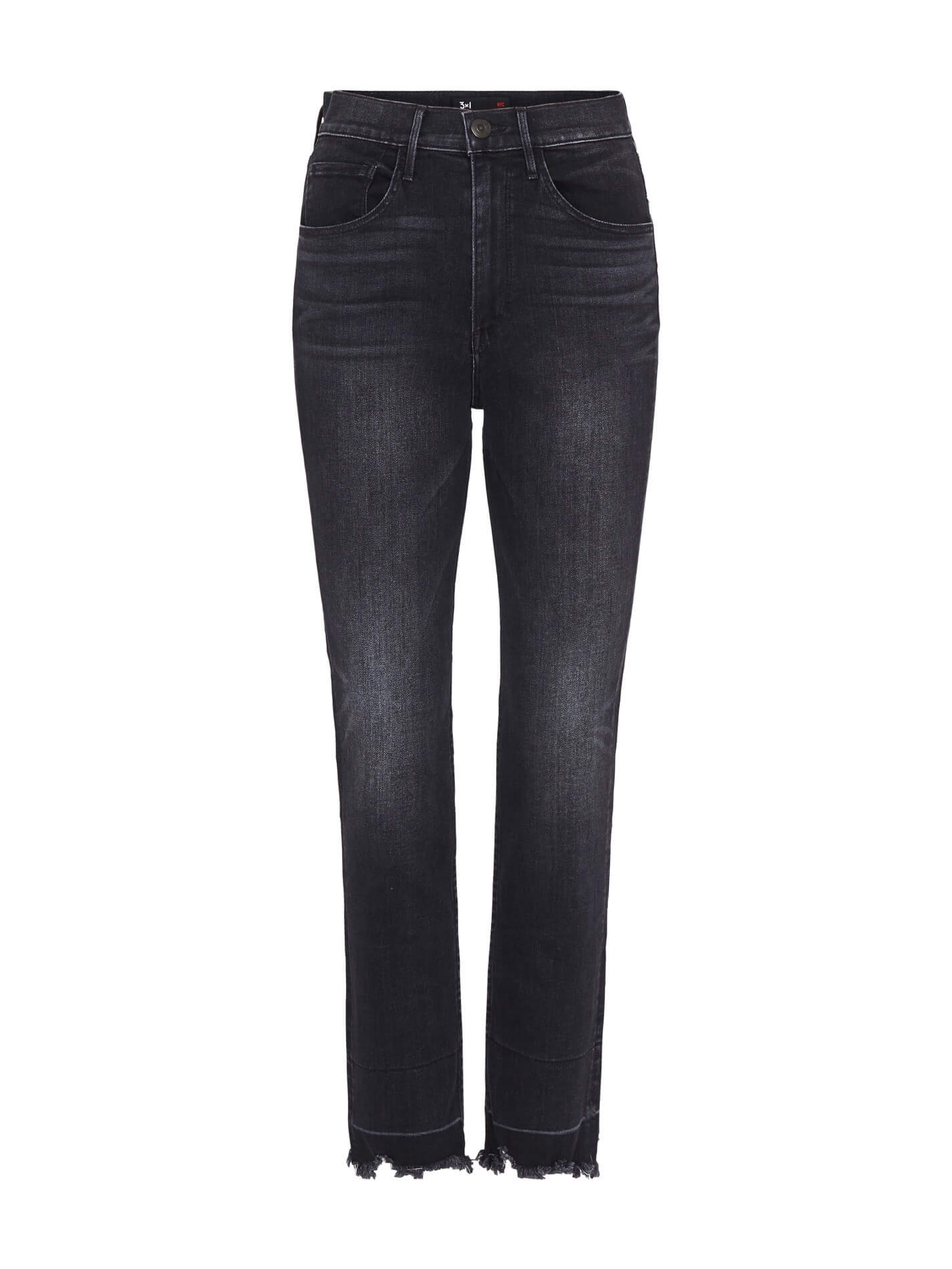 The Shelter Straight Jean from 3x1 are a cropped style in a dark, distressed denim. Styled with a high rise and a straight leg, these jeans have an undone frayed hem.