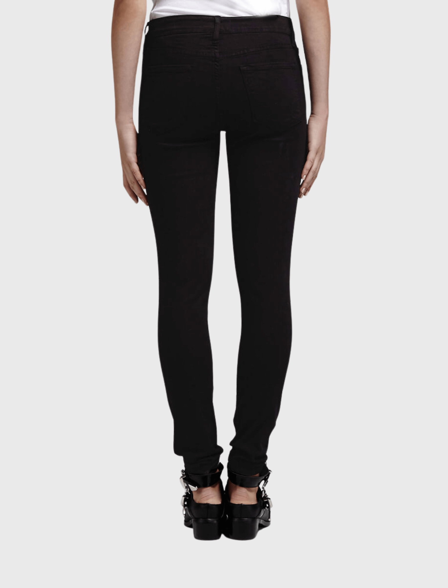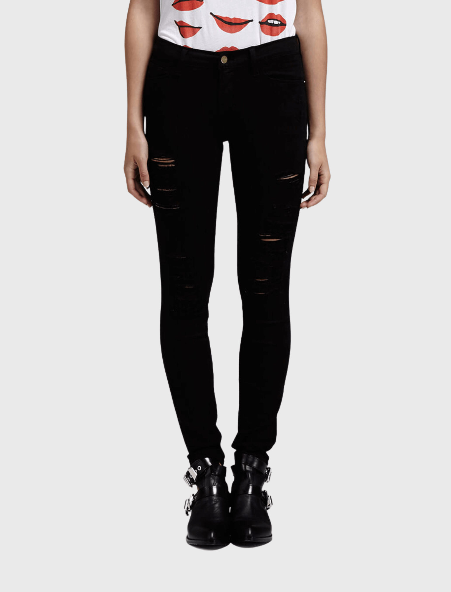 These black Le Colour ripped jeans from frame denim are a skinny leg with a 8.5 inch low rise. Based on the best selling Le Skinny De Jeanne shape these jeans are adorned with gold hardware and feature rips on the knees, thighs and calves.