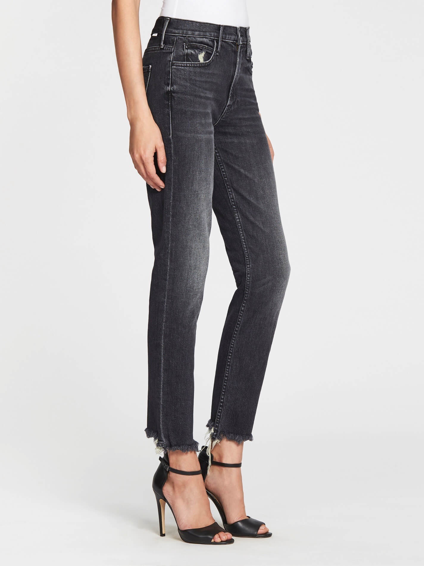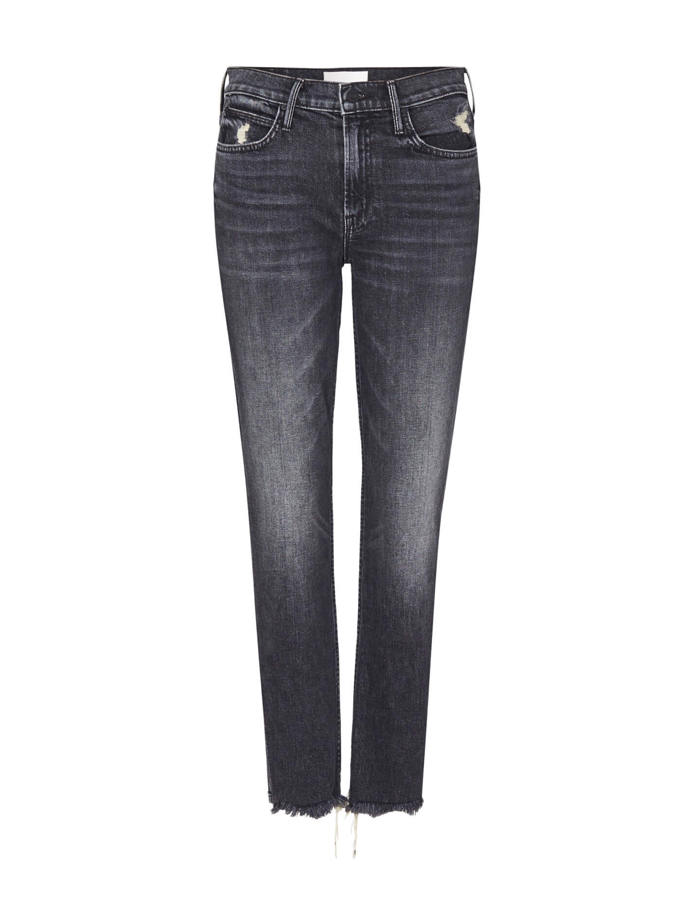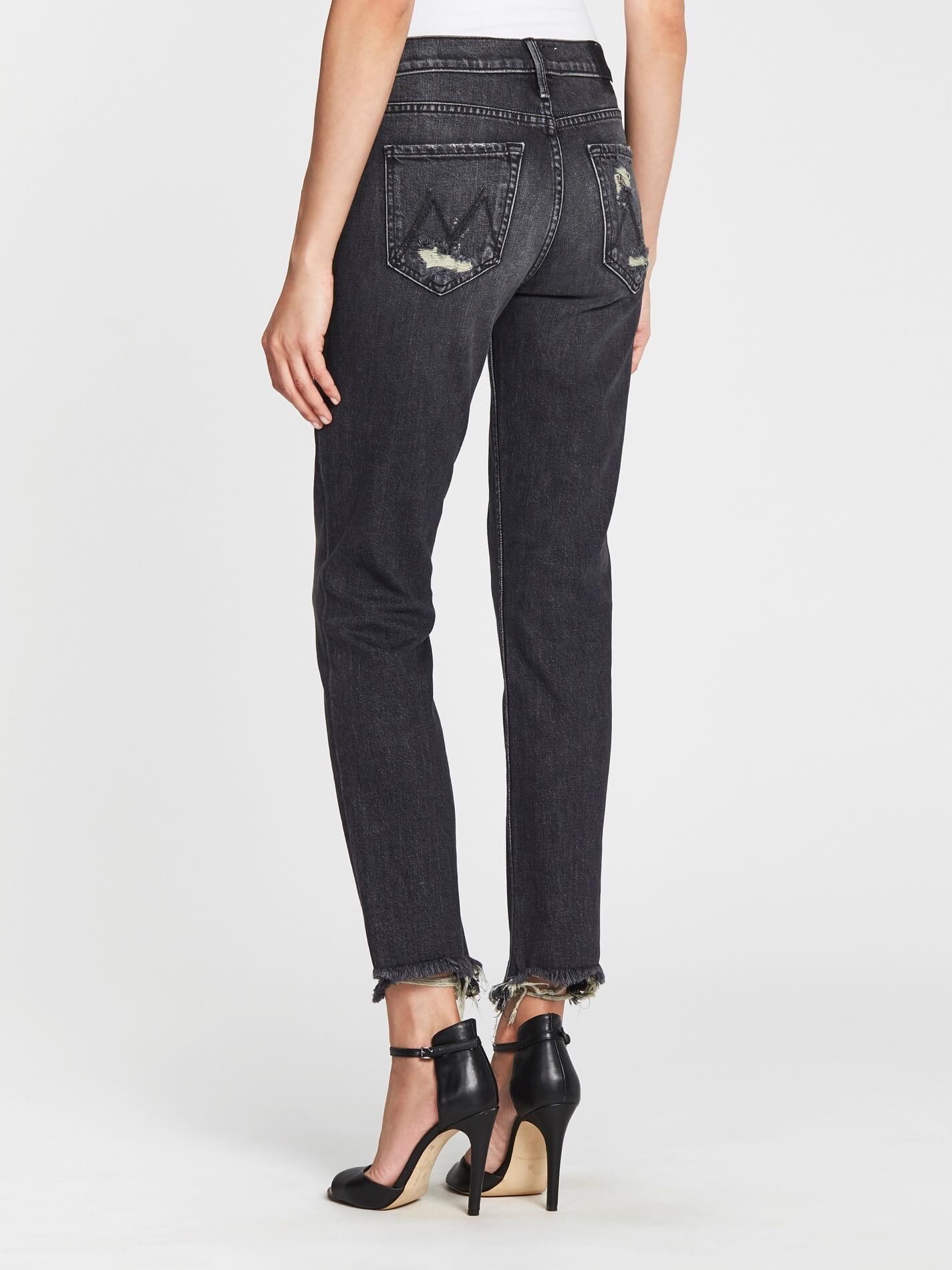 The Mother Denim Flirt Chew Jean is a straight leg, mid rise style jean and is constructed here in the antique black wash Of Cat and Kings. From the MOTHER Superior Collection these jeans feature a chewed up raw style hem, ripped pocket details and are finished with a single button zip fly closure.